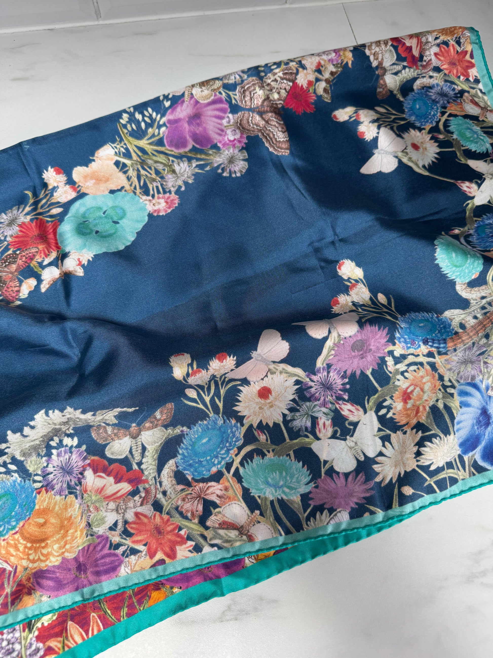 The colourway is a beautiful turquoise floral. It’s a great neck tie, head scarf or bag accessory.It’s fabulous and fun!! The print is on one side only (so colours are naturally more intense on the front, than the rear).No pulls, ladders or marks, the fabric is perfect in every way.