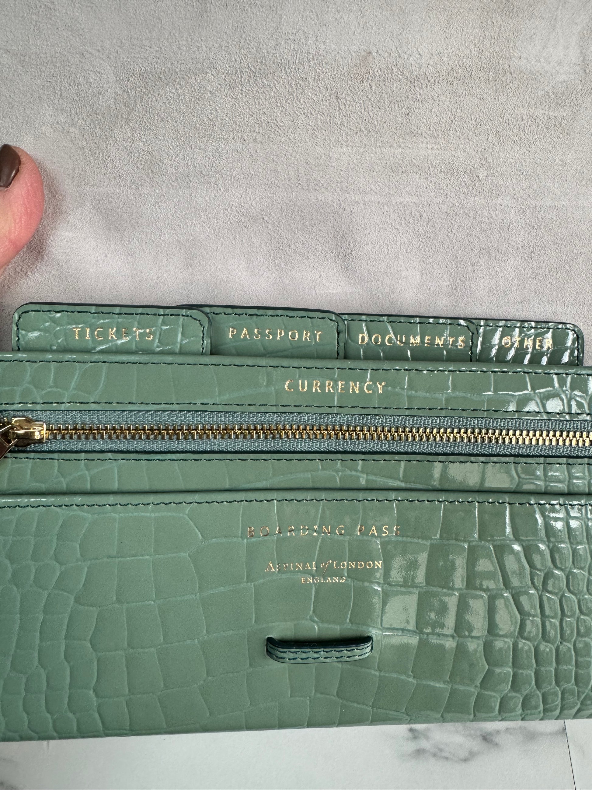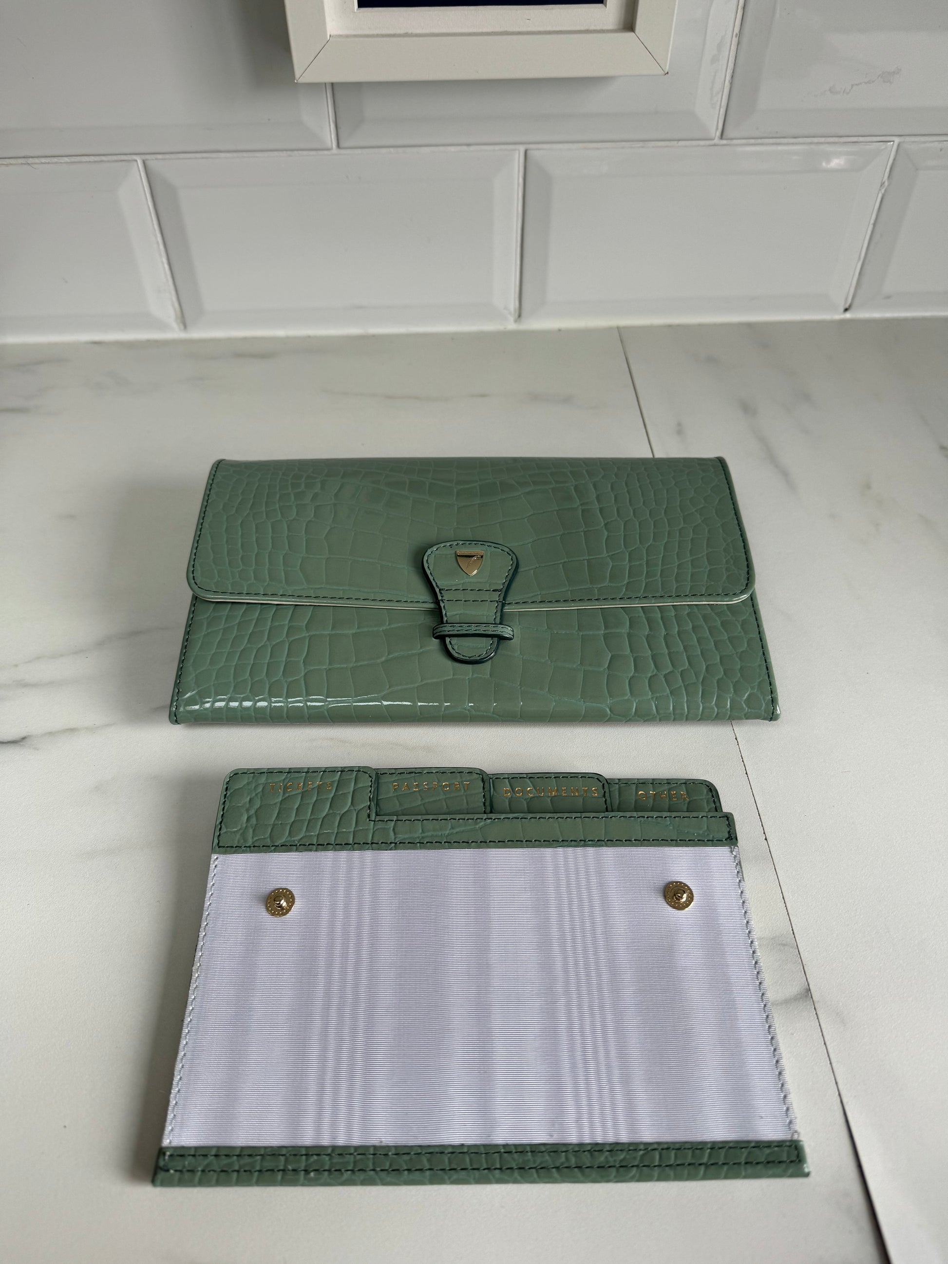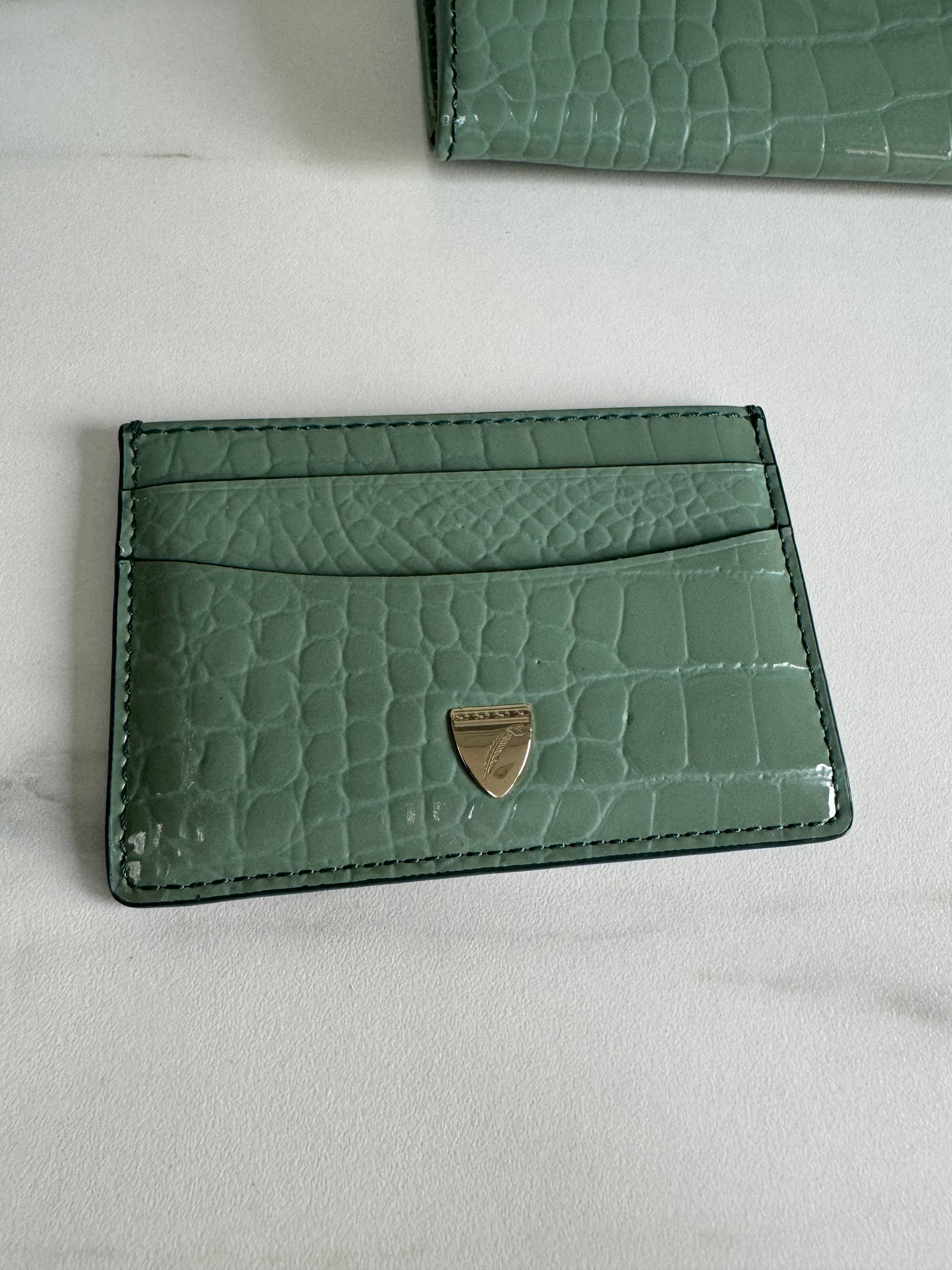 This is a lovely Travel wallet from Aspinal of London in light green croc embossed leather with gold tone hardware.