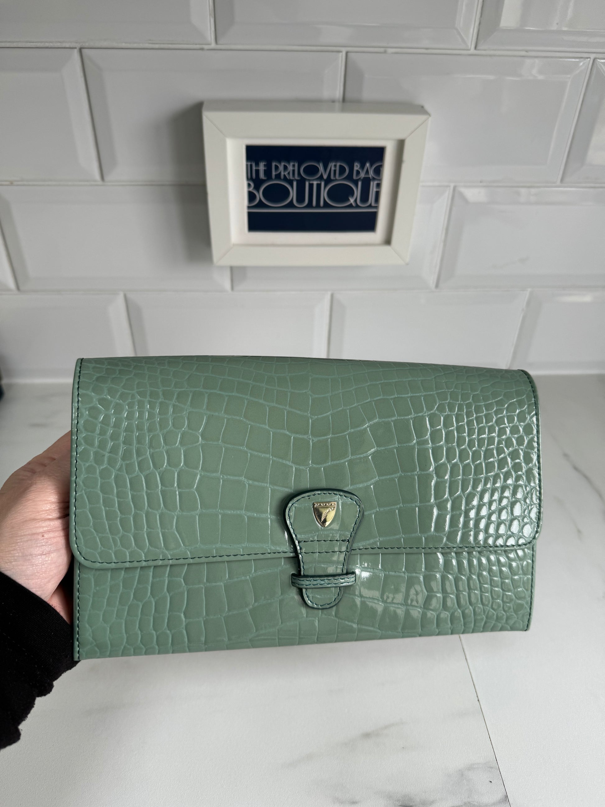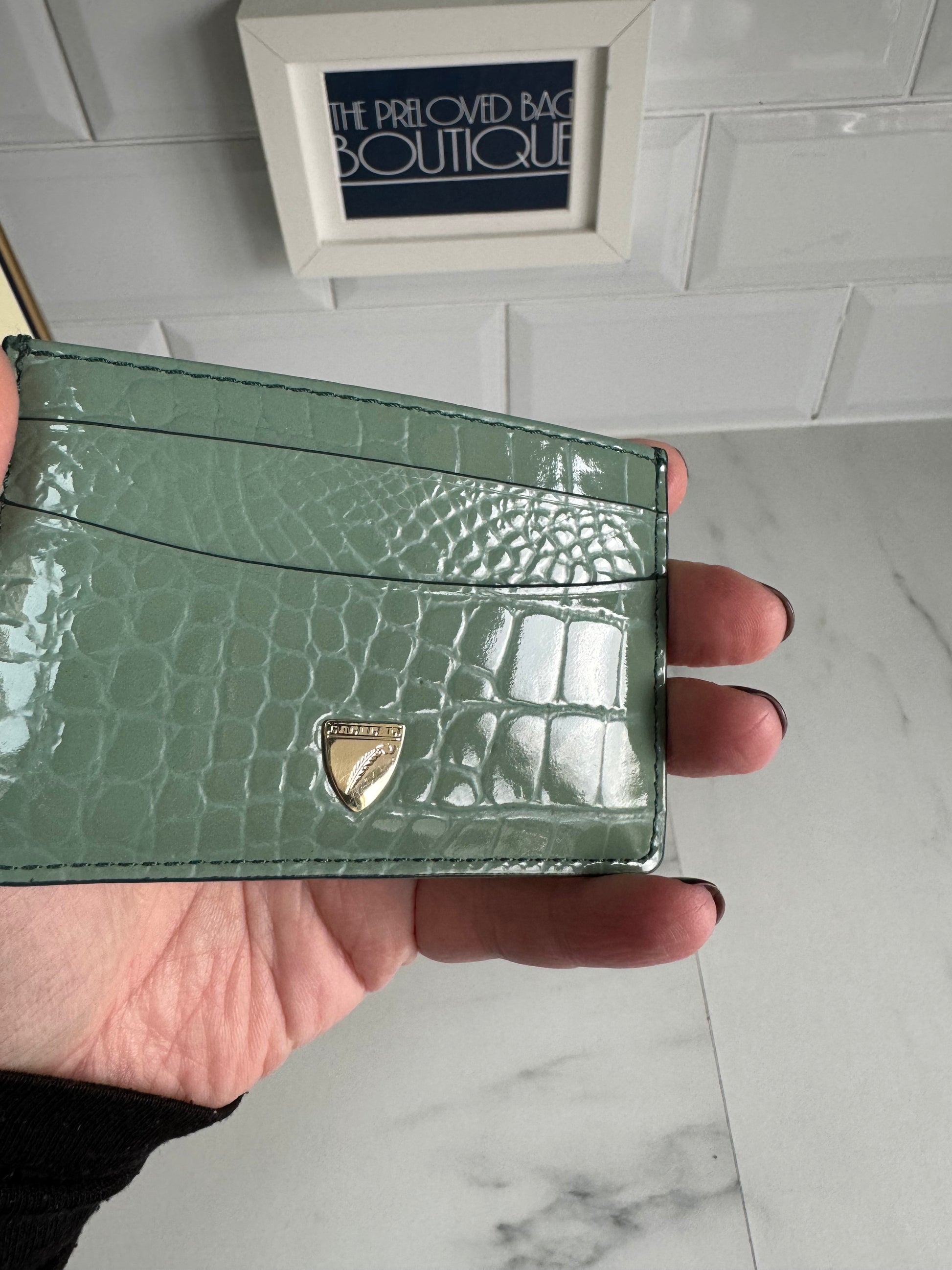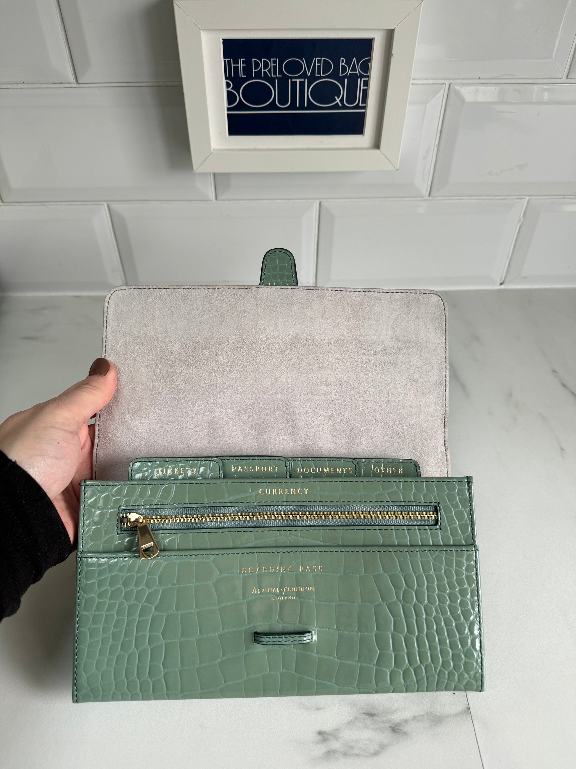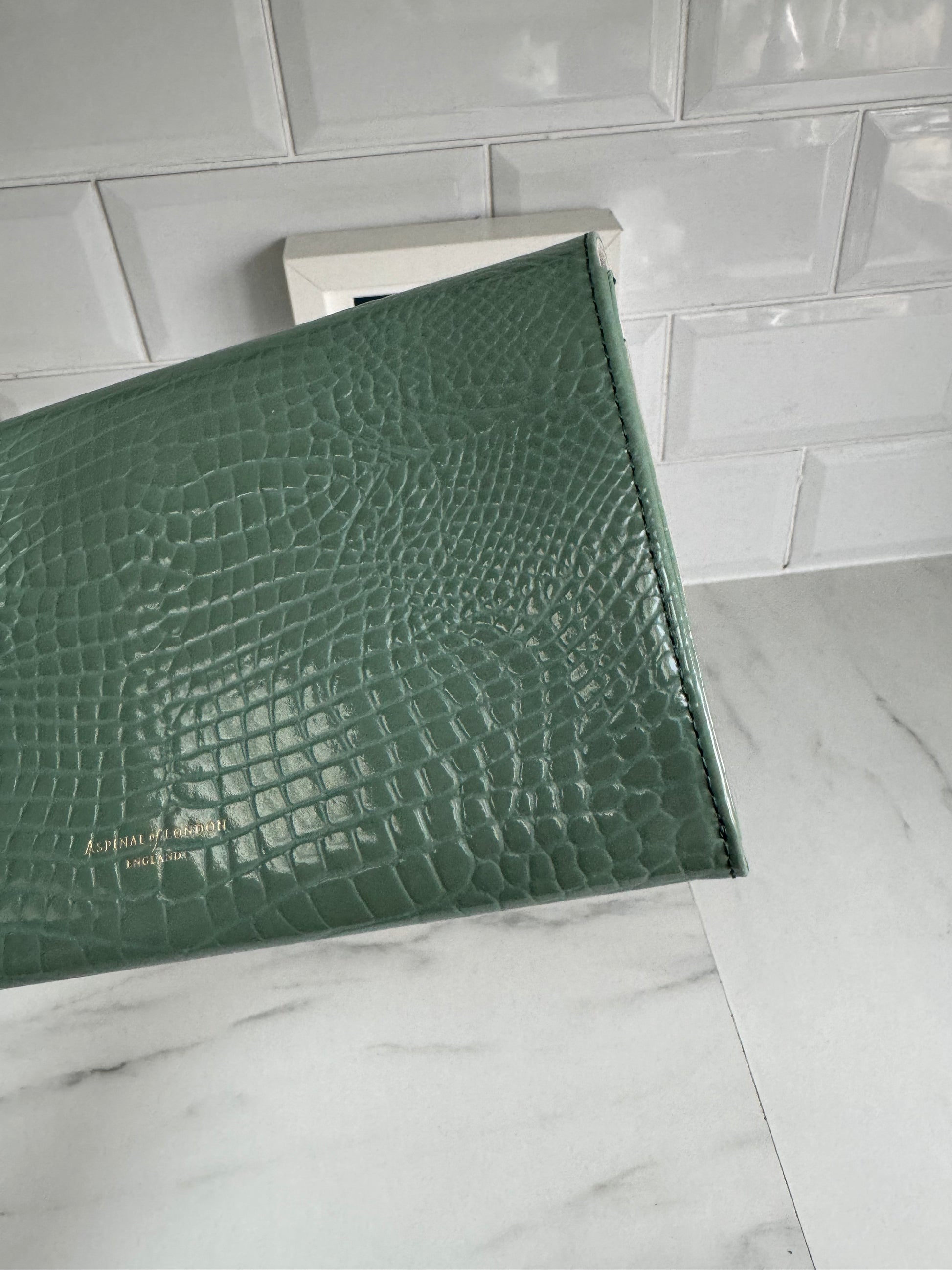 This is a lovely Travel wallet from Aspinal of London in light green croc embossed leather with gold tone hardware.
