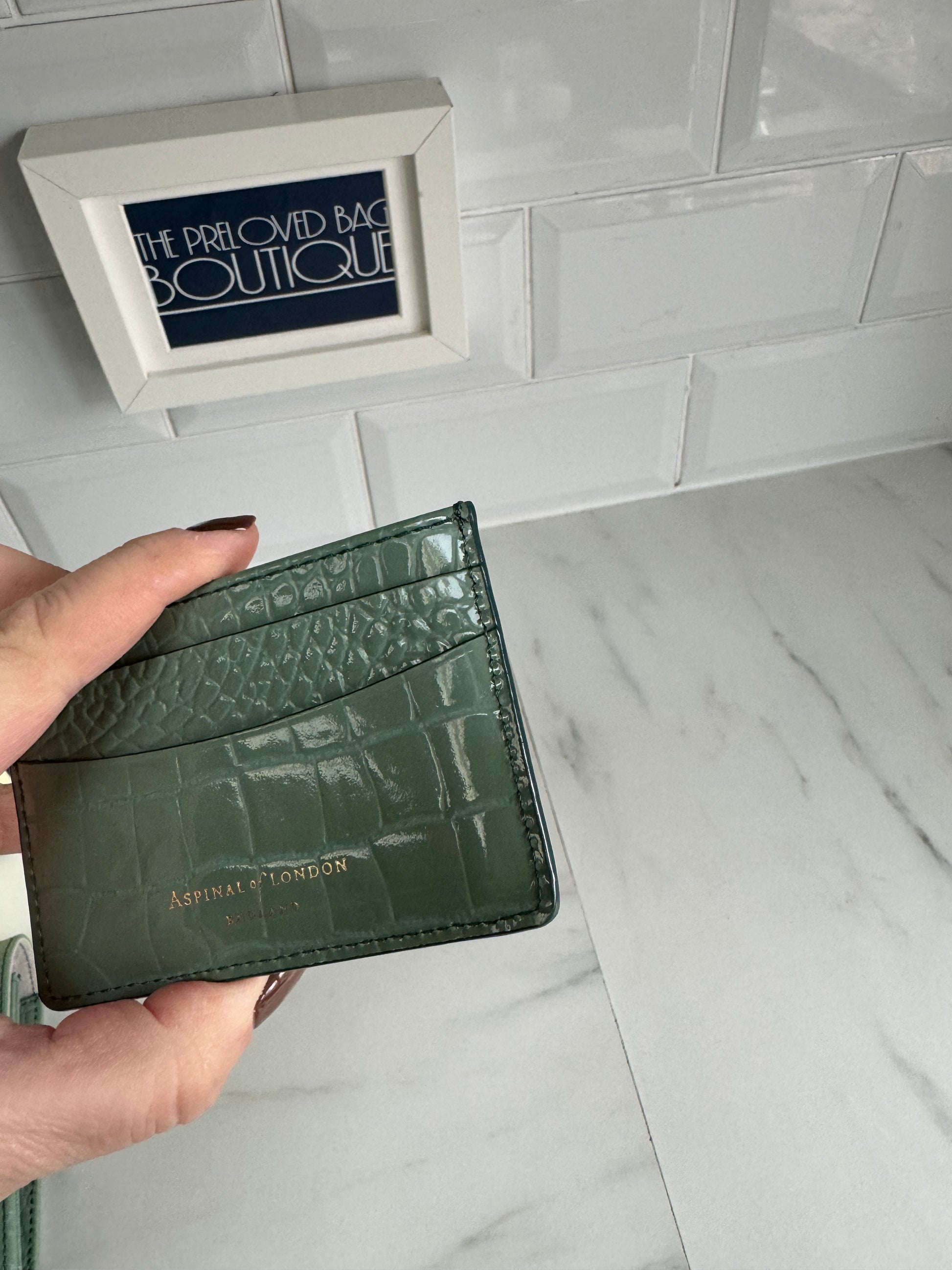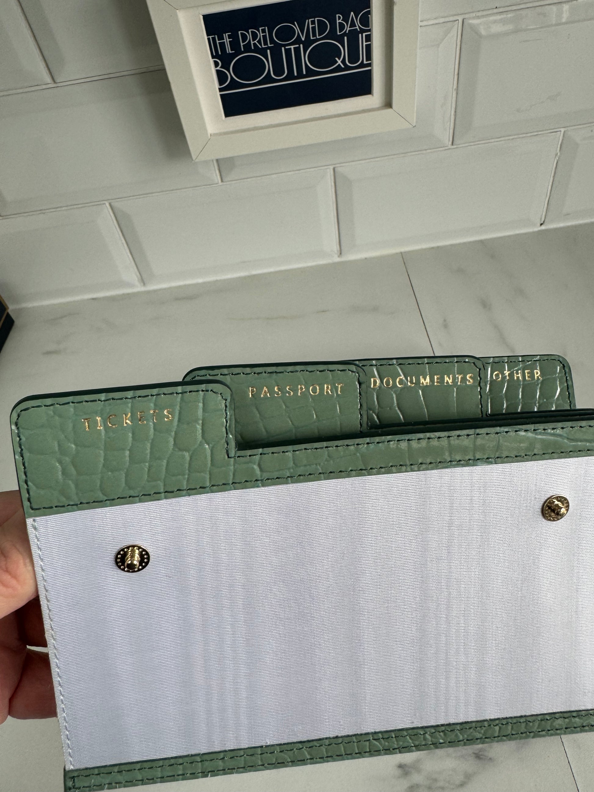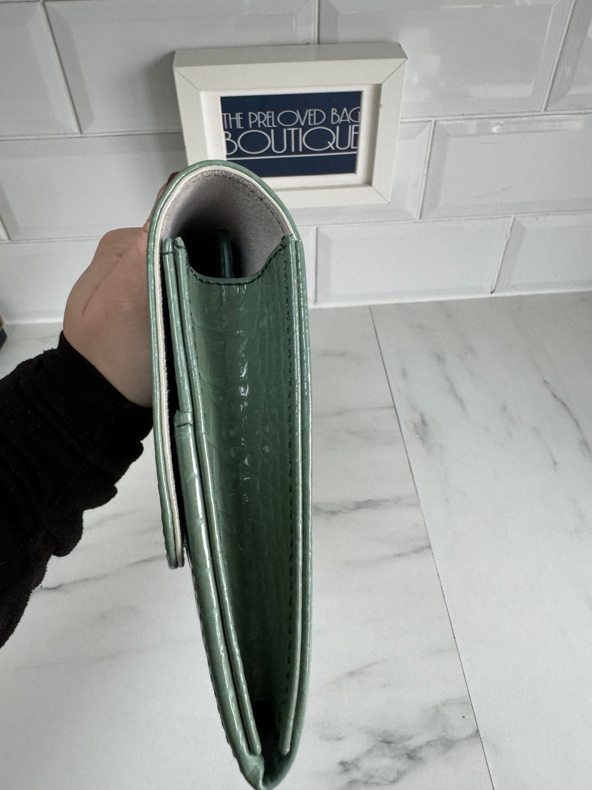 This item is a Preloved item but it has never been used.  It’s **as good as new**The removable tabbed section helps keep things nice and orderly and easy to access. Jet off in absolute style and sophistication with this pristine travel wallet. It is made from Italian leather has a croc-embossed finishing. The removable inserts are card holder will keep everything you need to hand.  There is also a zipped pocket to keep loose items safe and the suede lining adds to the elegance. The travel wallet also comes with a separate card holder in matching green croc embossed leather.