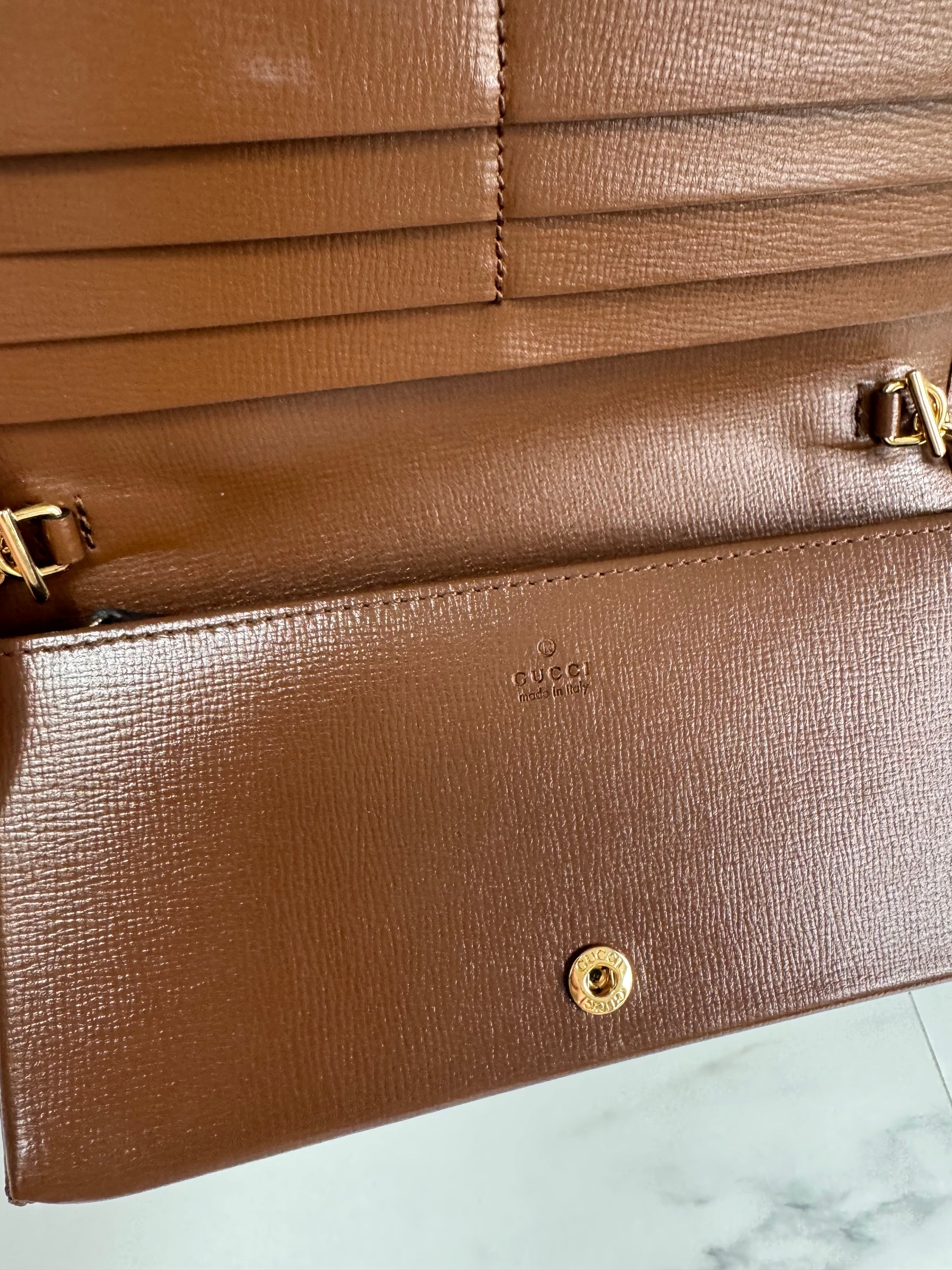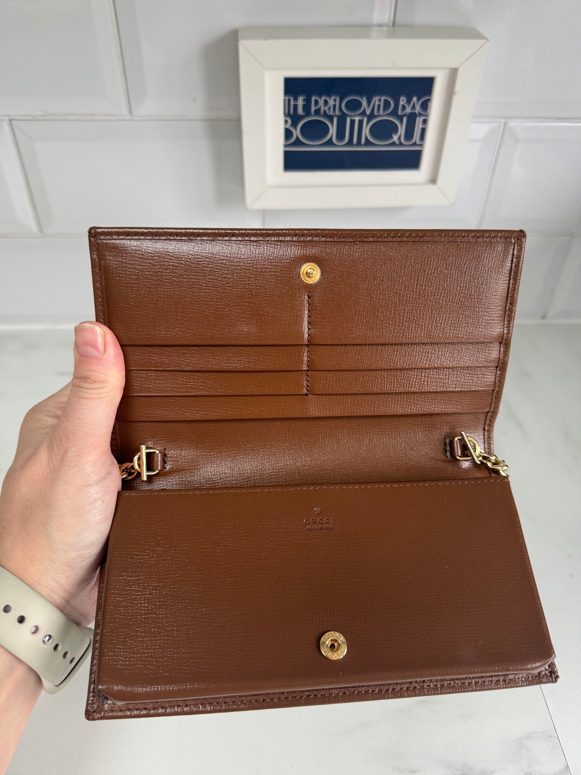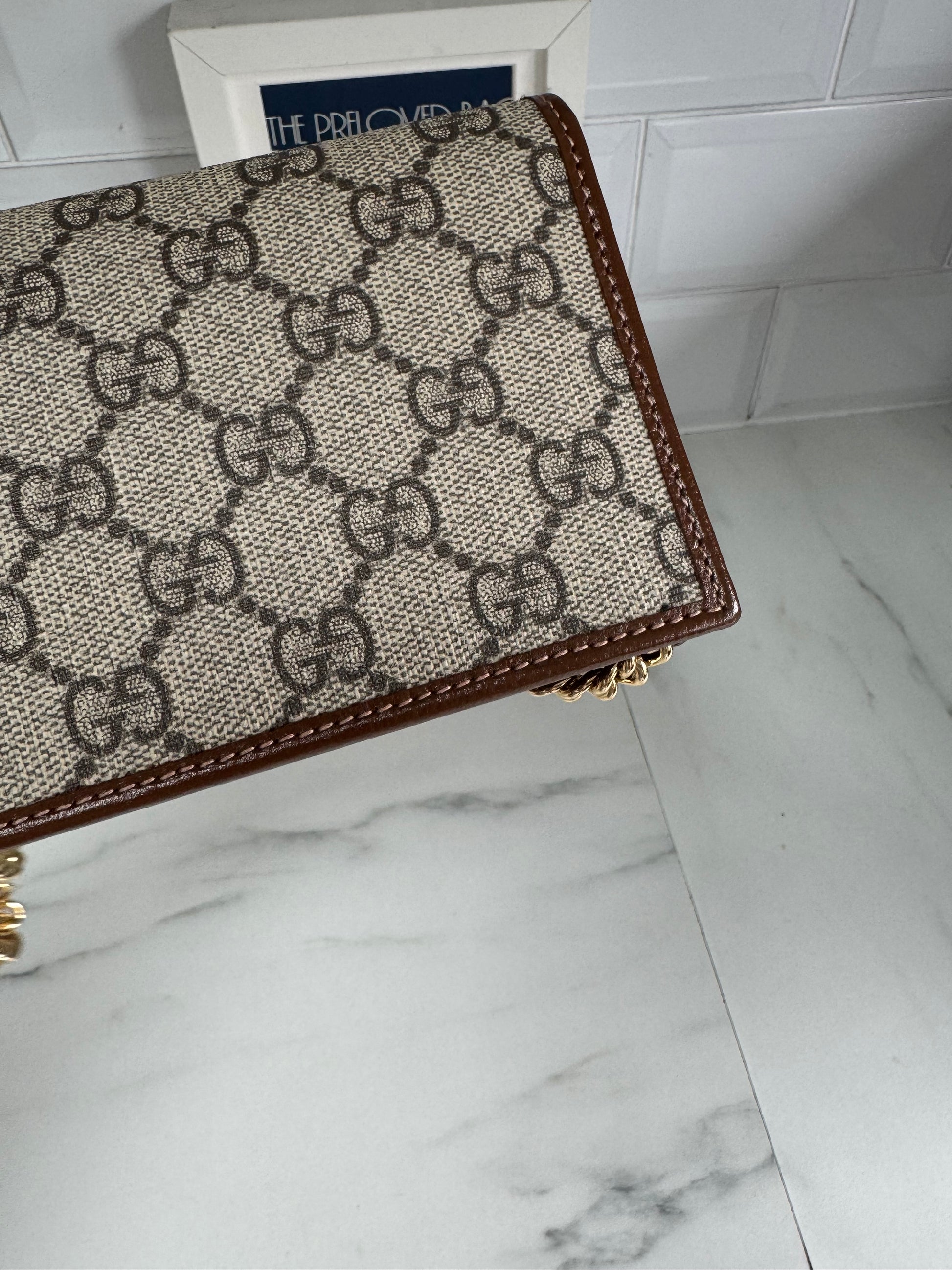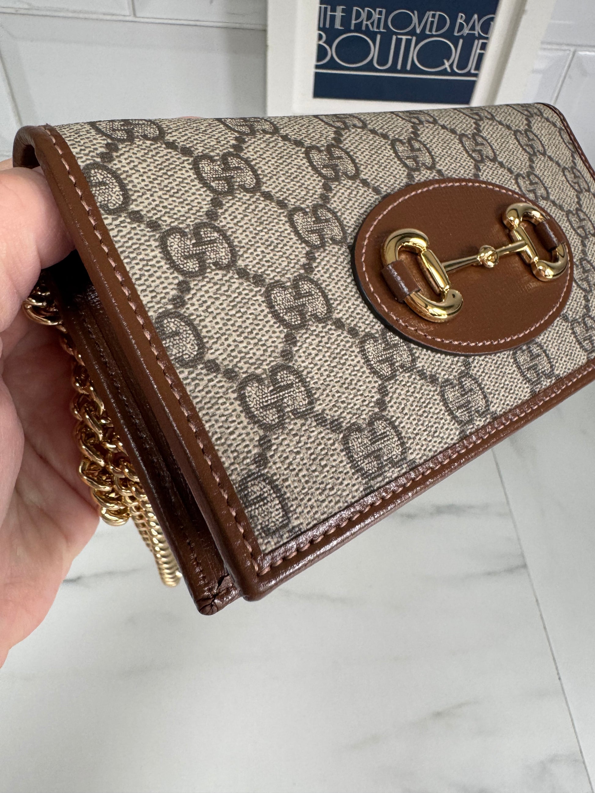 It is a Preloved item but has never been used! The Horsebit 1955 accessories collection, is defined by the double ring Horsebit design. This wallet on chain is just gorgeous. The top flap secures with a snap-closure and has 6 card slots,1 flat pocket, 1 gusseted zip pocket, 1 main compartment.It is edged in brown leather and the GG supreme canvas in beige and brown is spotless!! This bag also has a a detachable gold tone chain strap for versatile wearability!