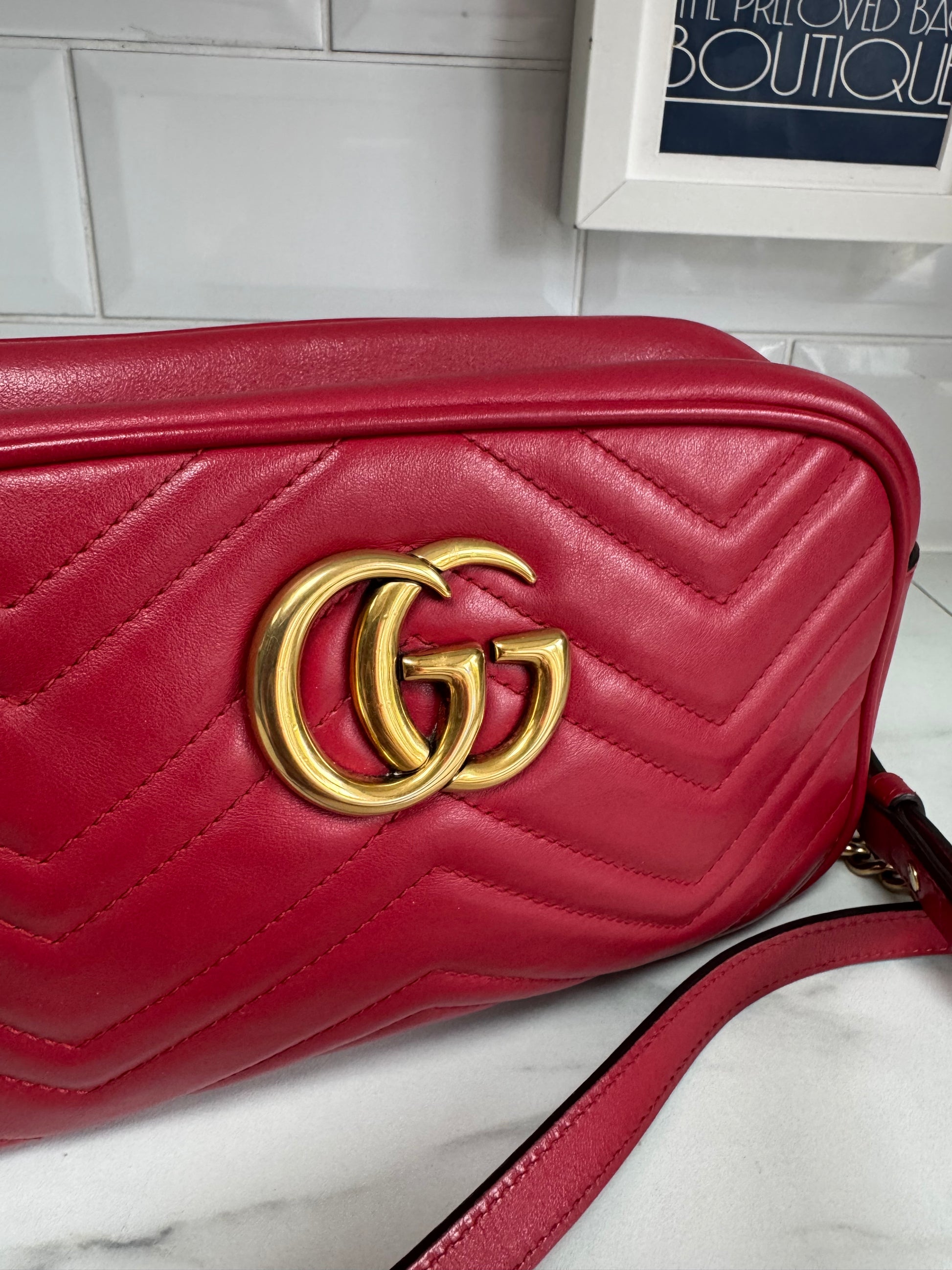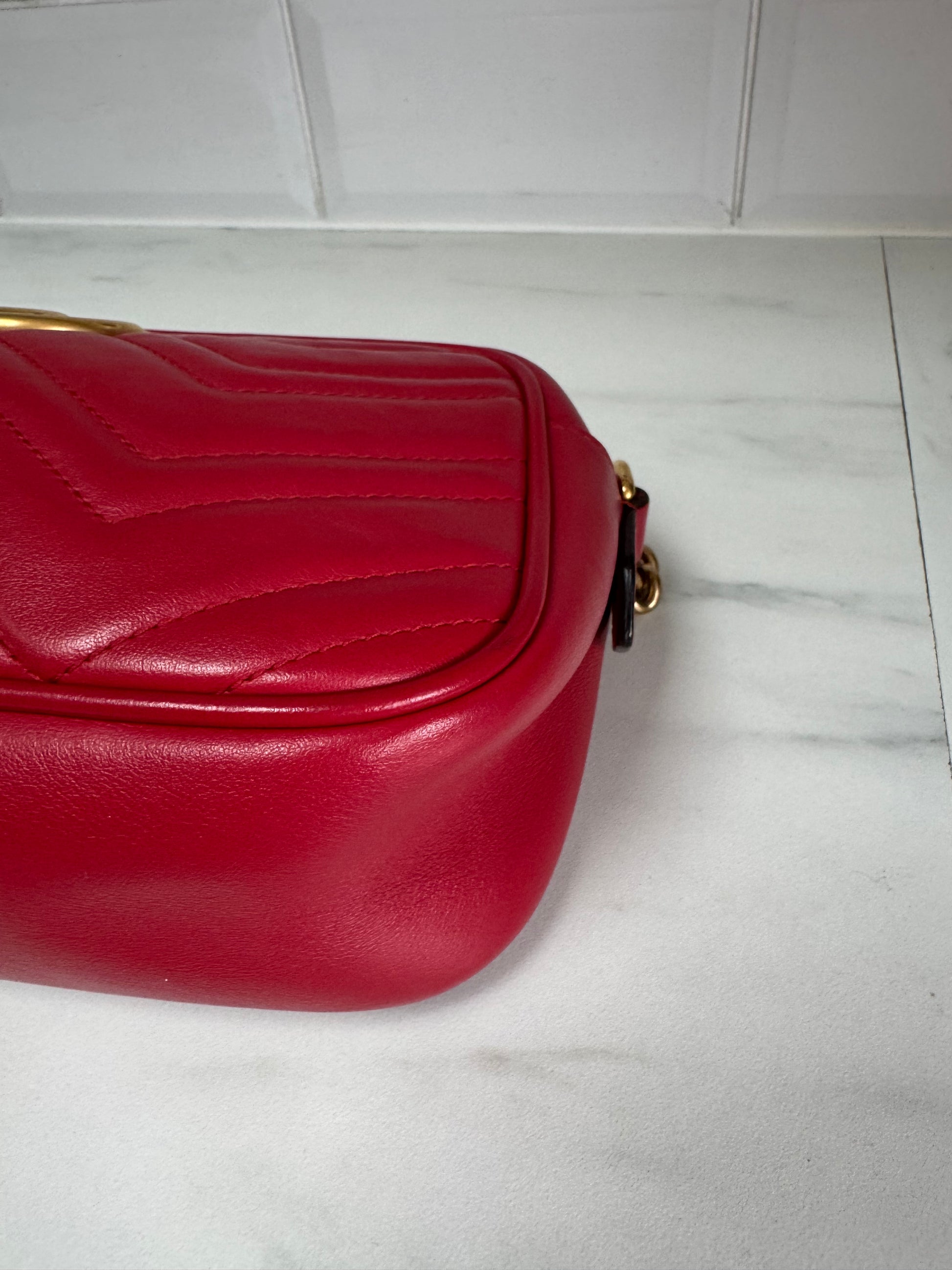 This bag is absolutely gorgeous.It is a small Gucci GG Marmont shoulder bag in Red chevron matelasse leather with antiqued gold tone hardware.