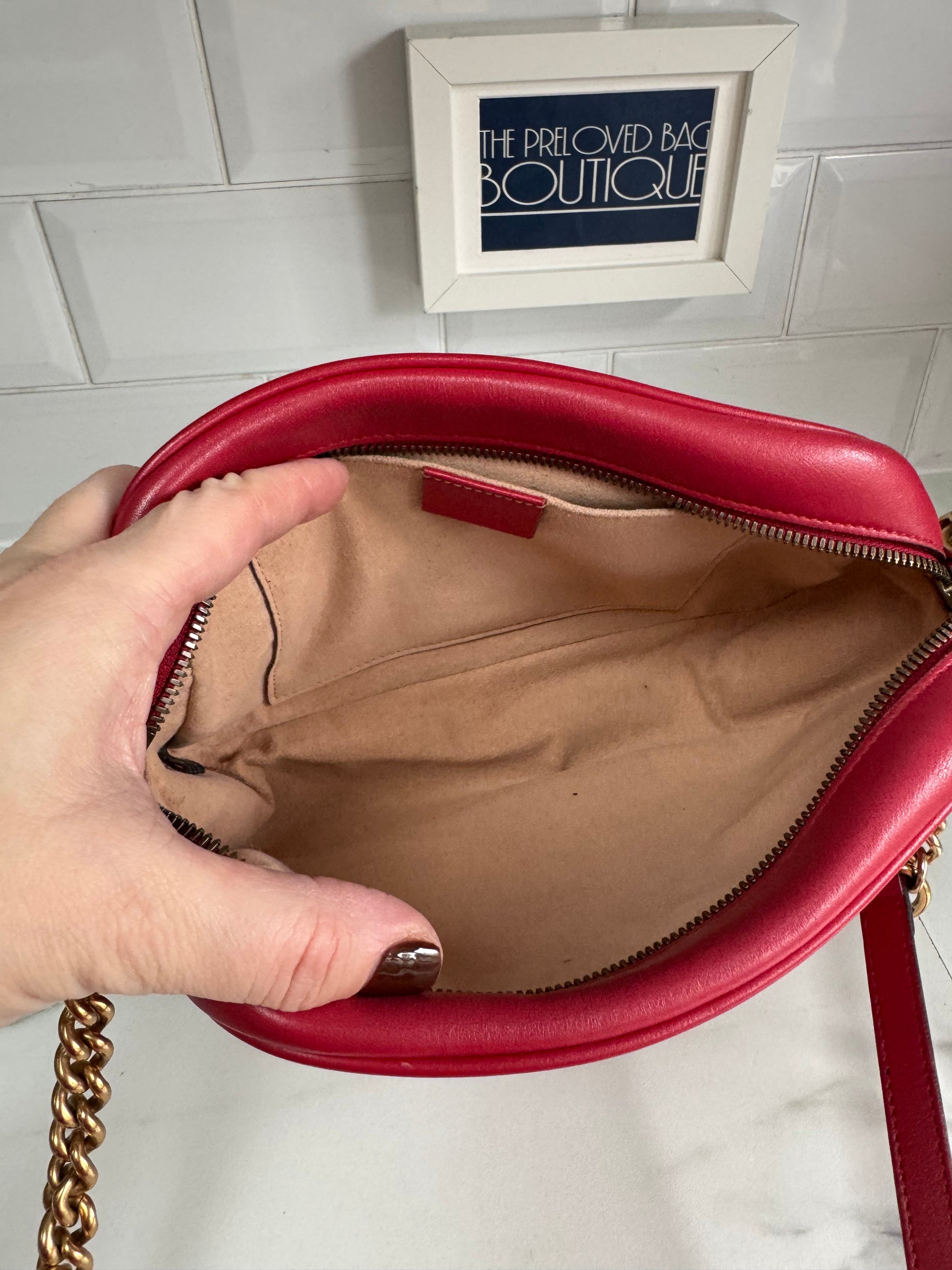 It is a Preloved item but in excellent condition. The small GG Marmont chain shoulder bag has a softly structured shape with a zip top closure. The double GG on the front of the bag is antiqued gold tone hardware along with all additional hardware like the chain in the long strap. This bag is made in matelasse leather with the quilted chevron pattern all over. The interior is lined in a nude microfibre suede and there is a slip pocket inside.The adjustable chain shoulder strap means this bag can be worn as a crossbody or on the shoulder, however you fancy, making it a superb hands free carry!The top Zipper has an elongated zipper pull which makes it easy to use and extremely light to carry.