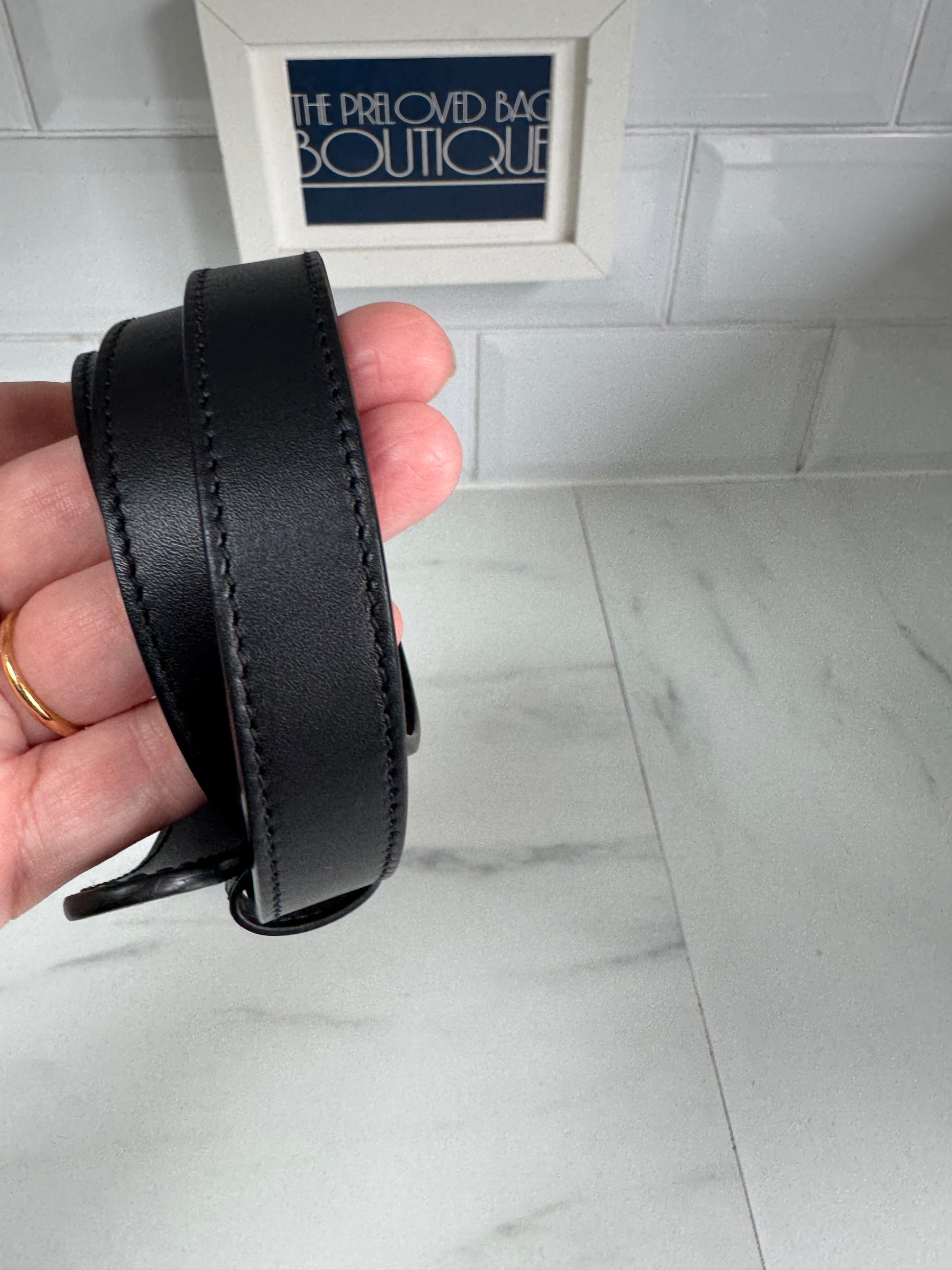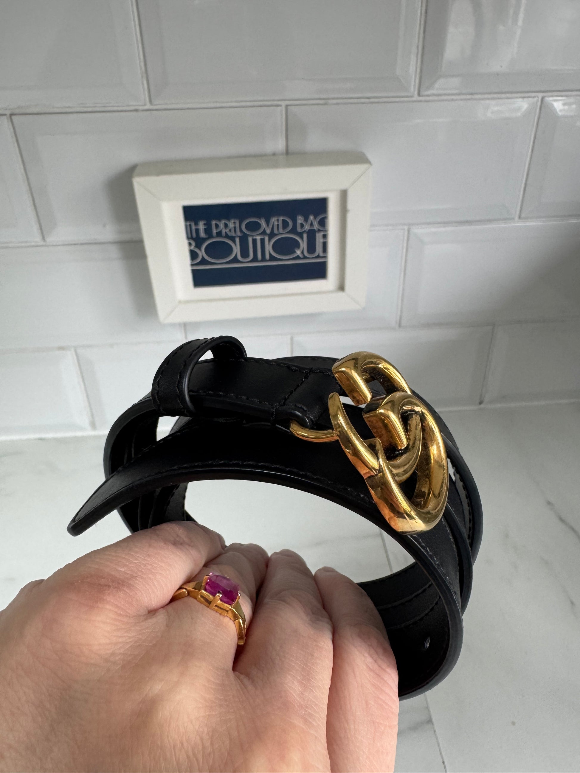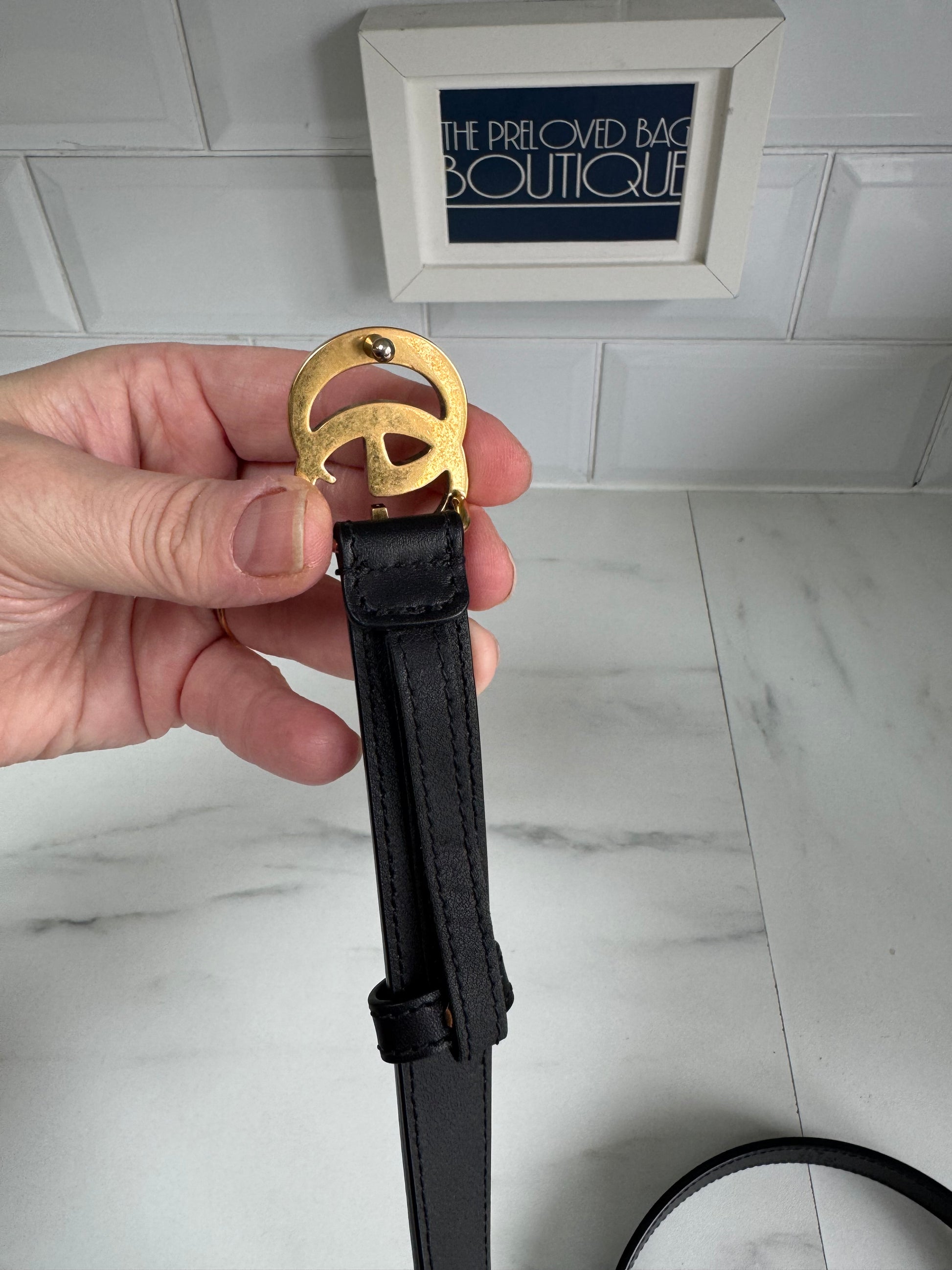 A gorgeous slim Gucci belt in smooth black leather with an antique brass finish to the small iconic GG hardware.