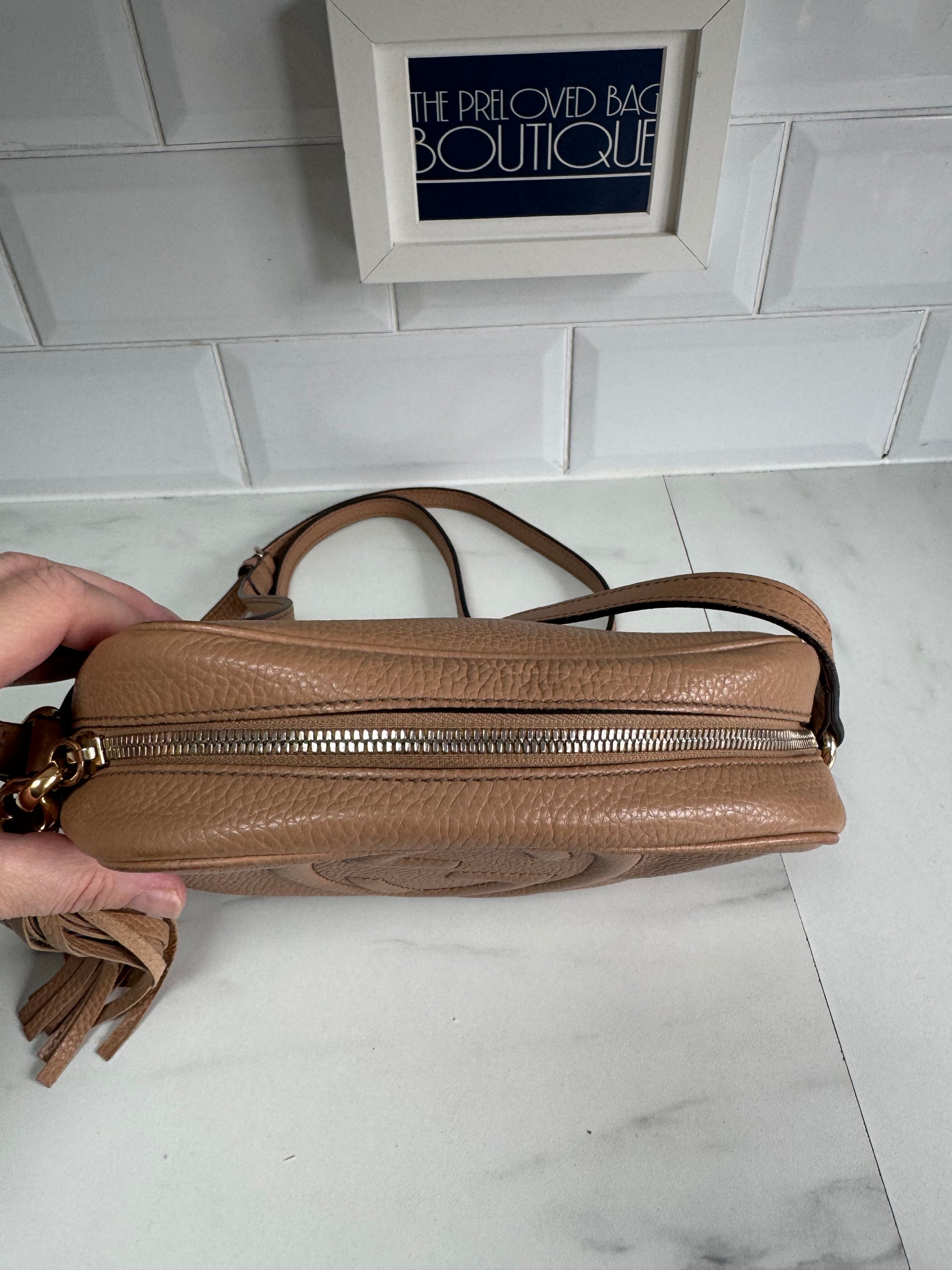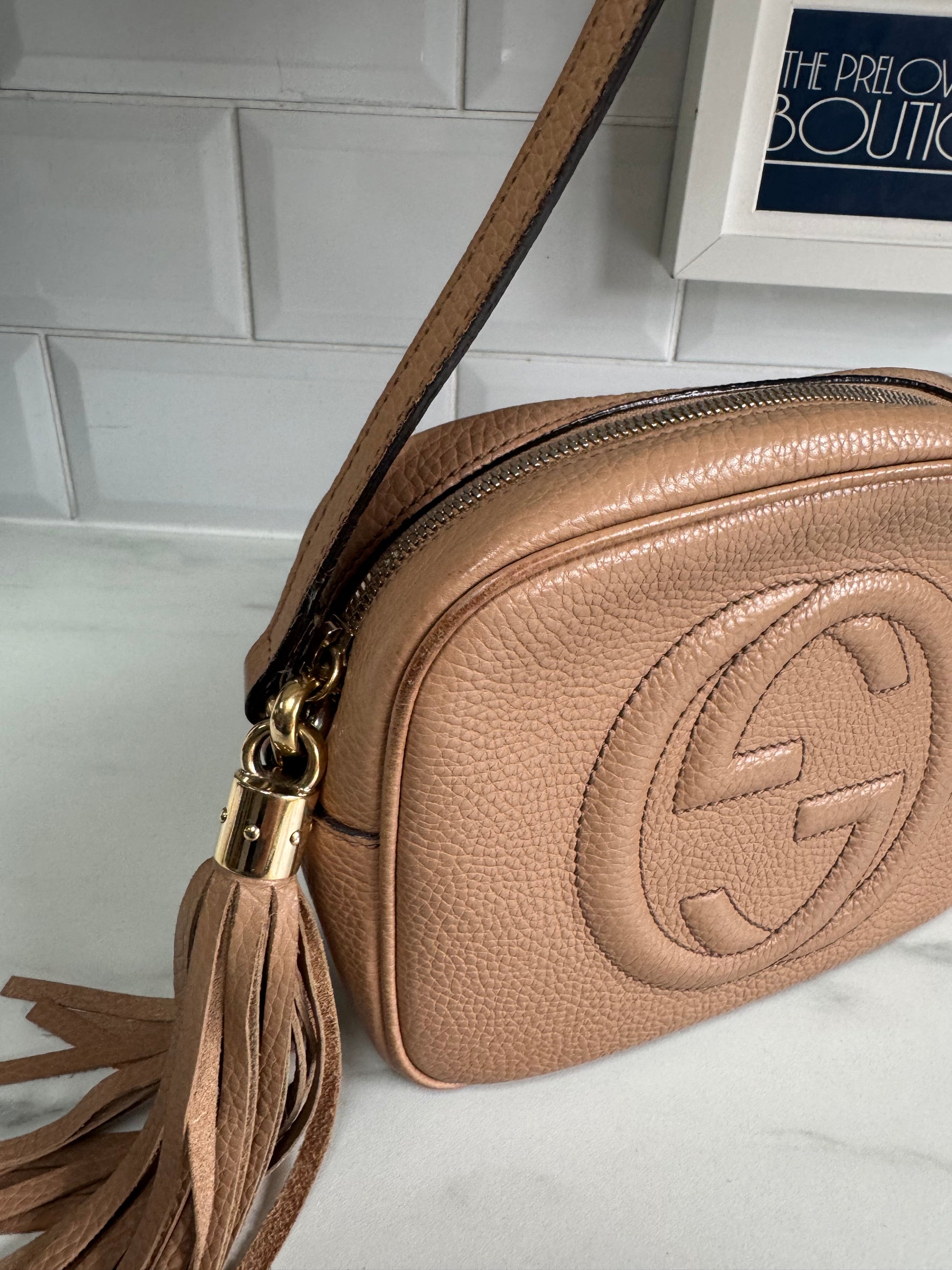 This is an absolutely amazing and highly sought after Gucci Soho disco bag in the most amazing neutral rose beige pebbled calfskin leather with a long adjustable leather strap and long tassel zip pulley.