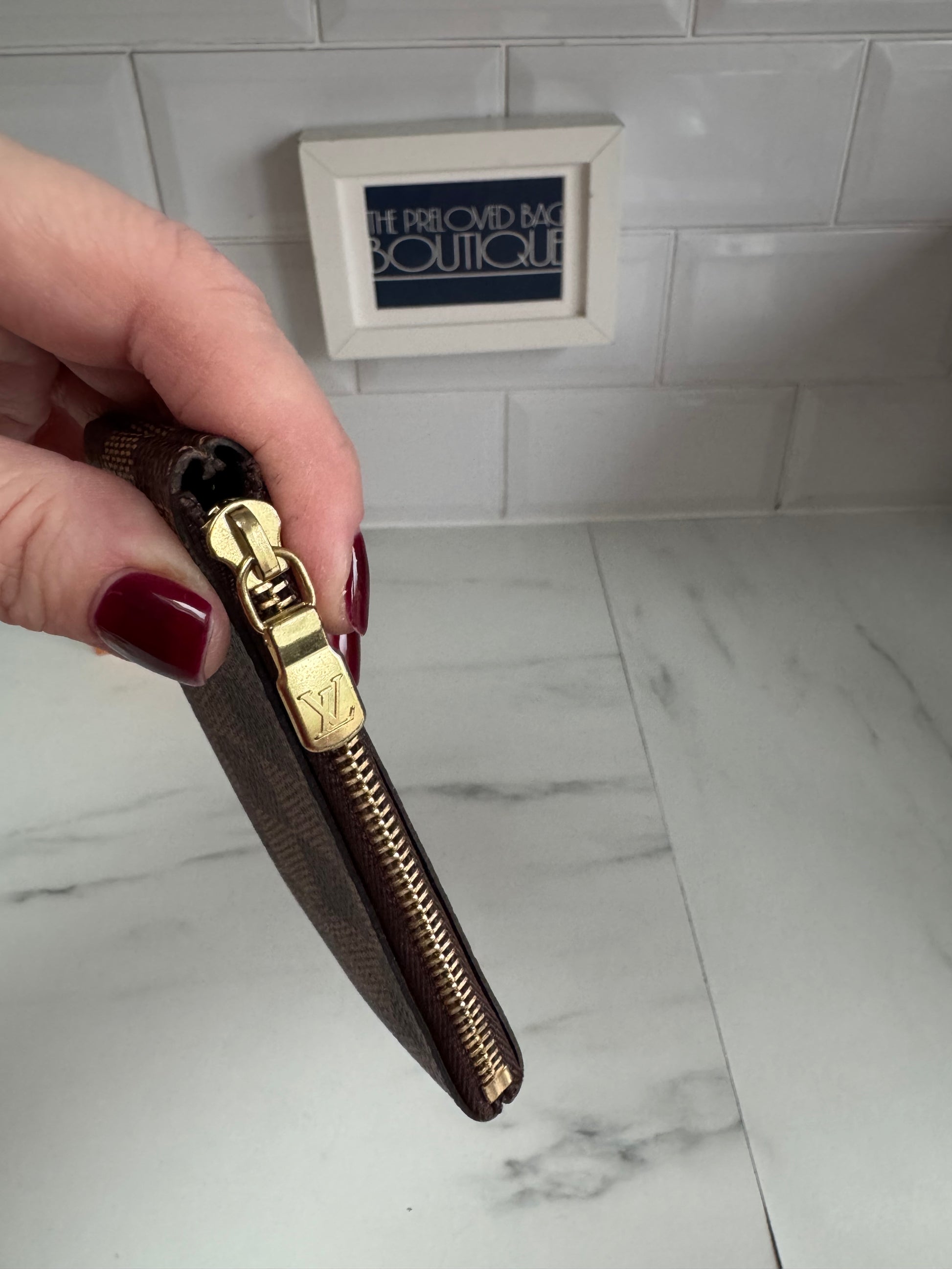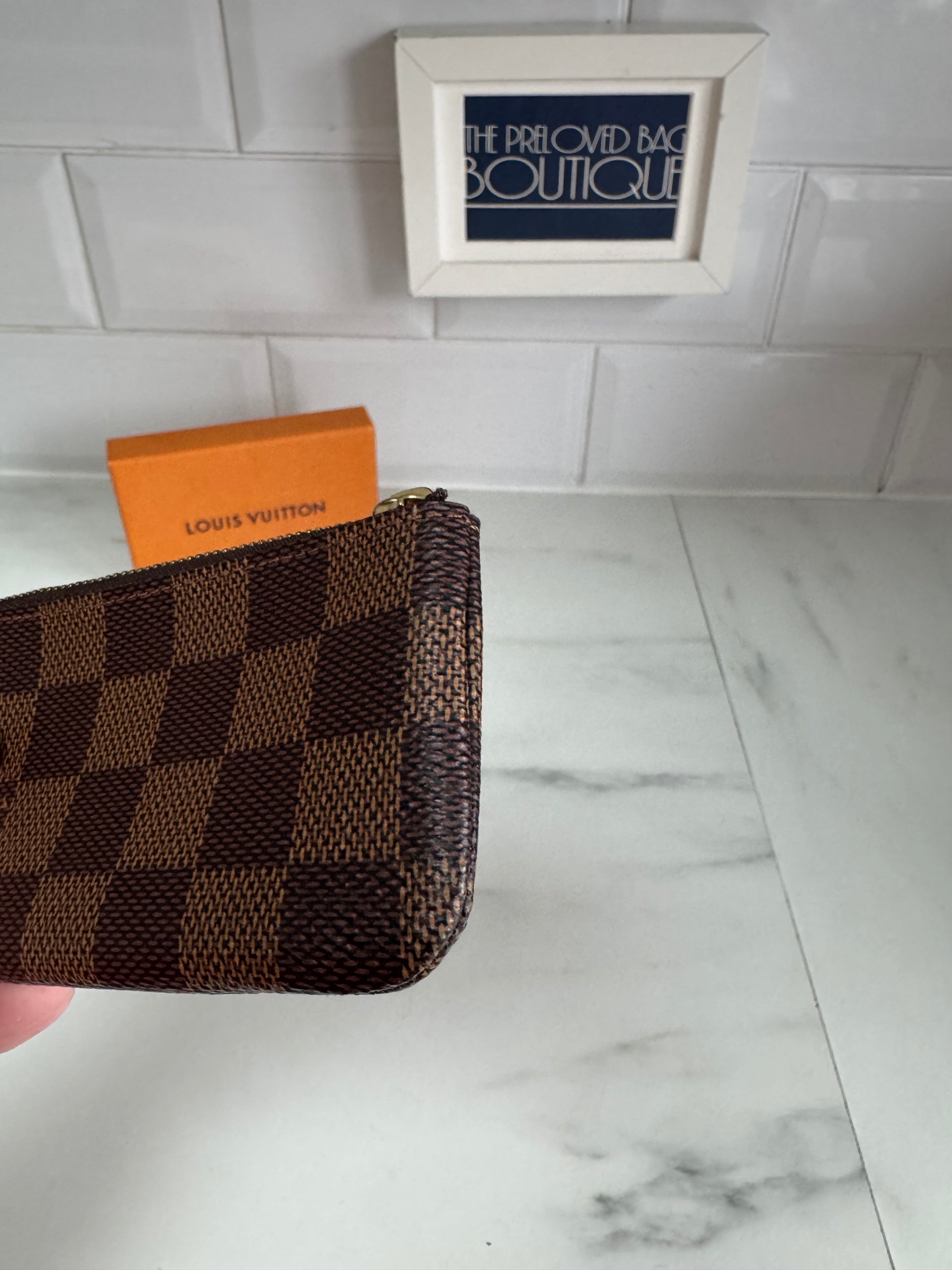 This little key pouch/holder from Louis Vuitton is crafted in the brand's fabulous Damier Ebene Square print canvas and is finished with a golden brass tone hardware chain clip and additional hardware.