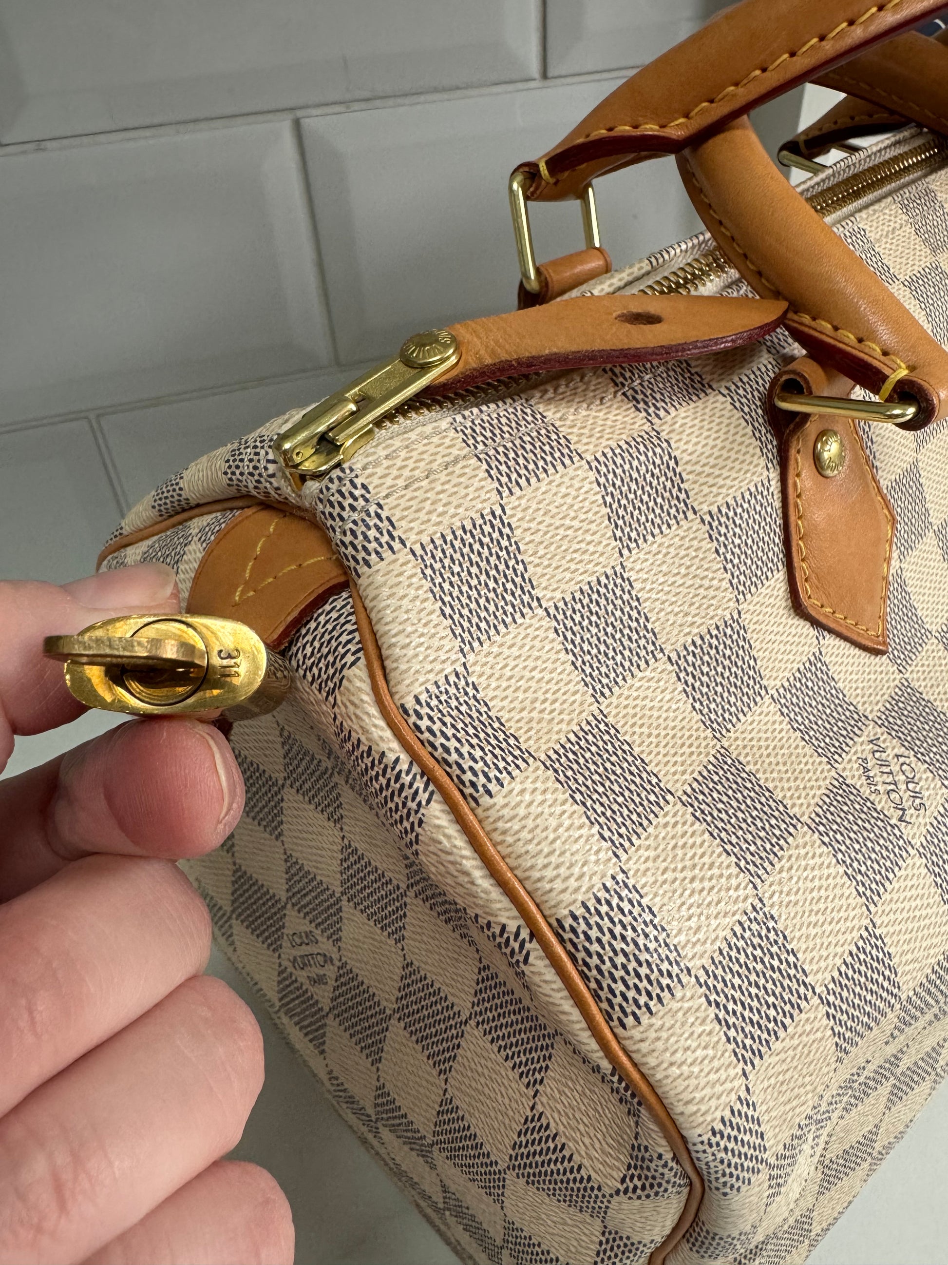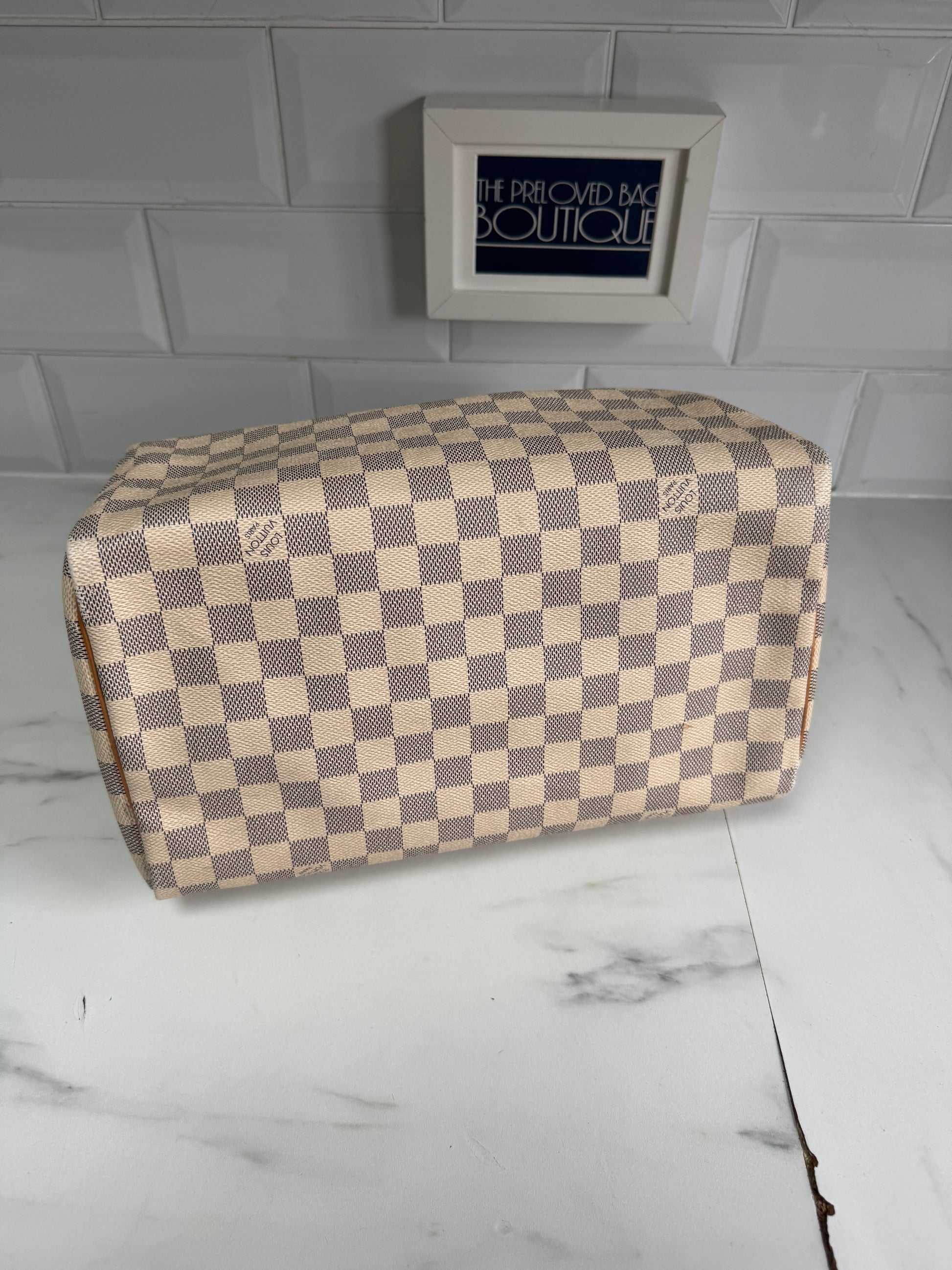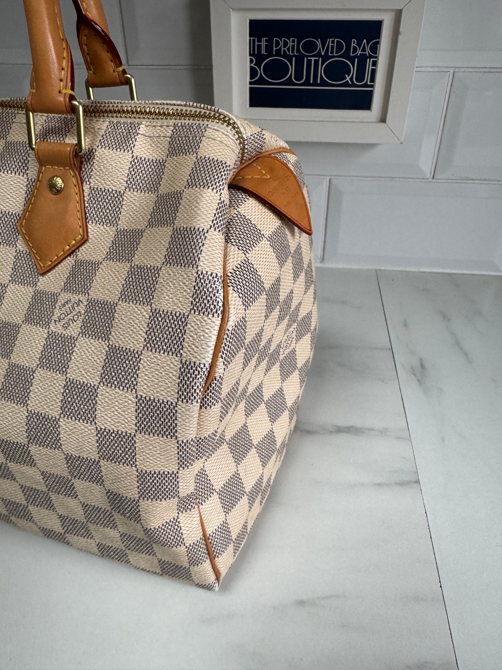 Another absolute beauty from LV. A Speedy 30, in the very fabulous grey Damier Azure printed canvas.Grey checkerboard print and light caramel brown handles and accents with golden brass hardware and a neutral lining.