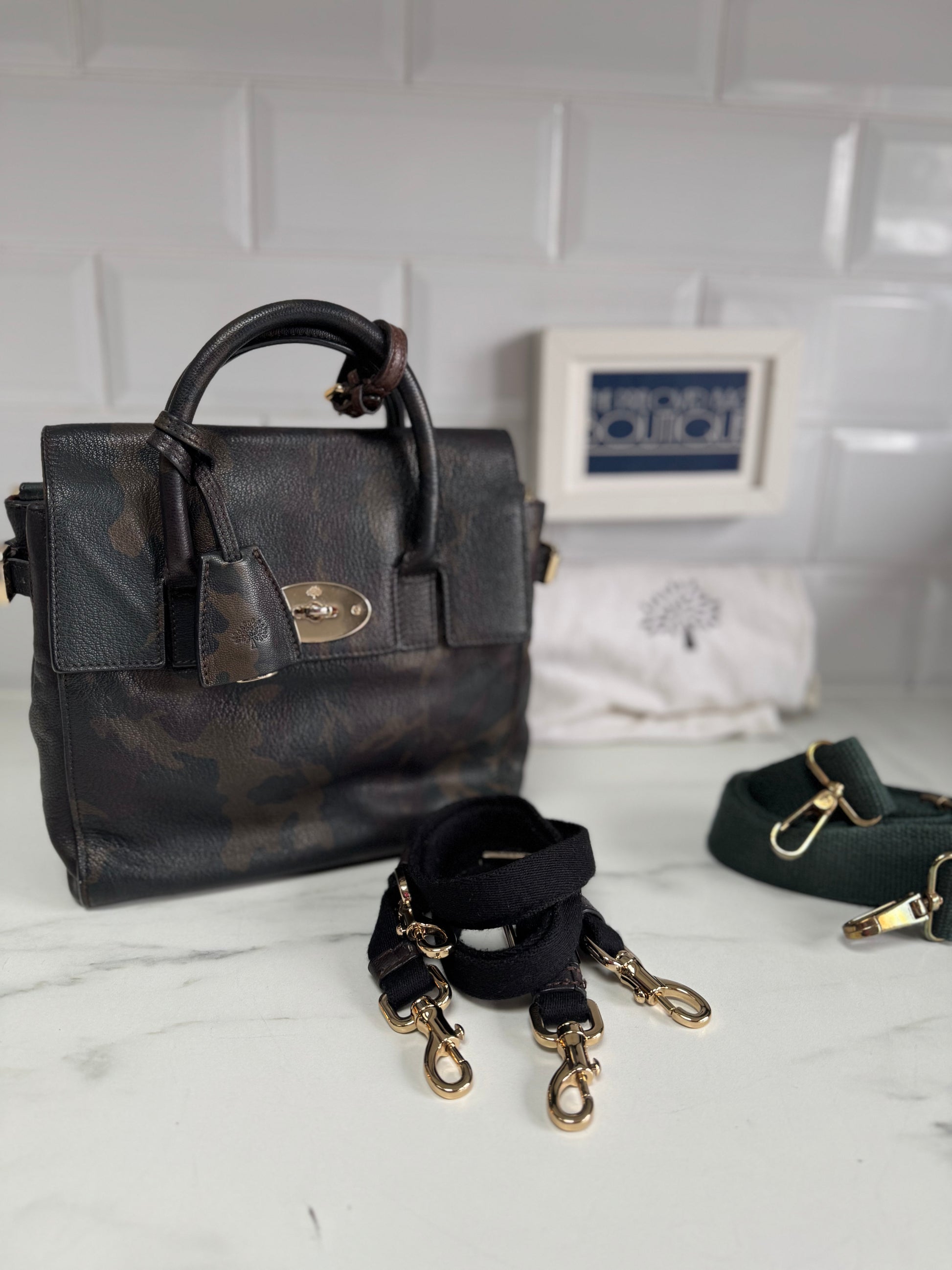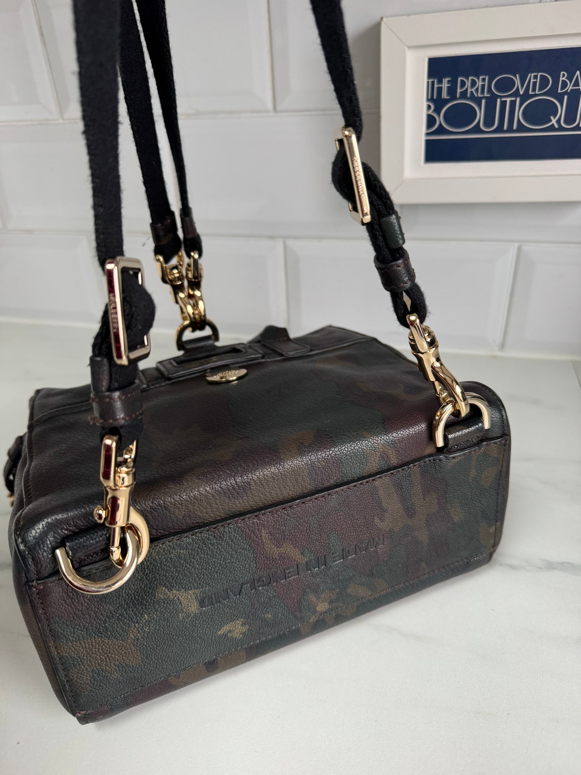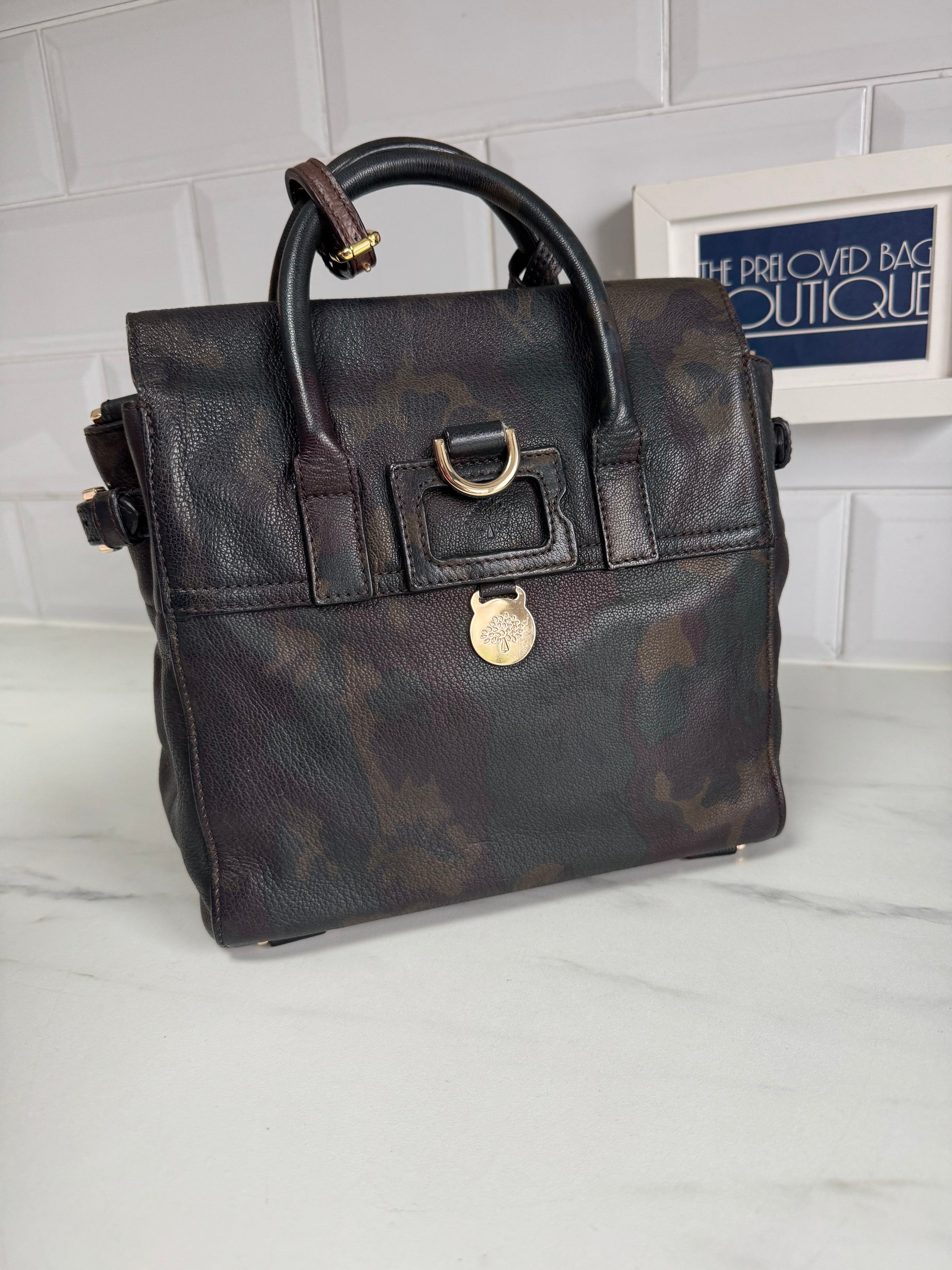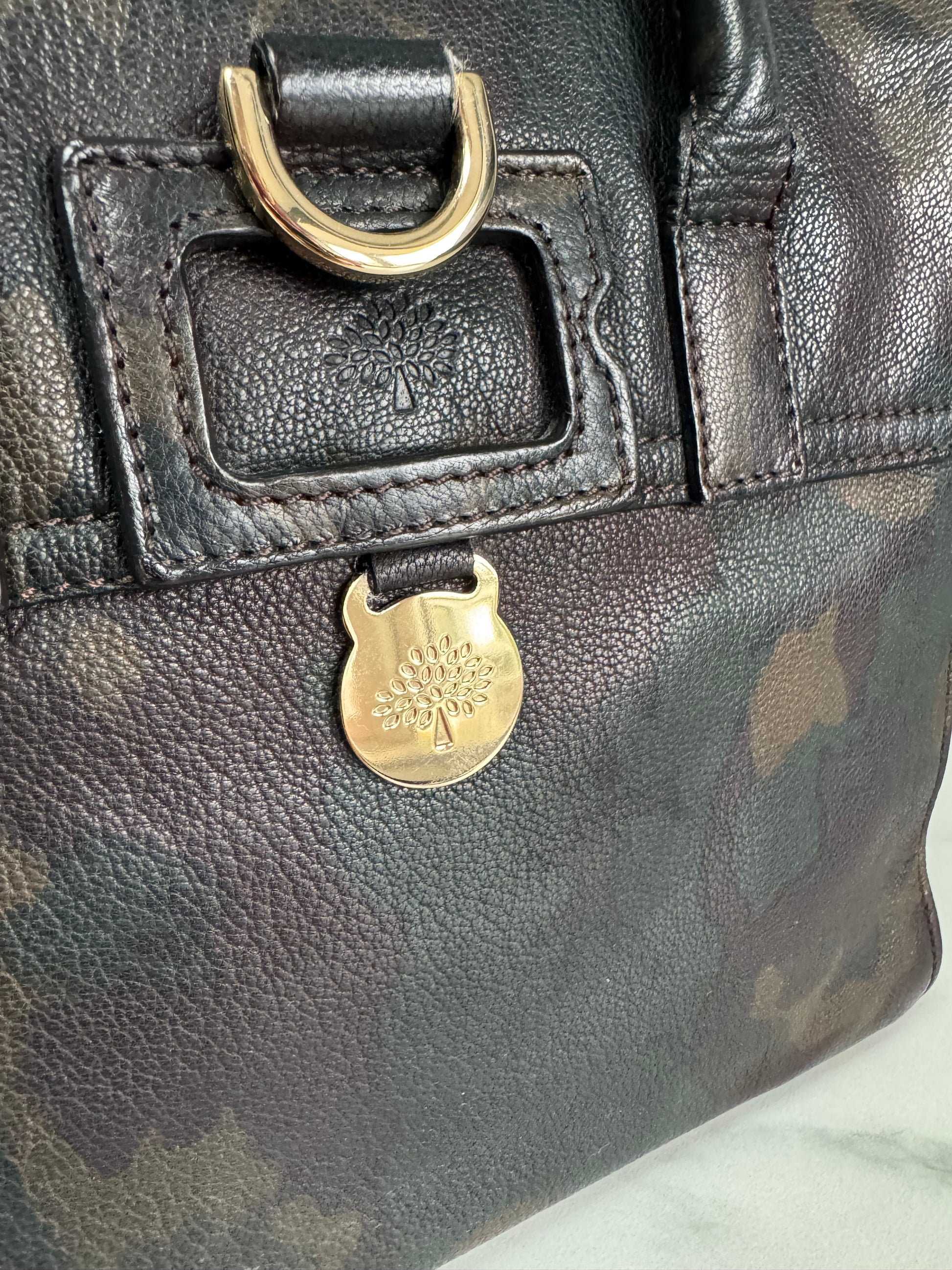 This is a beautiful Limited Edition Mulberry Cara Delevingne Mini Backpack in Khaki Greenand black Camouflage Printed Goat leather with shiny light gold tone hardware.