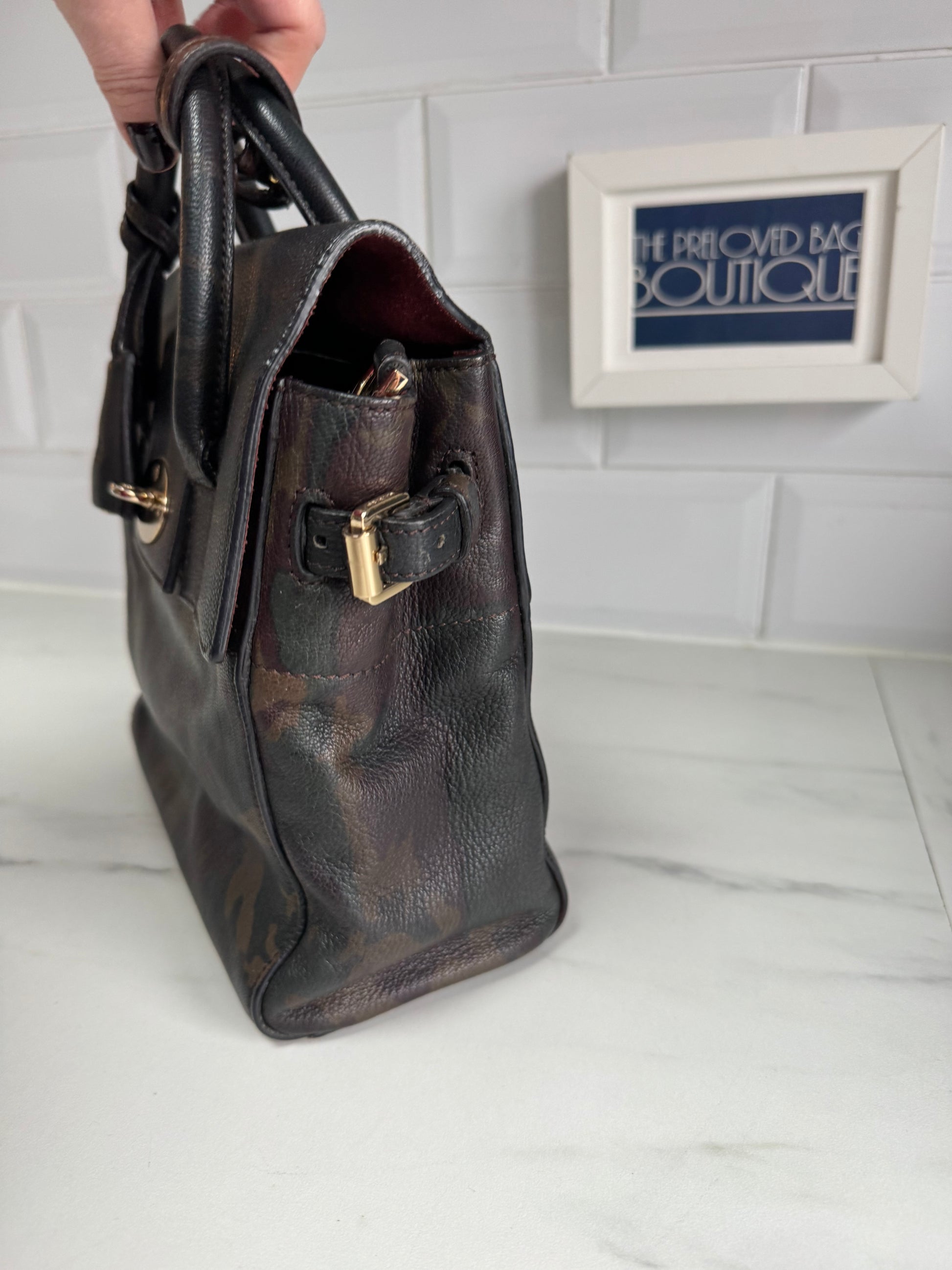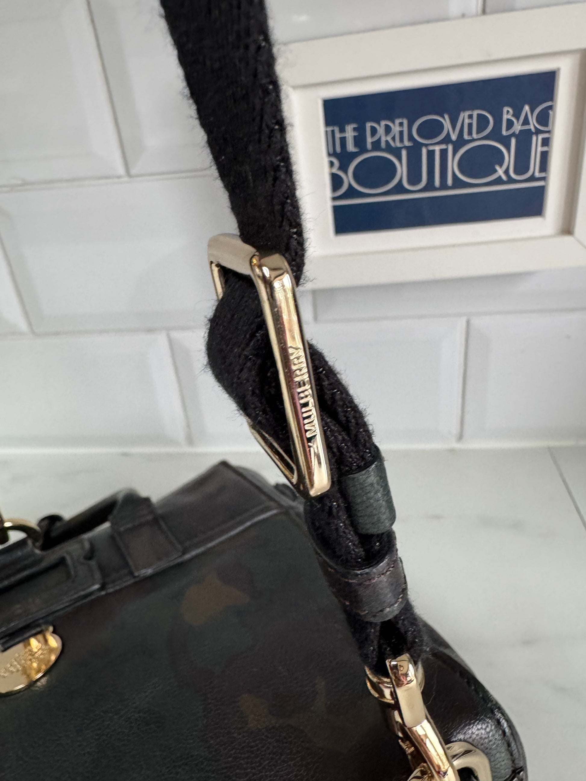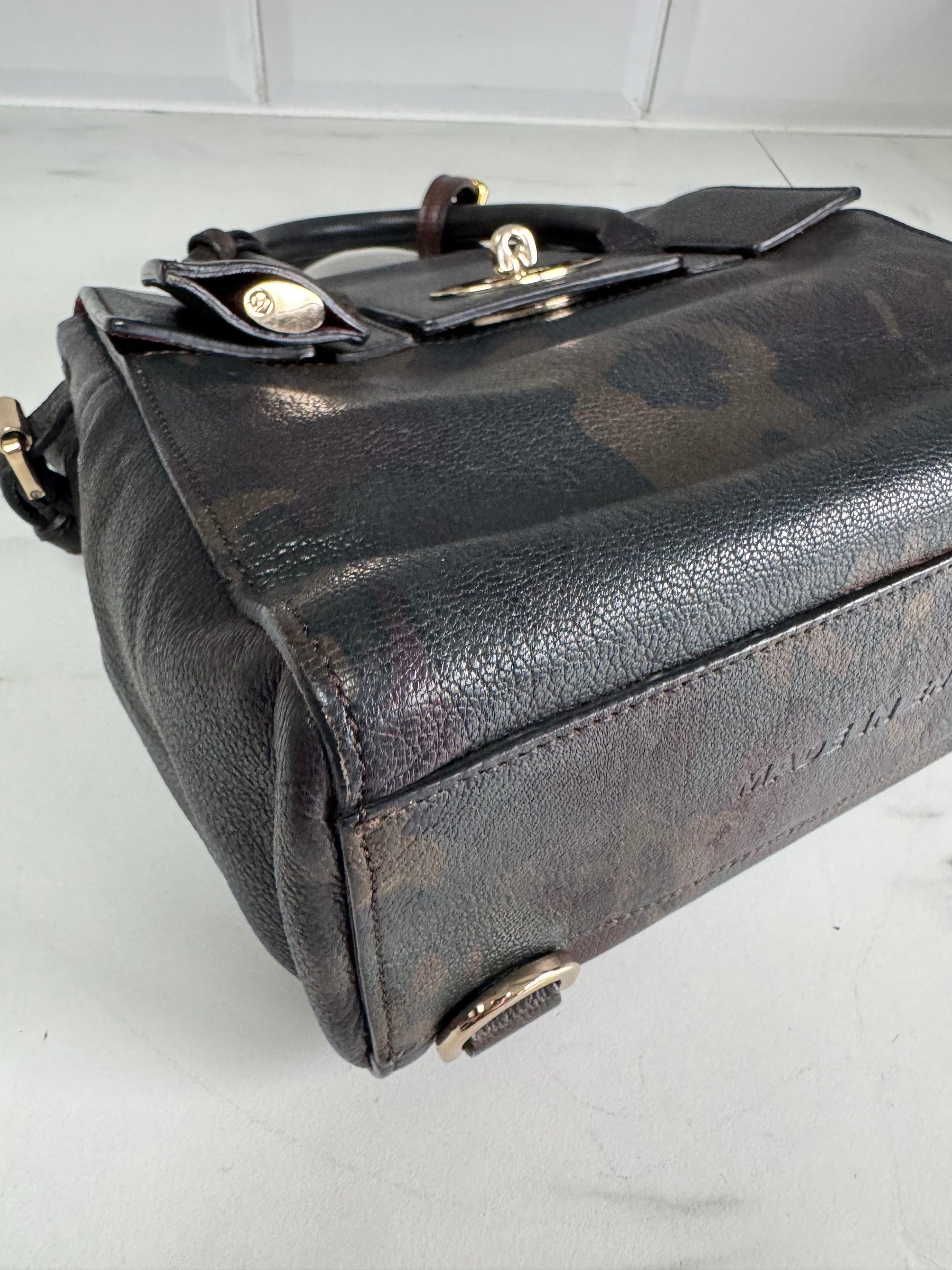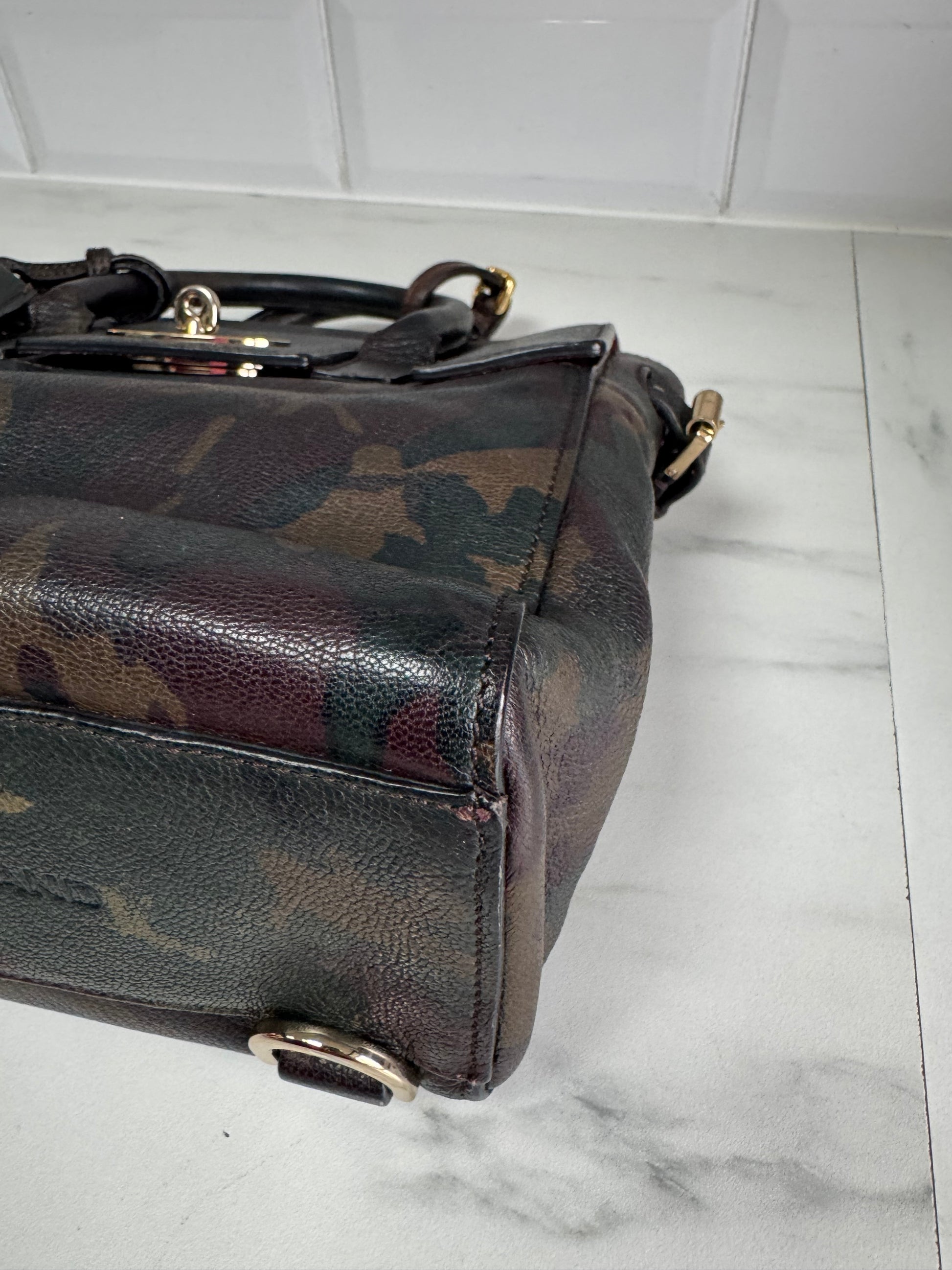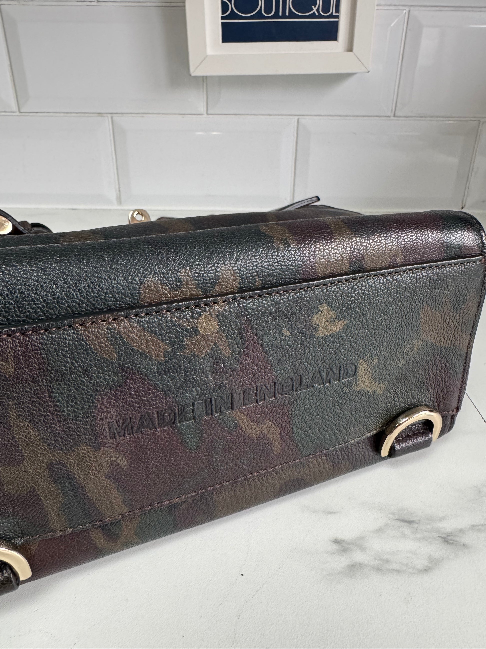 This is a beautiful Limited Edition Mulberry Cara Delevingne Mini Backpack in Khaki Greenand black Camouflage Printed Goat leather with shiny light gold tone hardware.