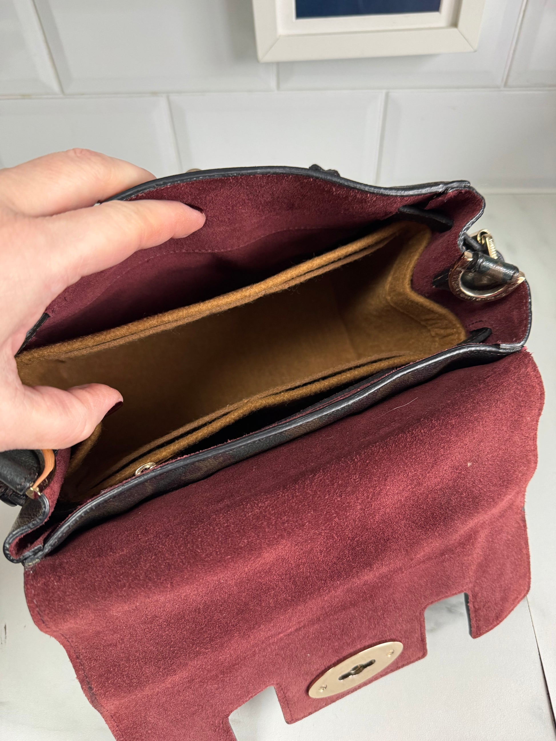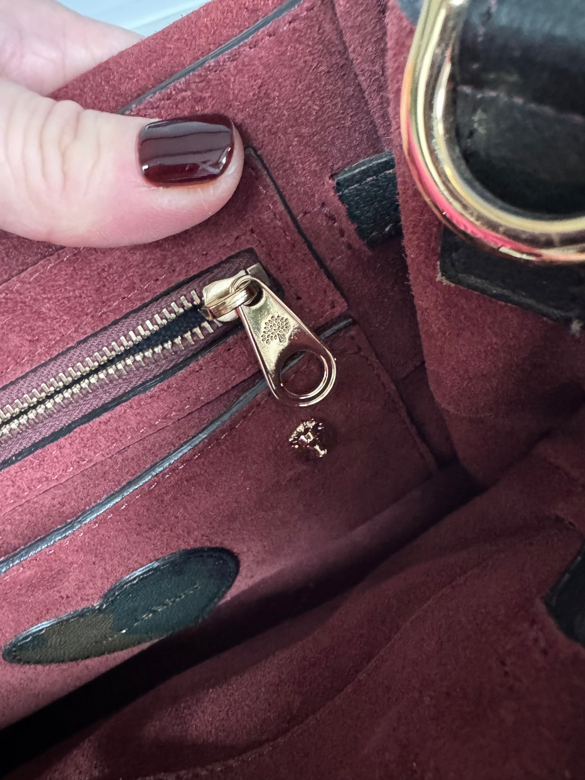 The leather is nice and strong. It is supple but not slouchy.The hardware on the front plate is shiny, it has been looked after very carefully in every way. The inside is lined in soft, oxblood microfibre with a zipped pocket inside and a slip pocket with an additional lion’s head rivet. This bag also comes with a felt liner to protect the inside.