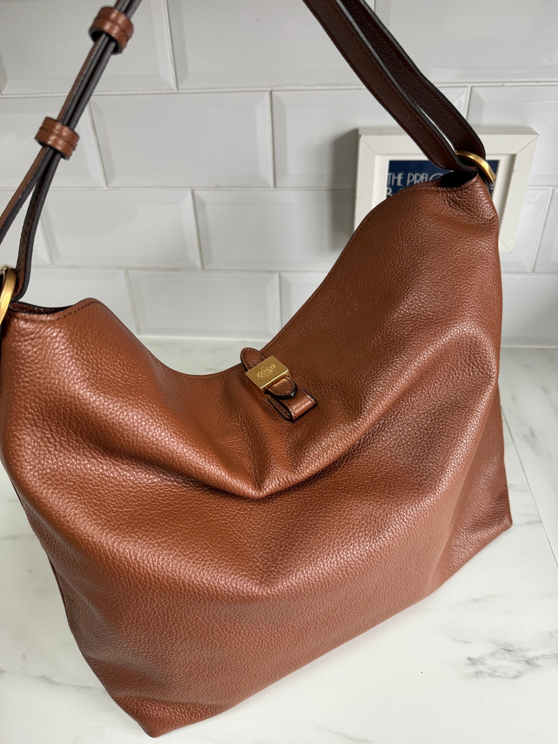 A gorgeously glossy Mulberry Tessie Hobo in Oak Small classic grain Leather with shiny light gold tone hardware.