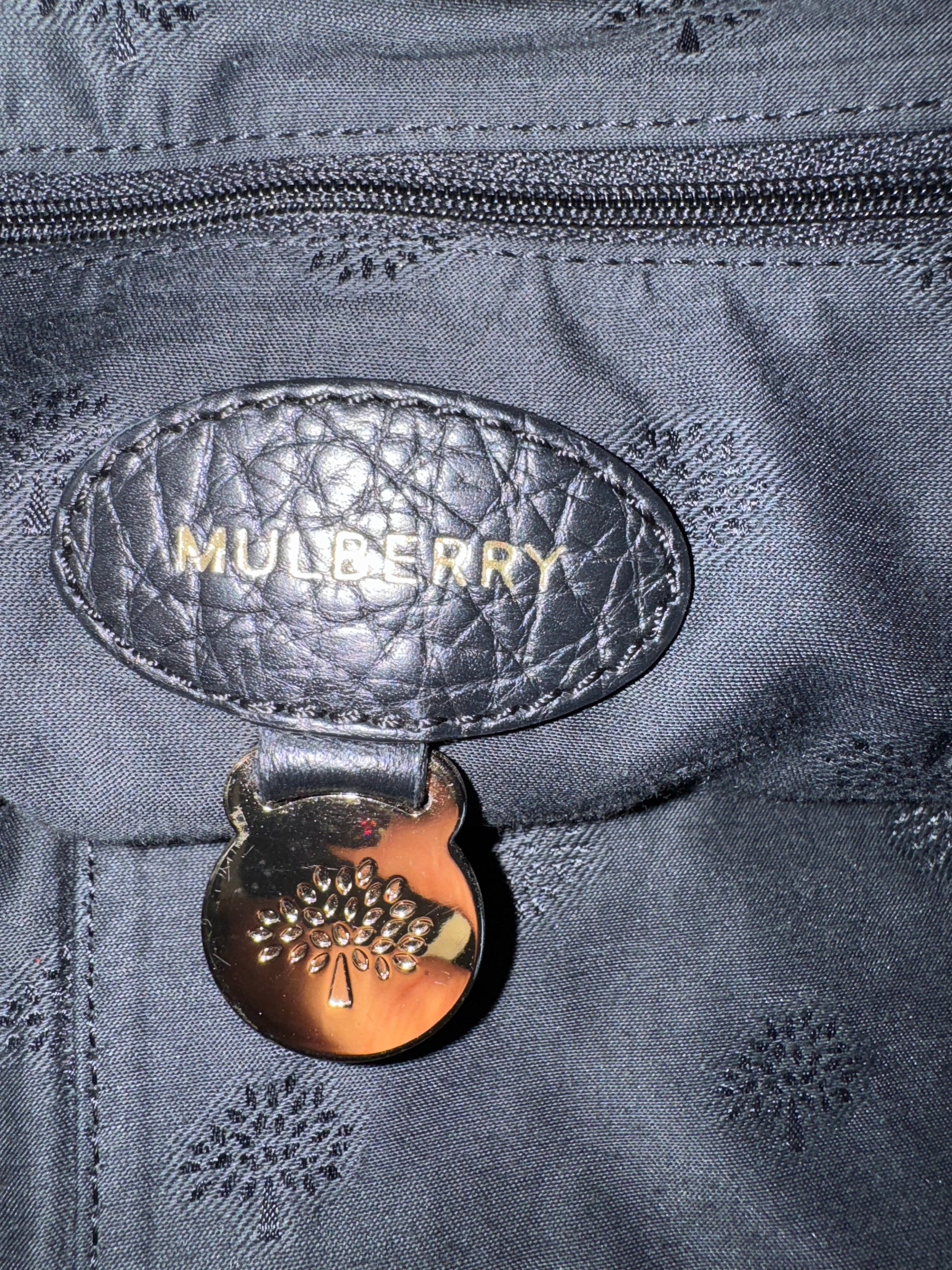 It is lined in black tree repeat fabric with a zip pocket and slip pocket inside.The long leather strap attaches to the d rings on the bag and these are still shiny.All corners are very good and all edging and piping is in very good condition.It’s a fabulous bag and quite spacious too.