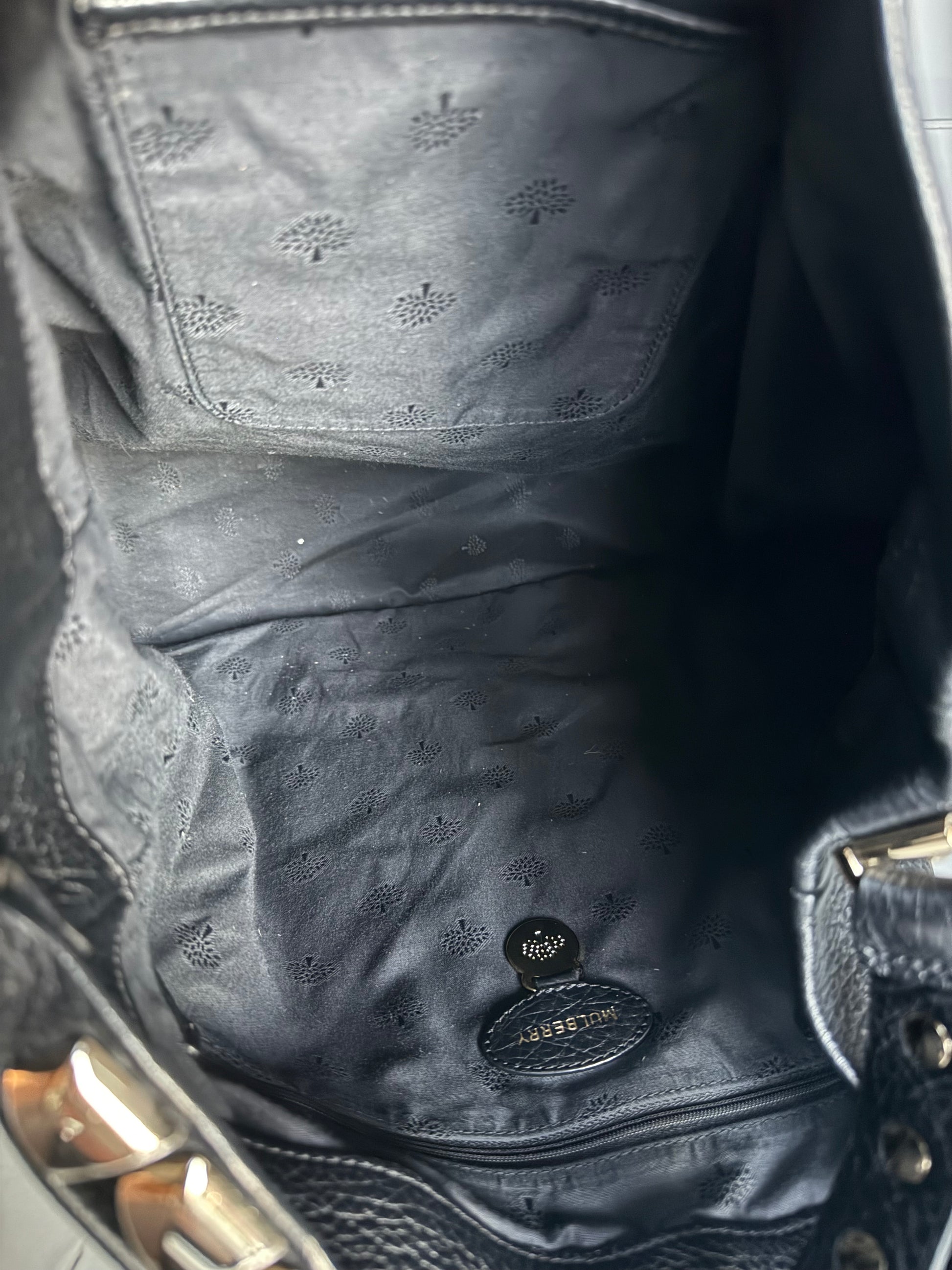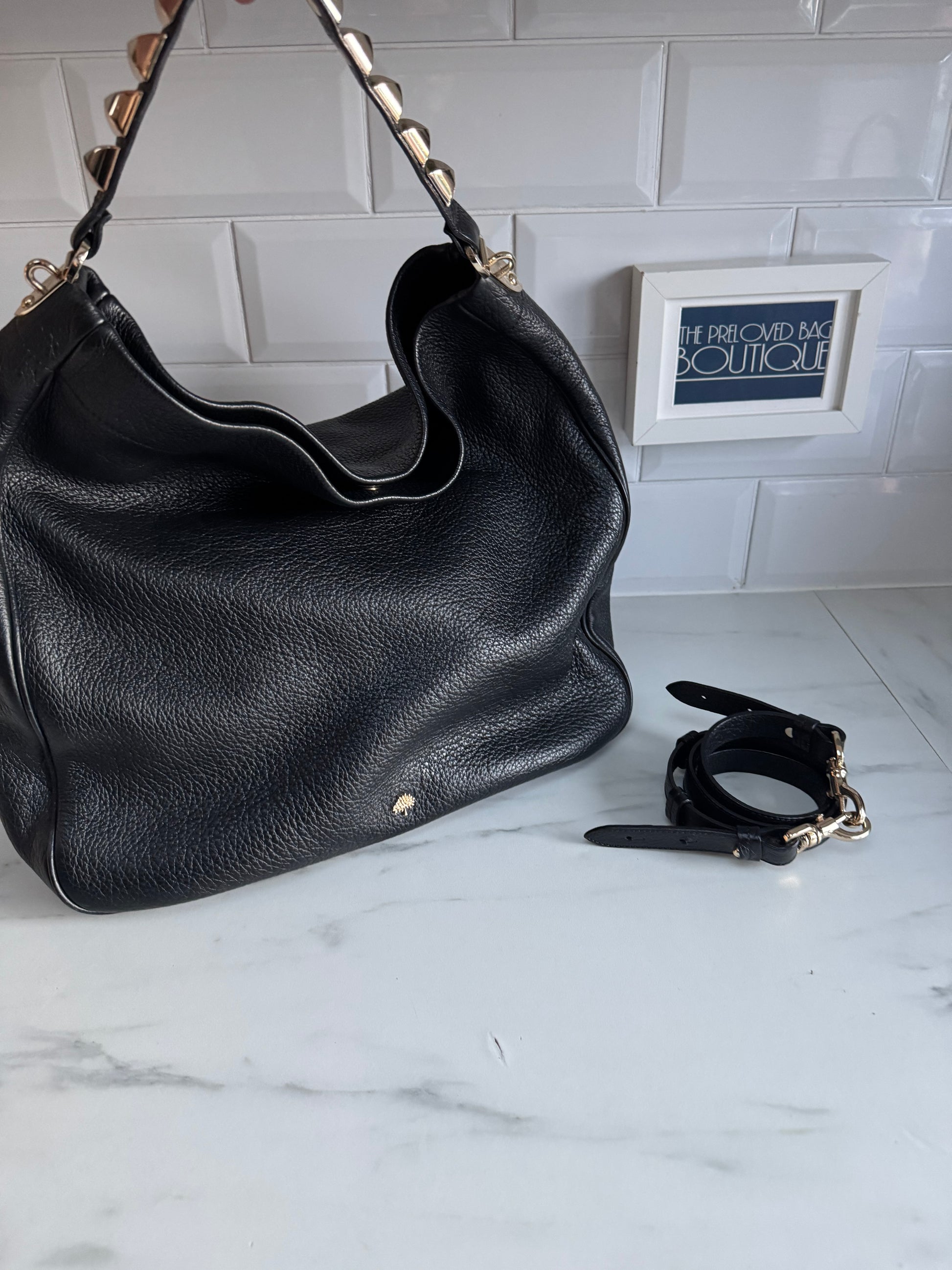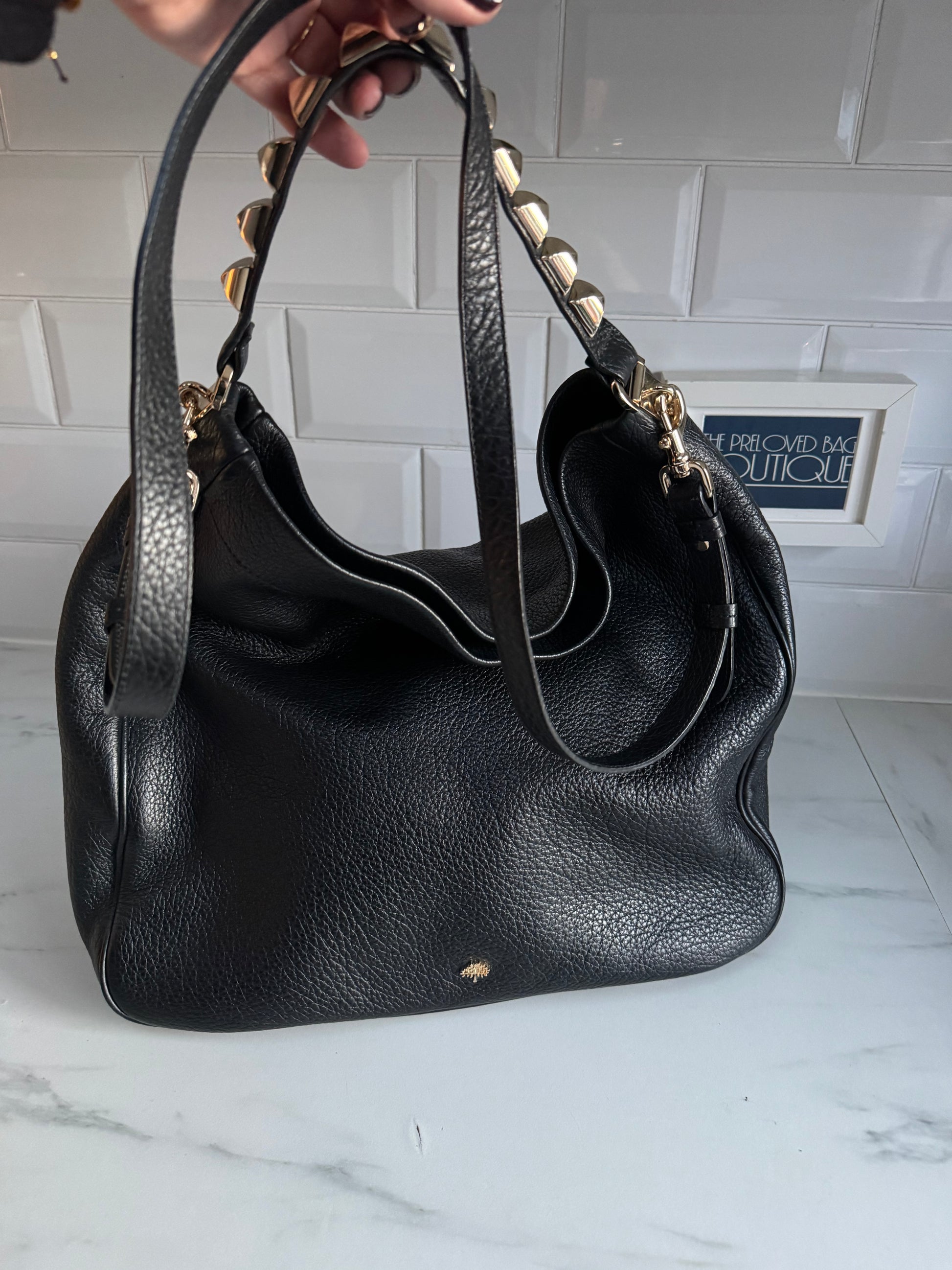 This is beautiful Mulberry Evelina Hobo in Black Large Shiny Grain leather with light gold tone hardware.