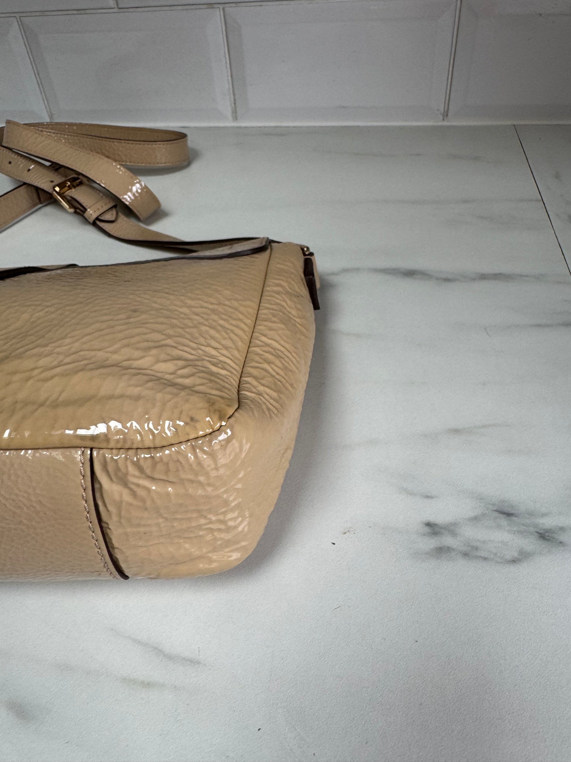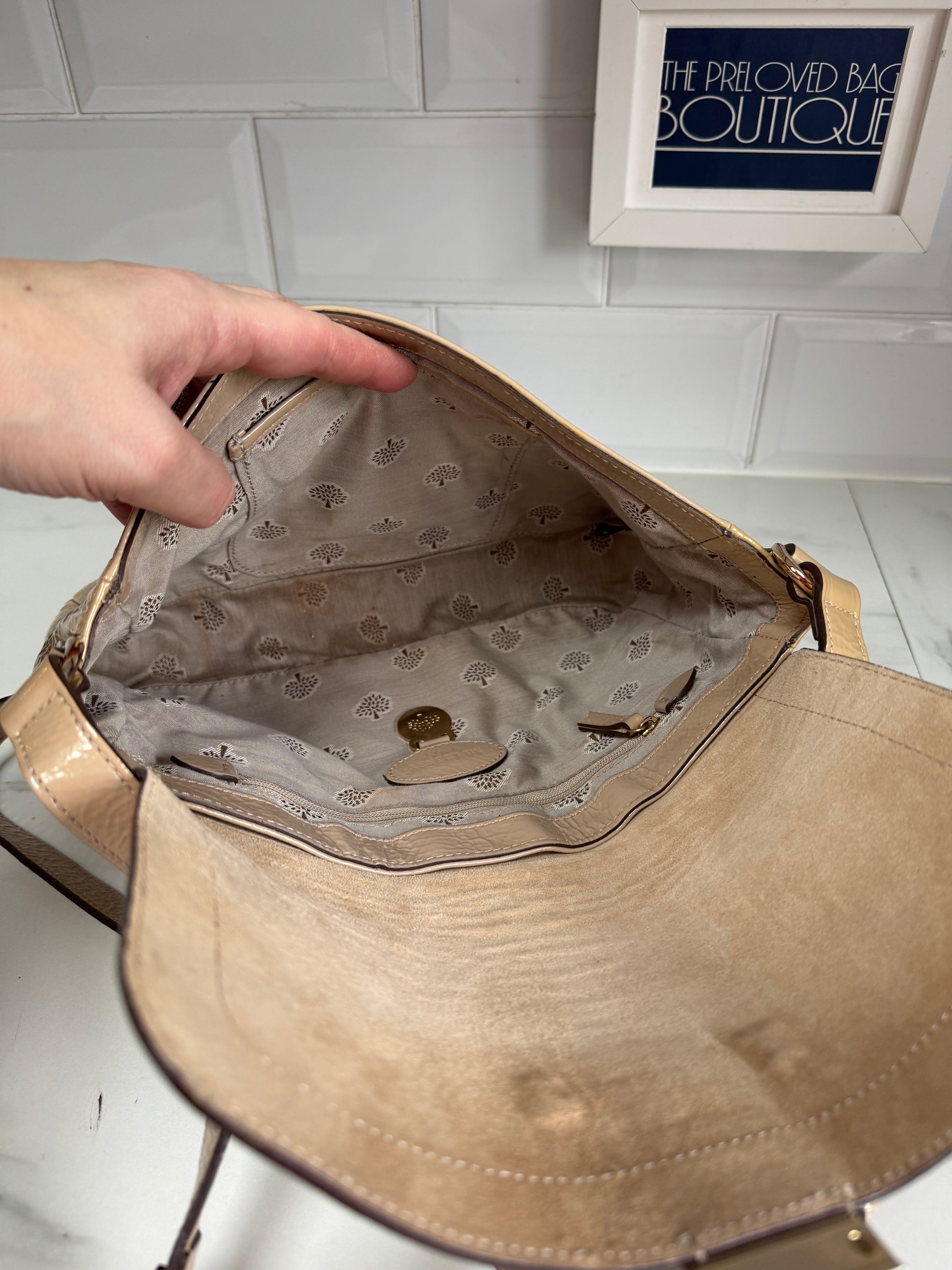 This is a truly understated fabulous Mulberry Harriet Satchel in a Toffee coloured Shiny Patent leather with shiny light gold tone hardware.