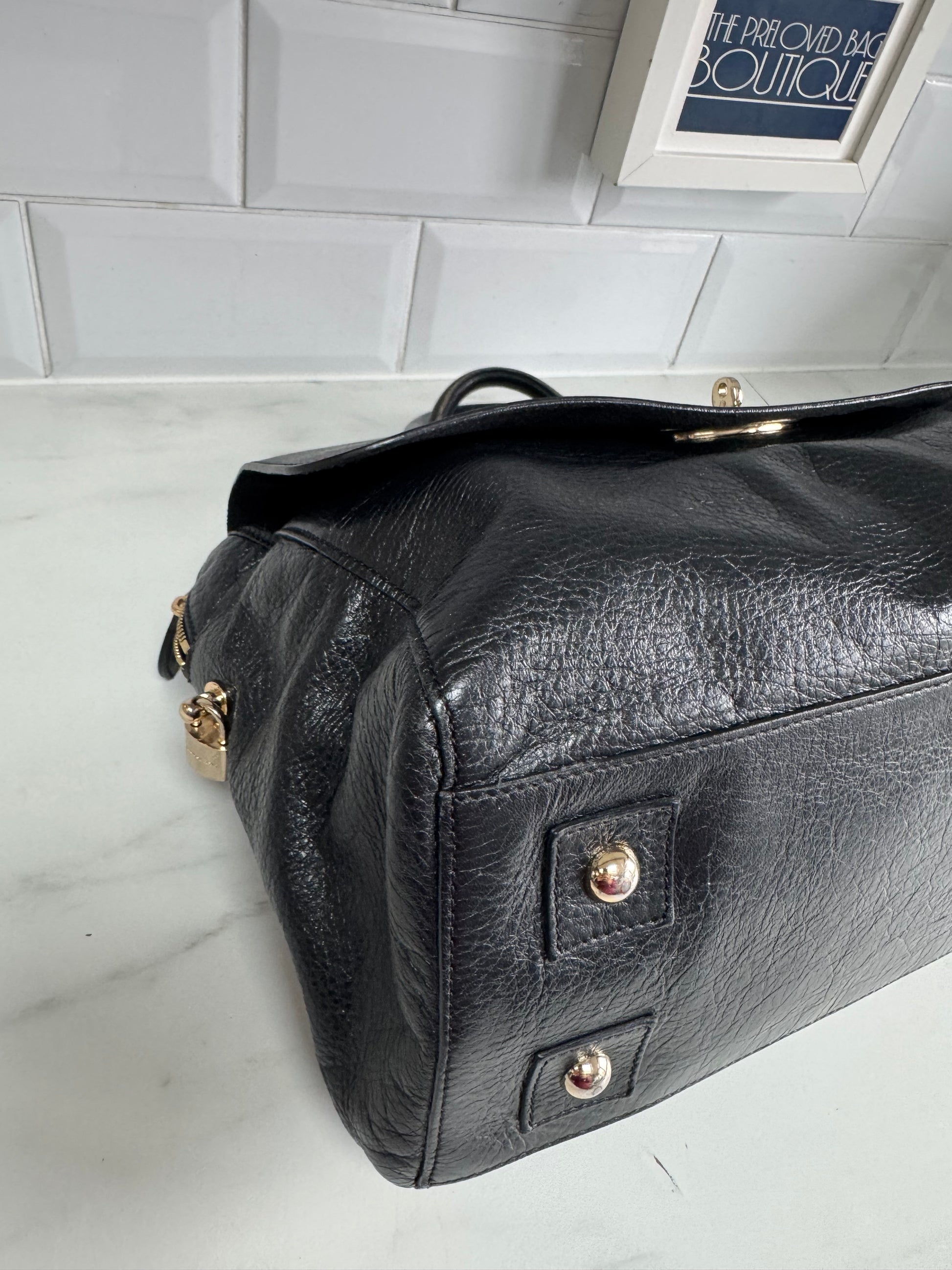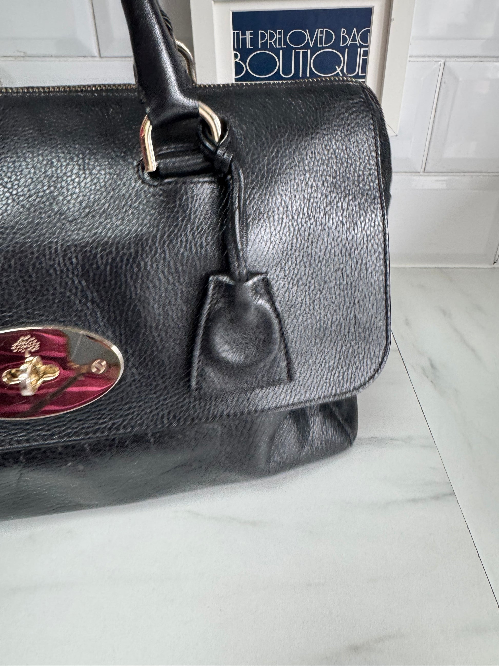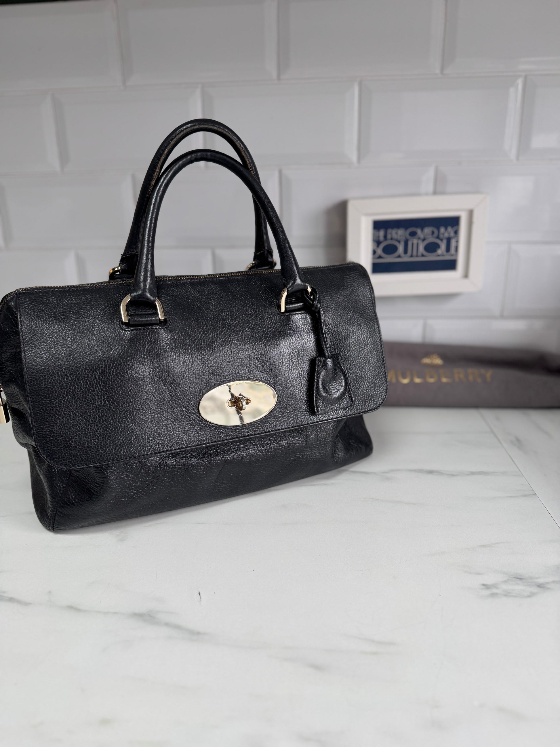 This top handle bag in classic black toned leather is just beautiful.This bag is Preloved but in very good condition.There is a flap on the front with the postmans lock closure and the main compartment closes with a zip top which keeps everything safe and secure.Inside there is a zip pocket and a leather edged slip pocket and it is lined in black tree repeat fabric.This bag is Preloved but is in absolutely fantastic condition.The hardware is nice and shiny and the padlock comes with the bag too.