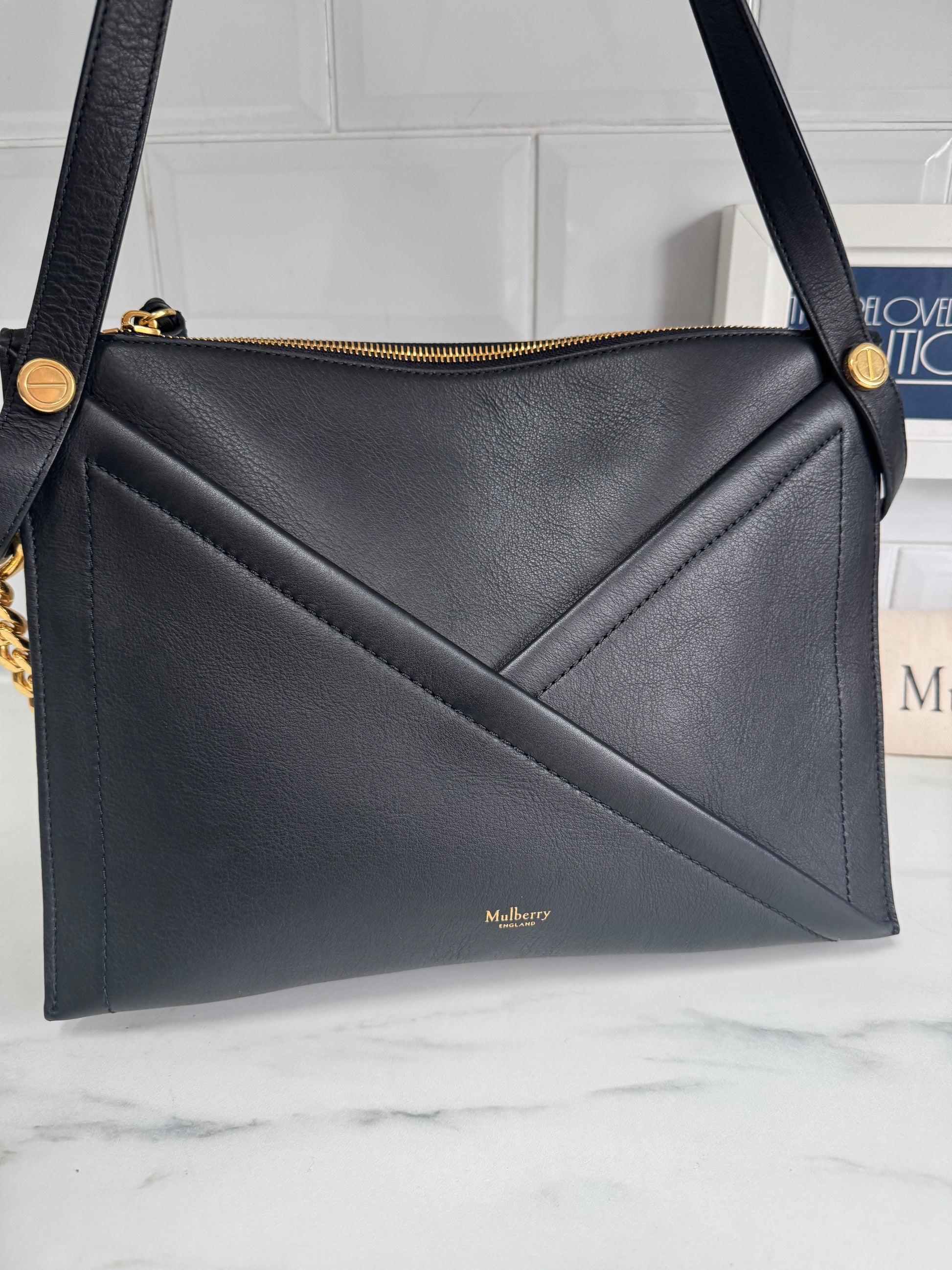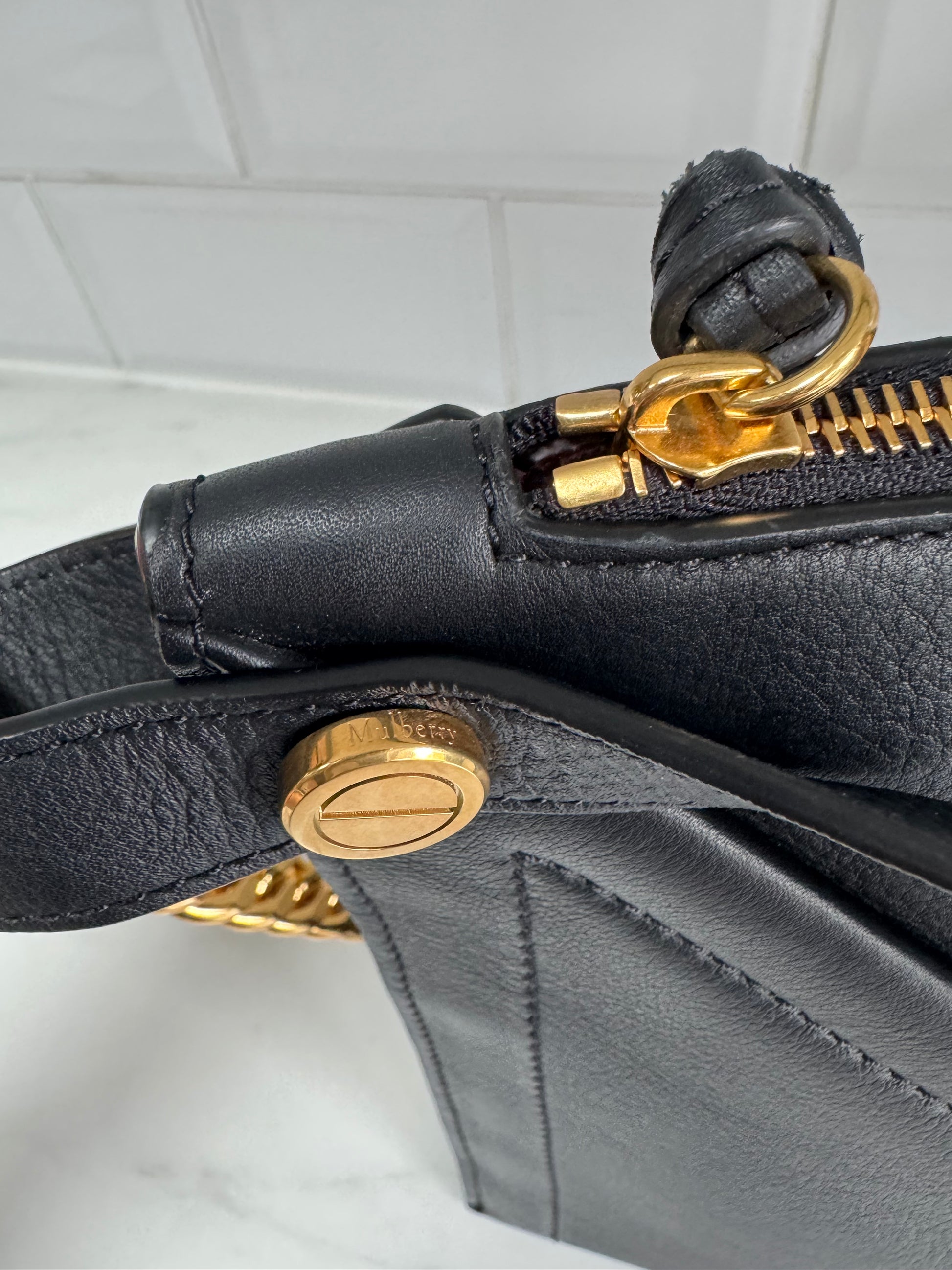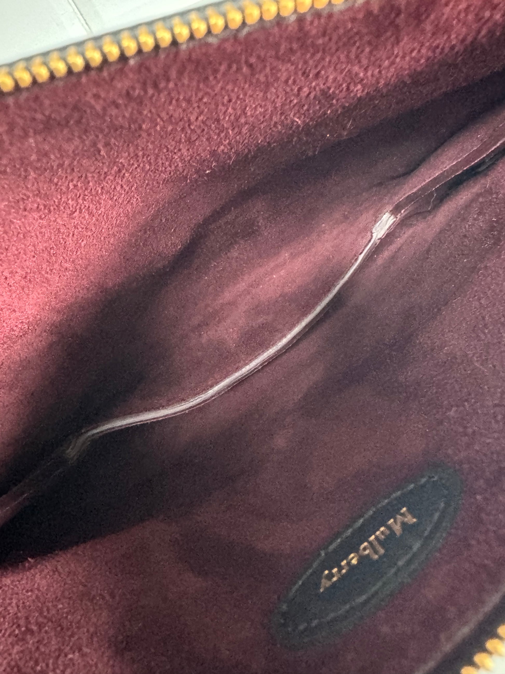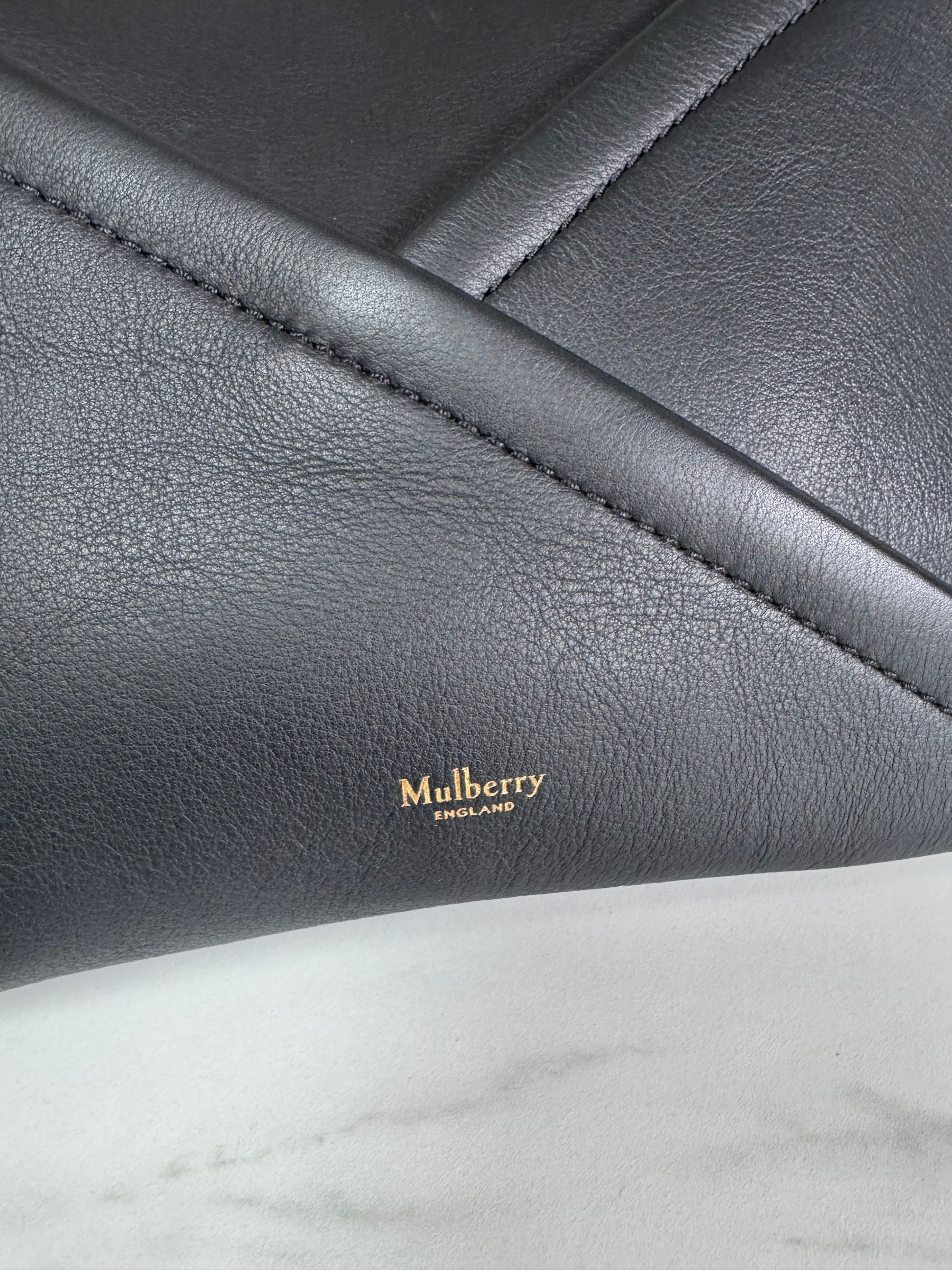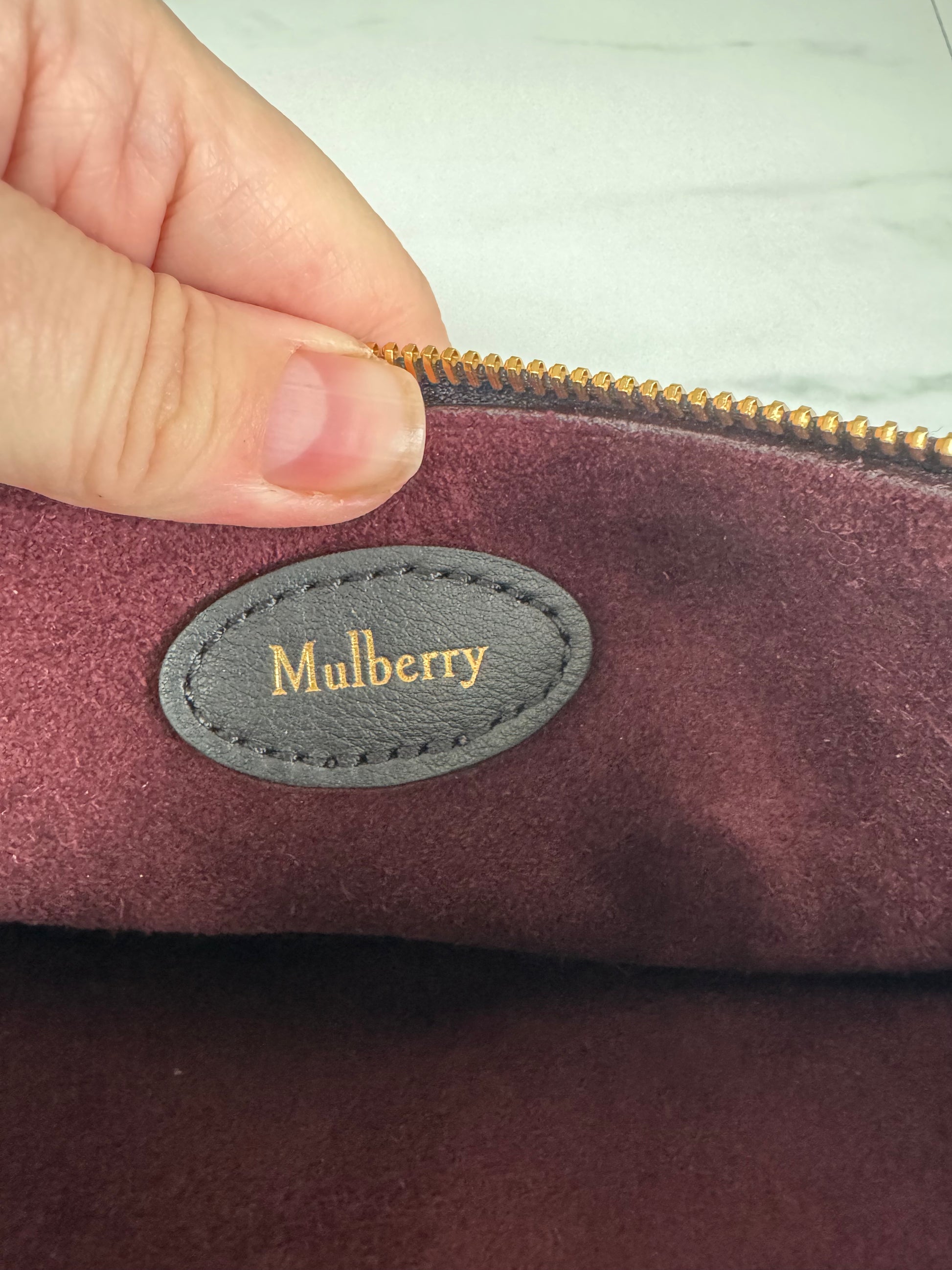 This is a gorgeous Mulberry M Zipped Pouch in black Leather with an antique gold tone hardware finish.
