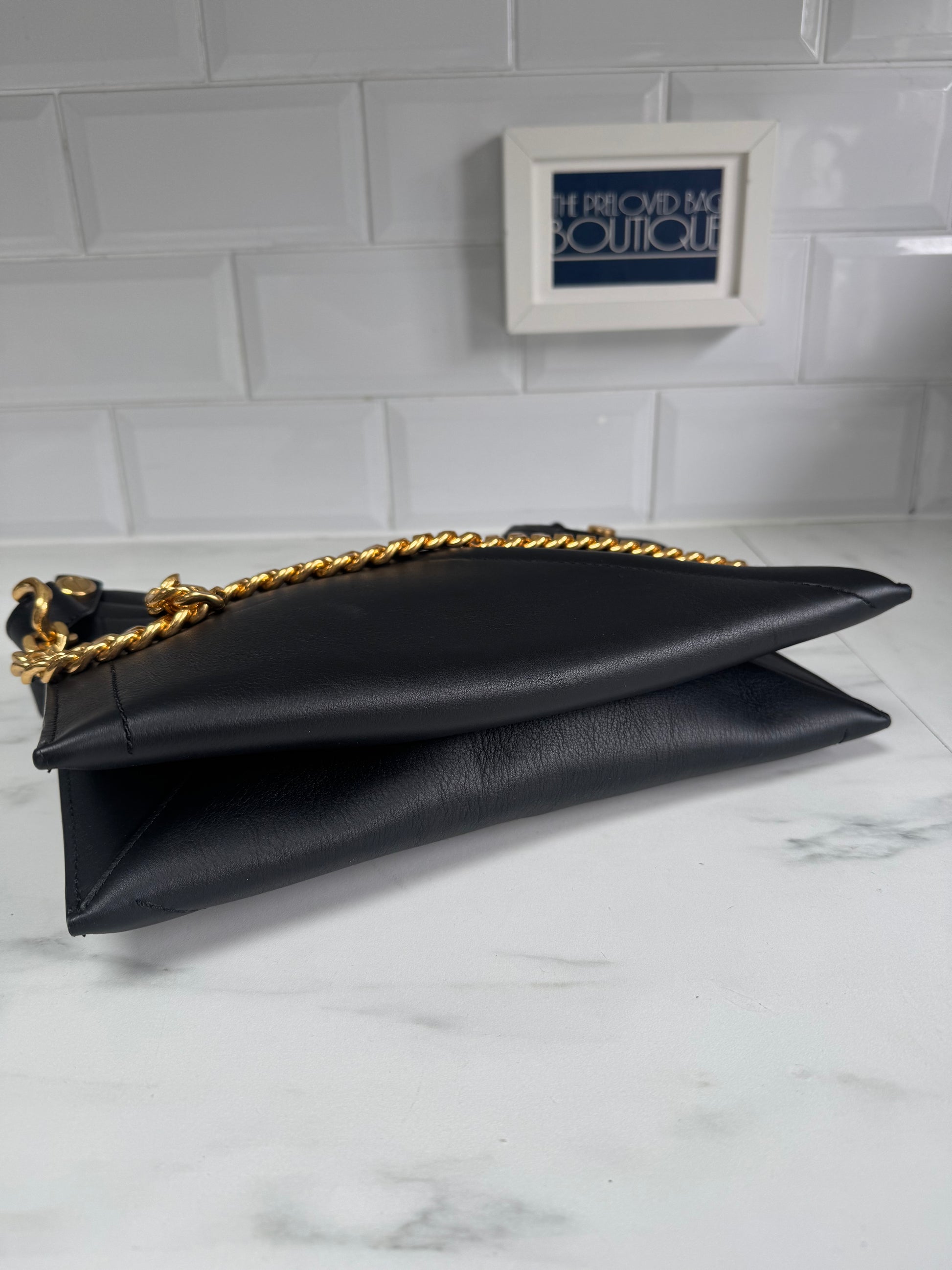 This bag is just beautiful!It is Preloved but in AS NEW condition, never been used. there is a Zip top closure with long leather zip pulley.One leather and one chain shoulder strap with pivoting screws on each side. Beautiful decorative stitching on the exterior. The interior is lined in a contrasting oxblood microfibre.The chain strap on this is just gorgeous and the overall look isbeautiful.