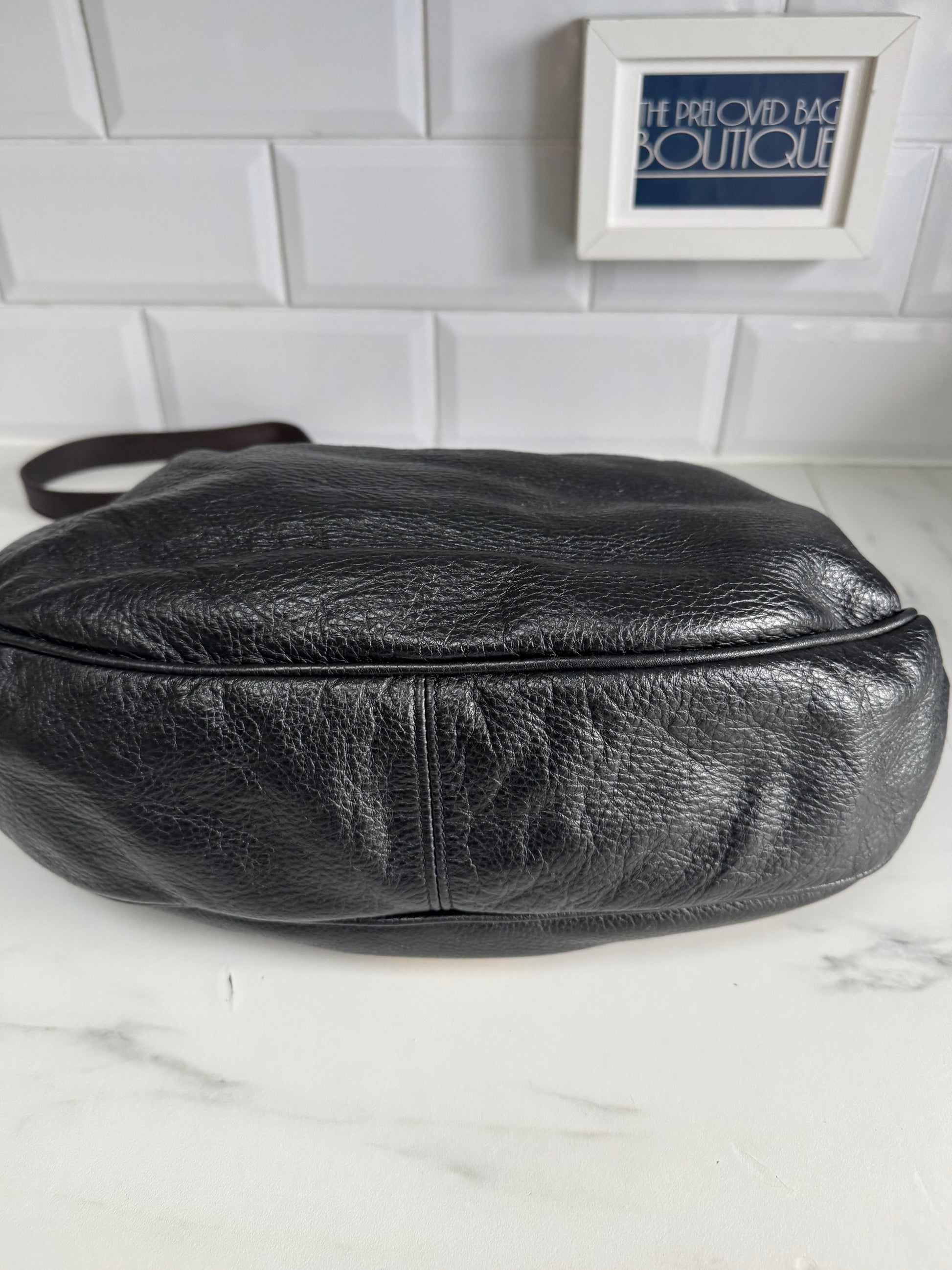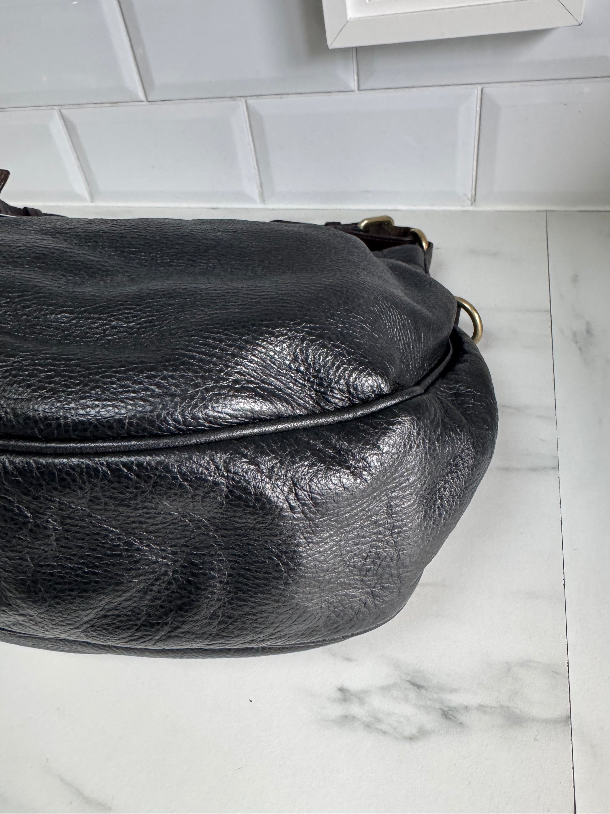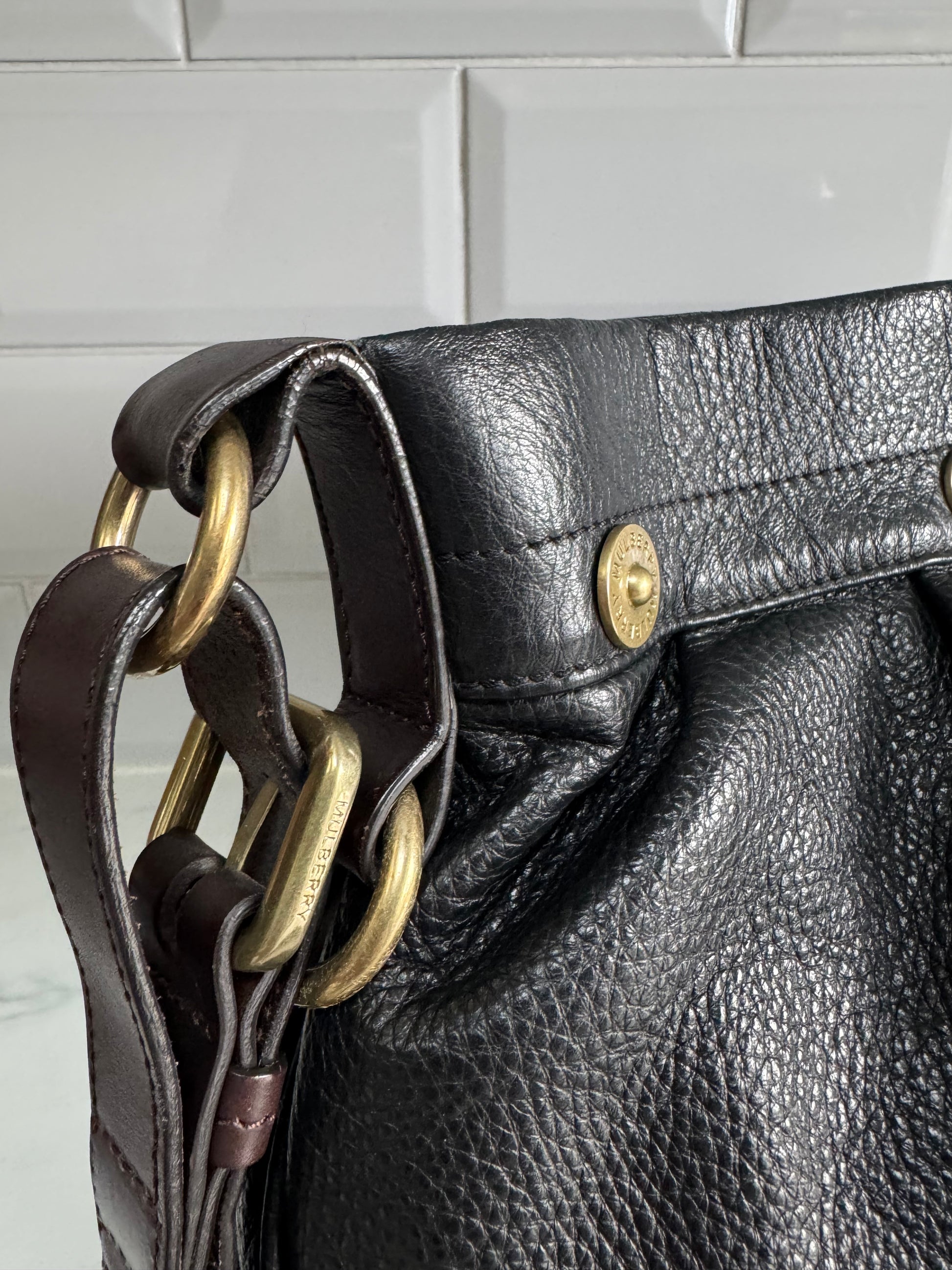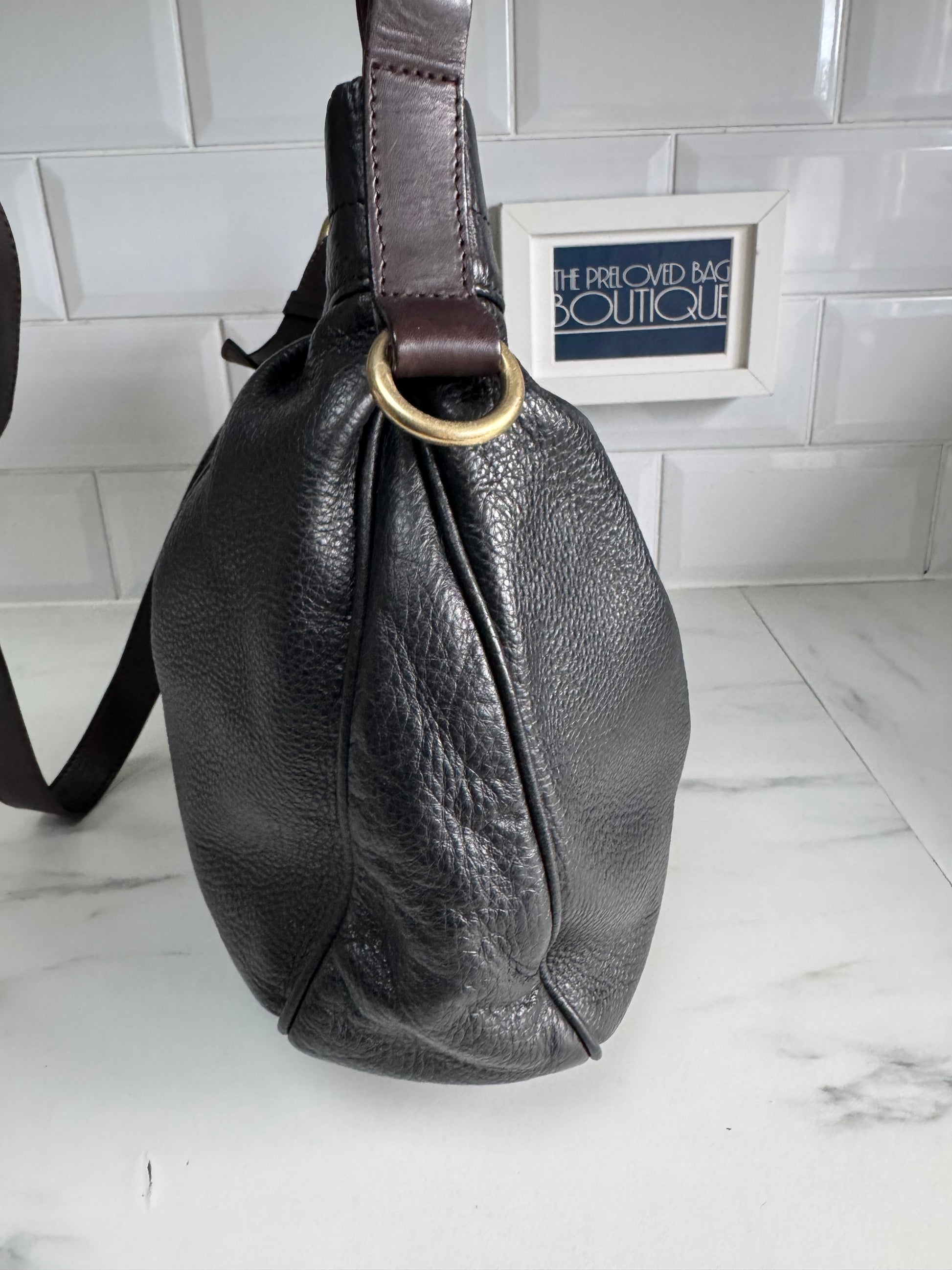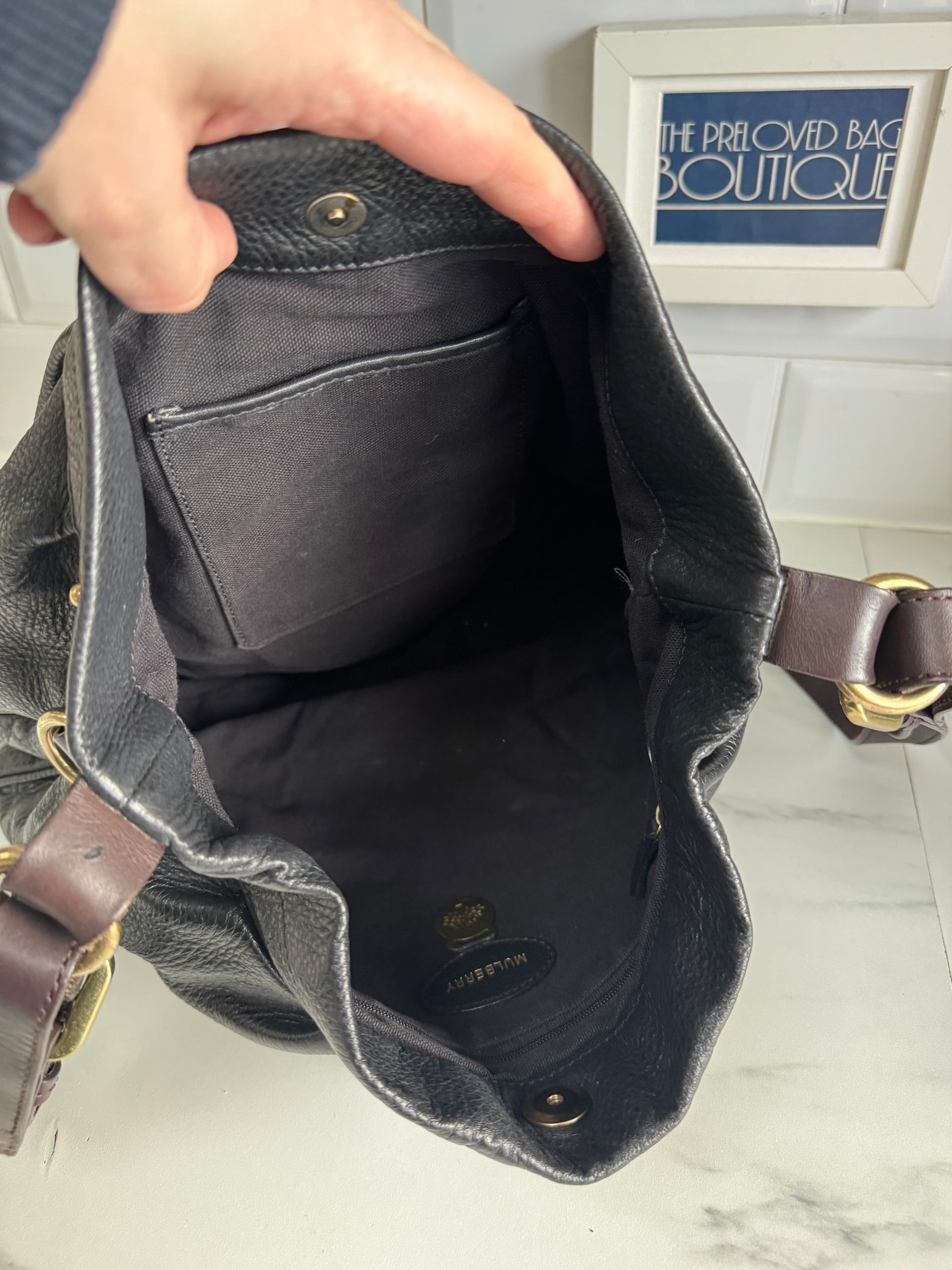 This is a really great Mulberry Mitzy messenger in amazing Black pebbled leather with chocolate brown leather accents and brass tone hardware.