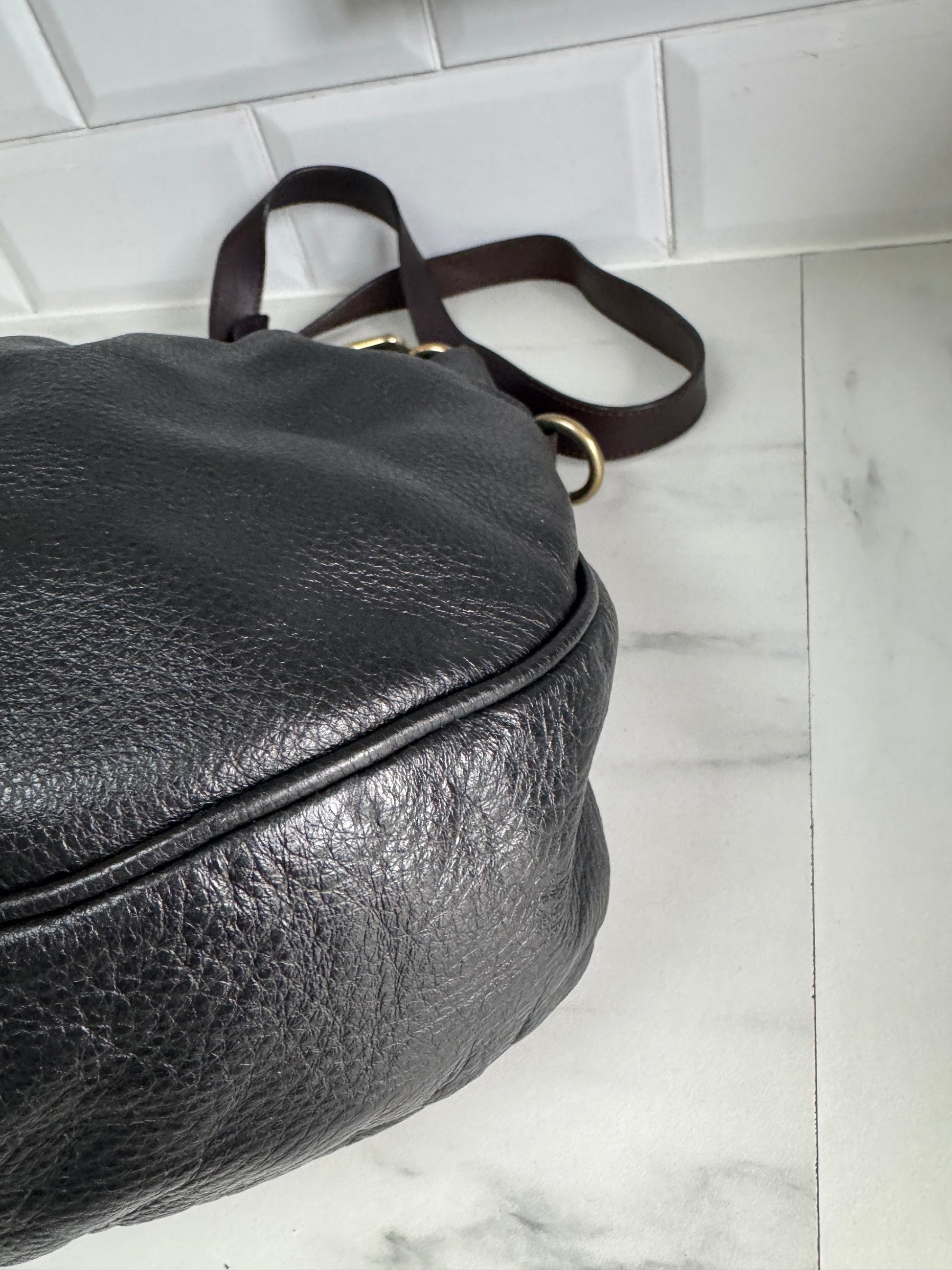 It is a lovely black, buttery soft pebbled leather. It has brass tone hardware, including the front plate on the face of the bag and there are brass rivets all the way round the top for decoration.The long chocolate brown shoulder strap is adjustable and the interior is lined in black cotton twill fabric. There is an internal leather edged slip pocket and a zipped pocket inside.The bag closes with a magnetic popper towards the top.