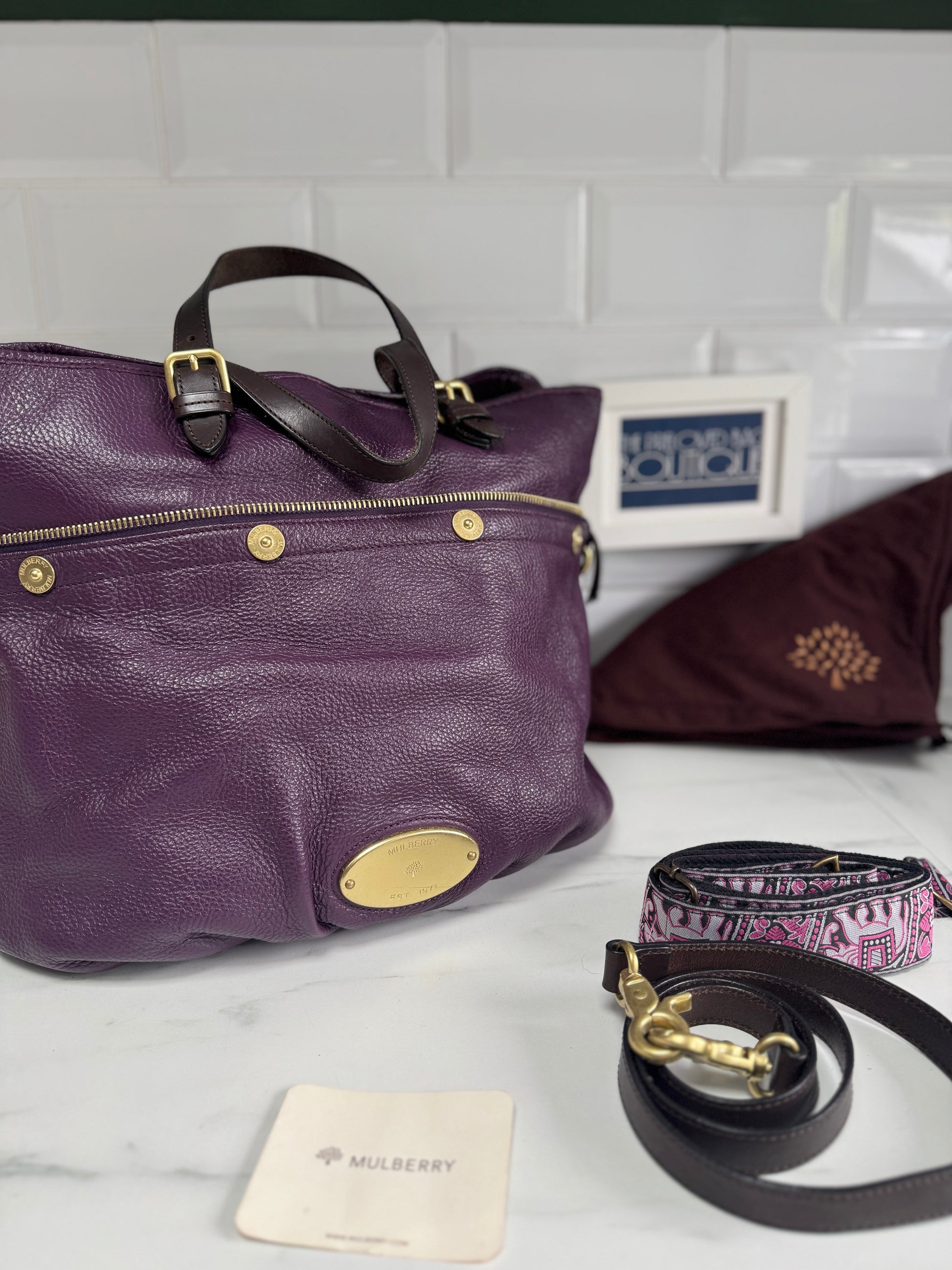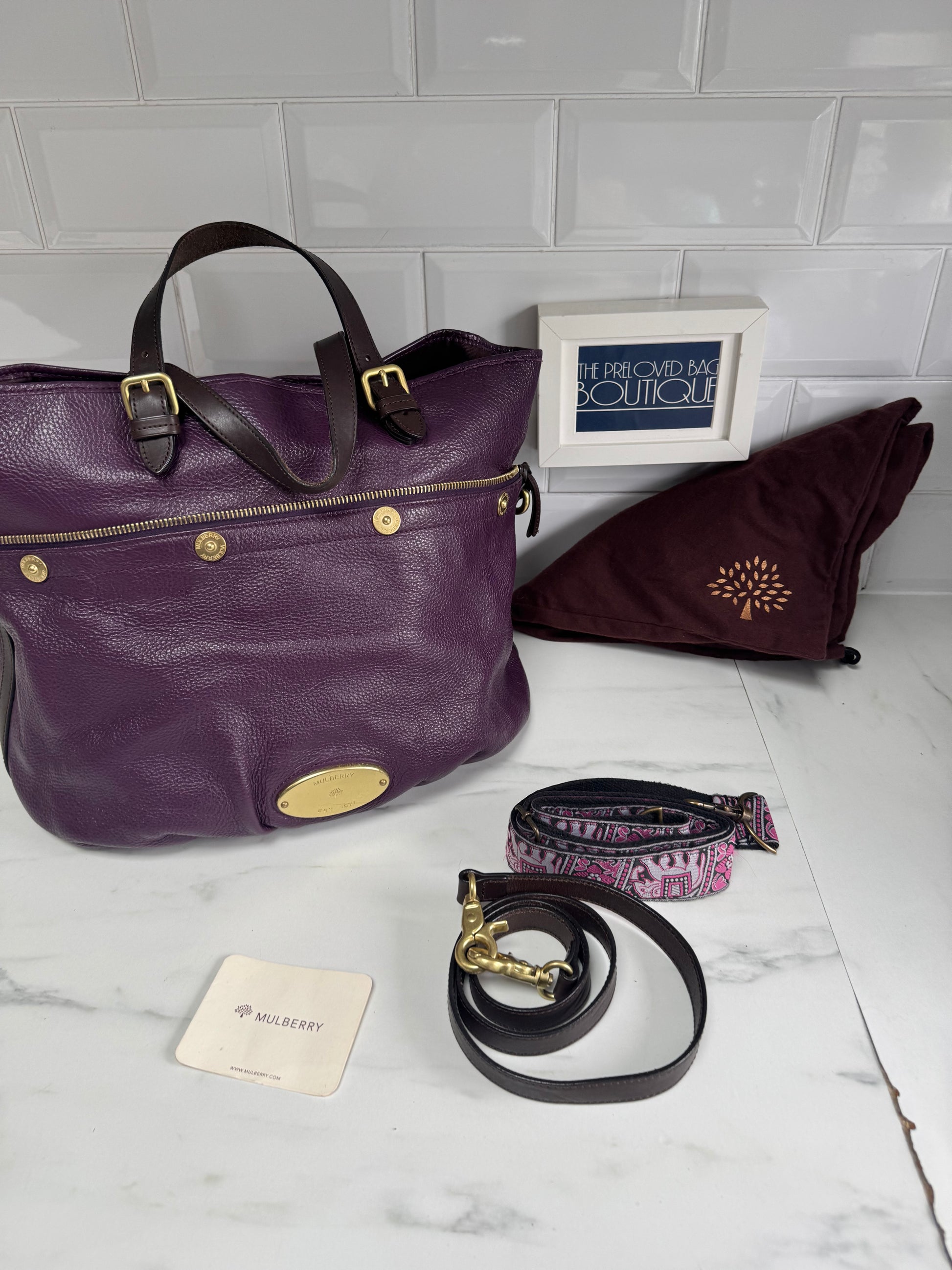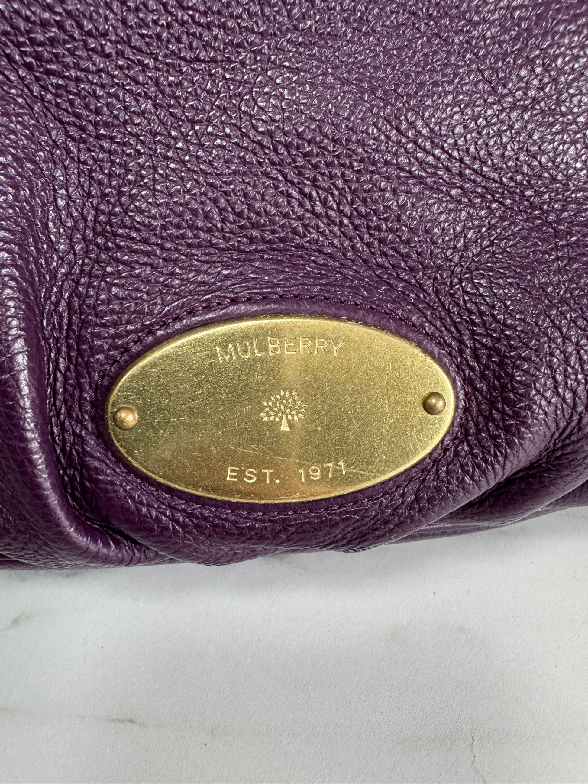 A absolutely beautiful, Mulberry Mitzy tote in wonderful Eggplant pebbled leather, brass tone hardware, chocolate leather accents and a long detachable leather strap.