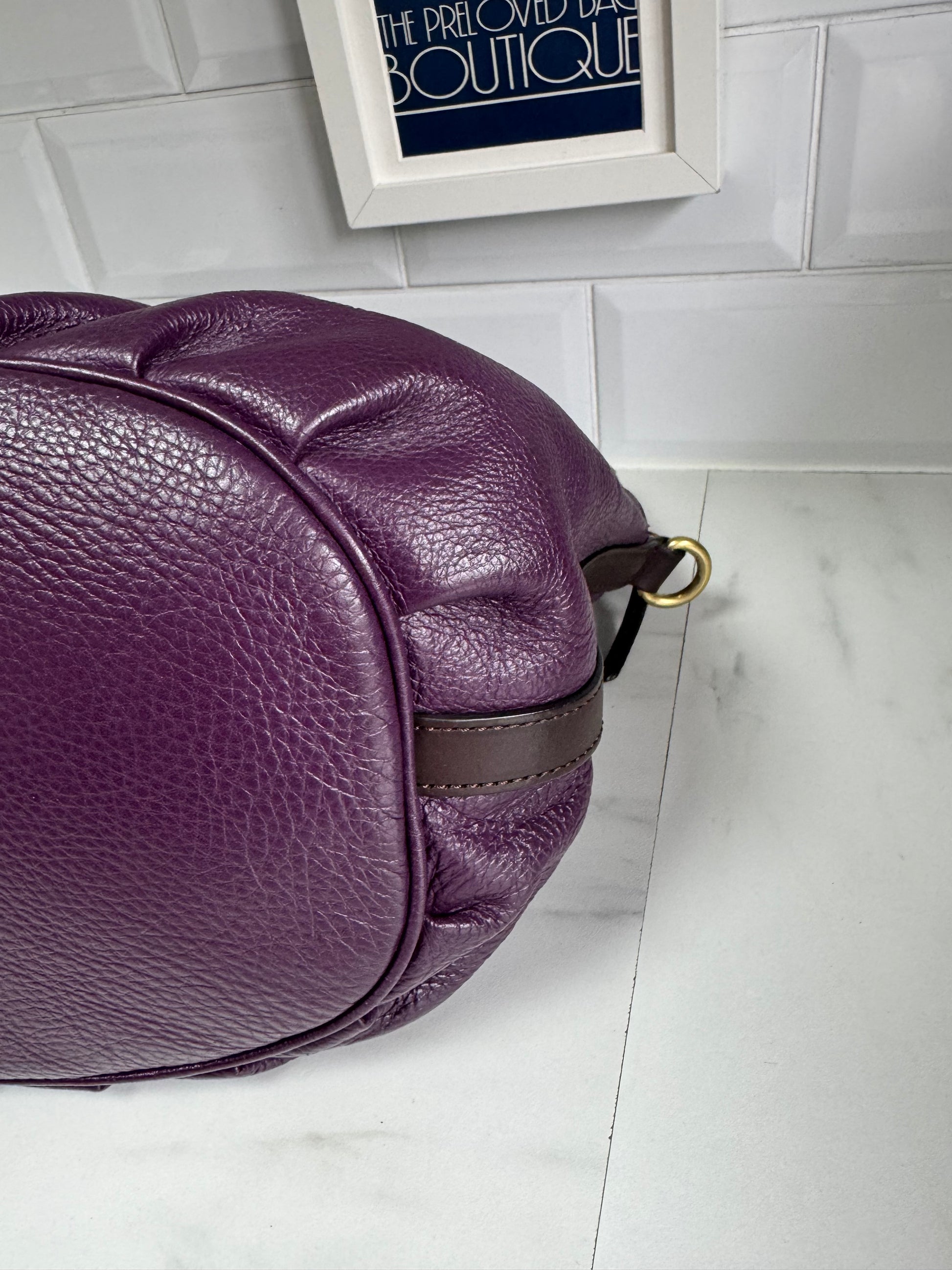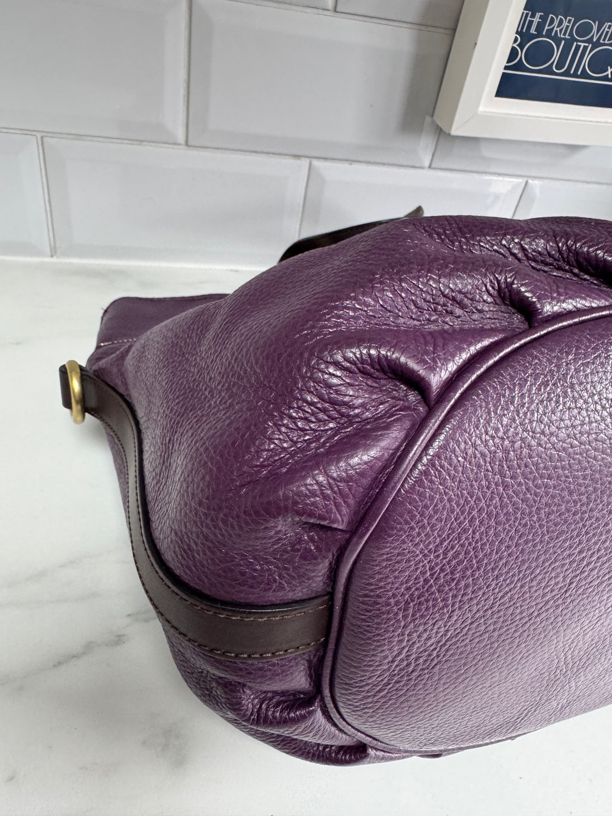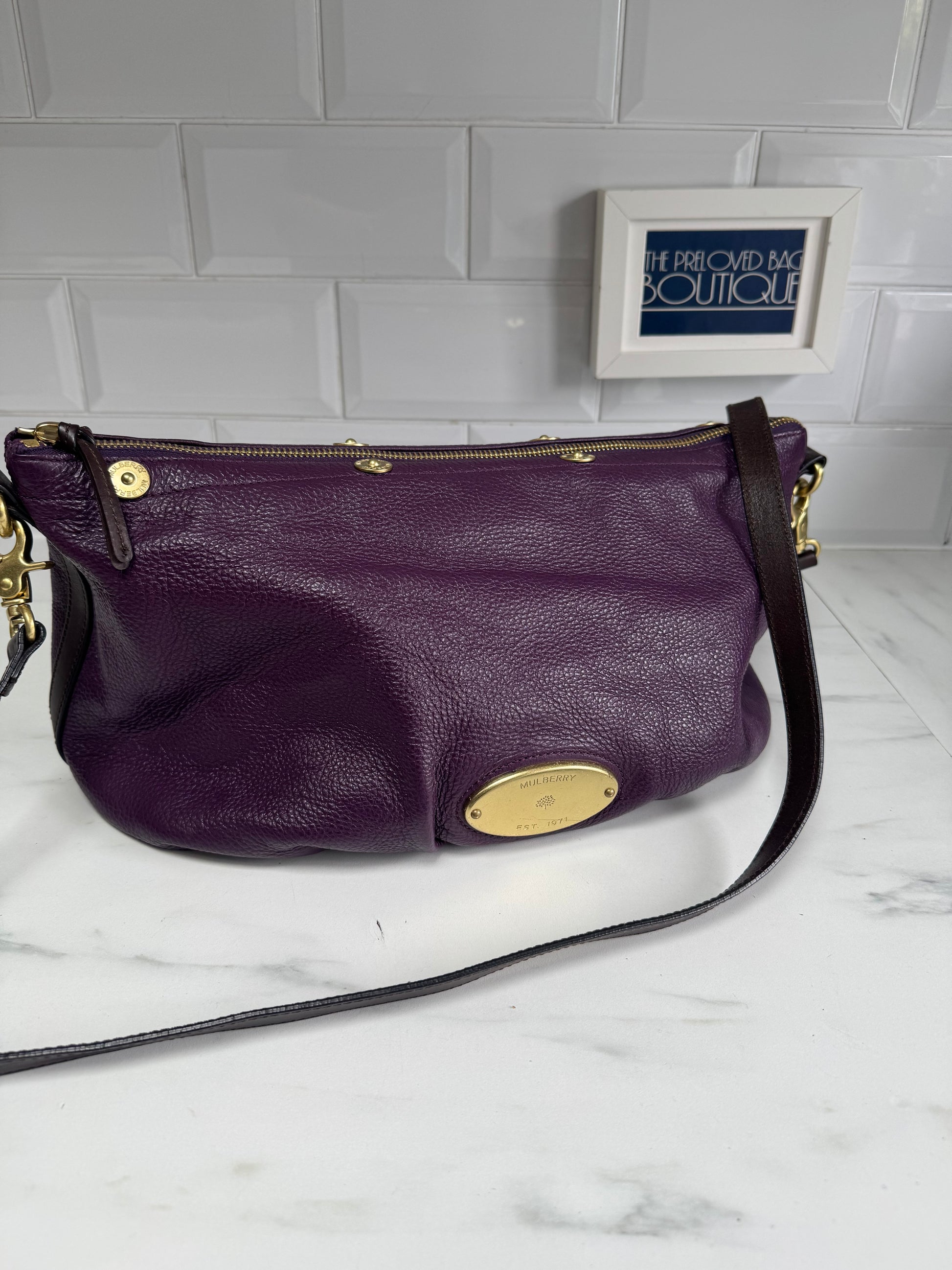 A absolutely beautiful, Mulberry Mitzy tote in wonderful Eggplant pebbled leather, brass tone hardware, chocolate leather accents and a long detachable leather strap.