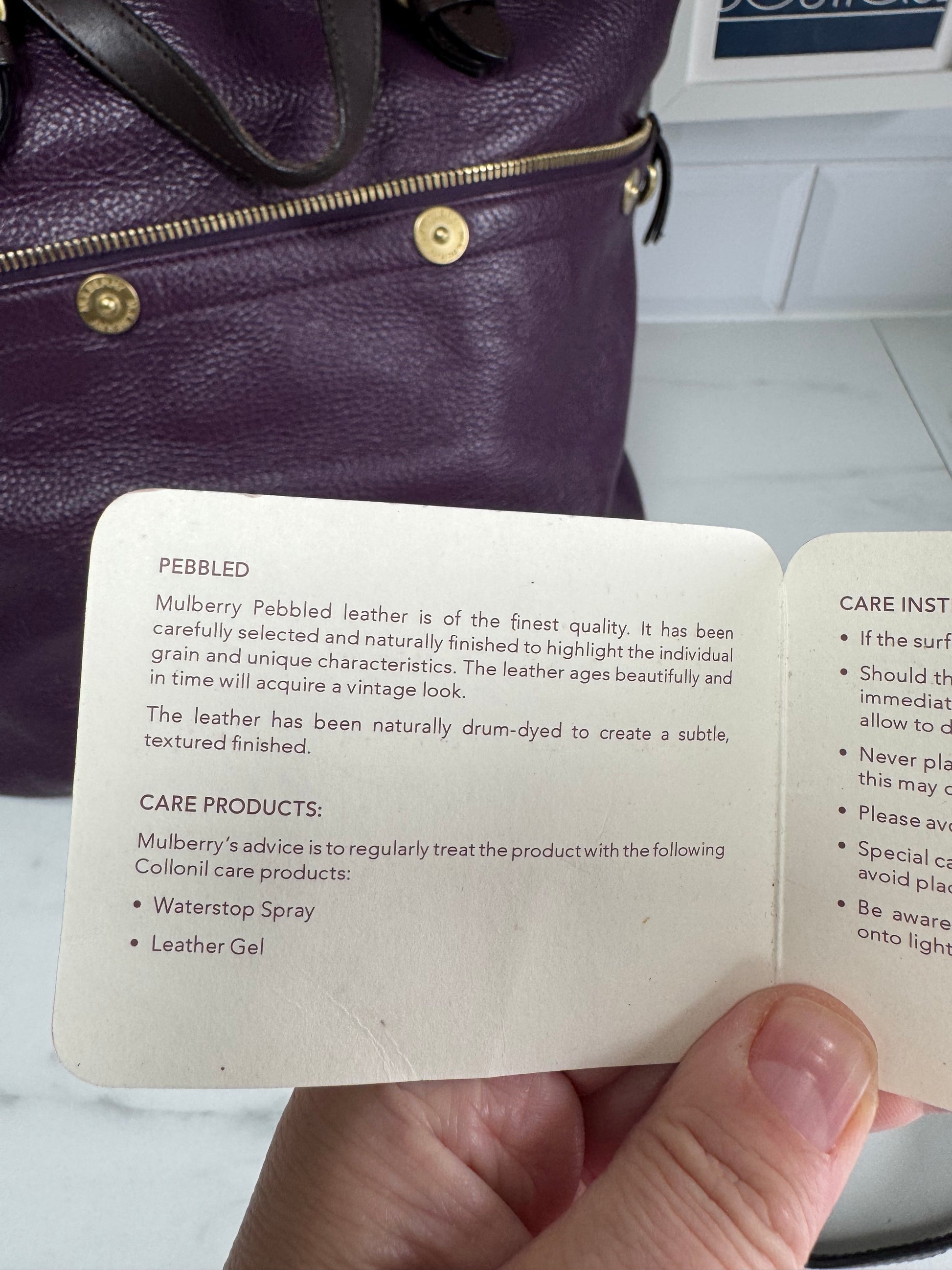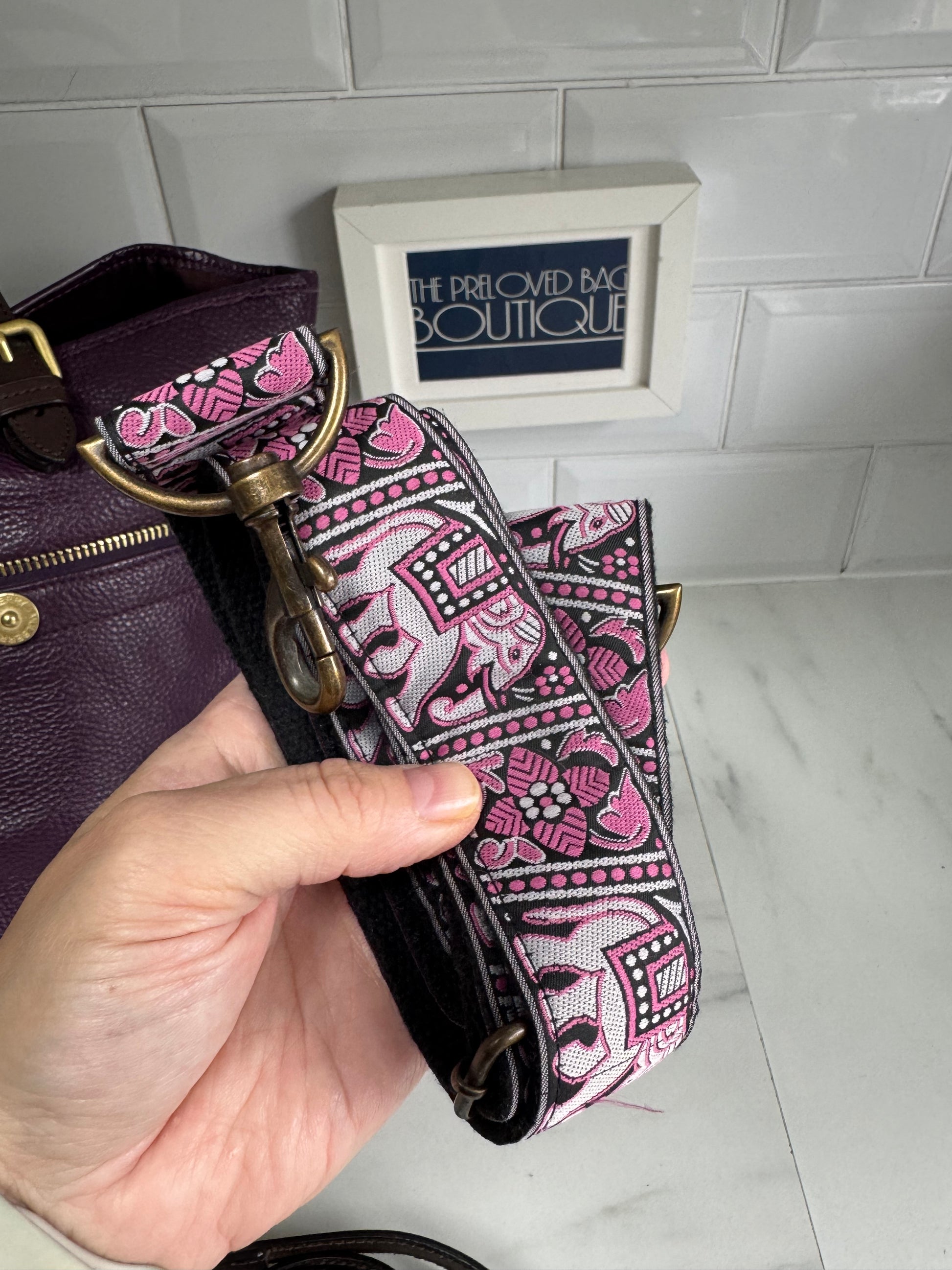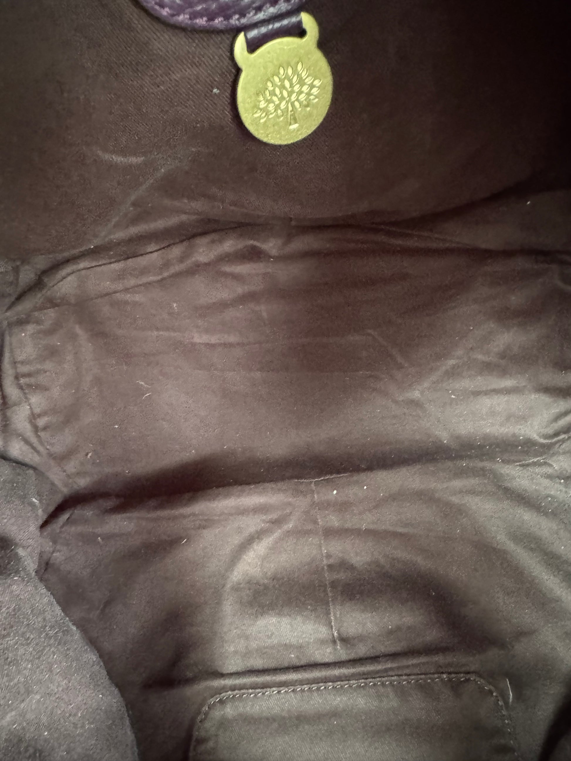This bag is Preloved but in excellent condition.There are no signs of wear externally or internally.The interior is lined in chocolate brown cotton lining. The leather trims are also a rich chocolate brown and the top handles and long strap are in very good condition. The front oval plaque and brass rivets are all in great condition and inside there is a zipped pocket as well as a leather edged slip pocket.