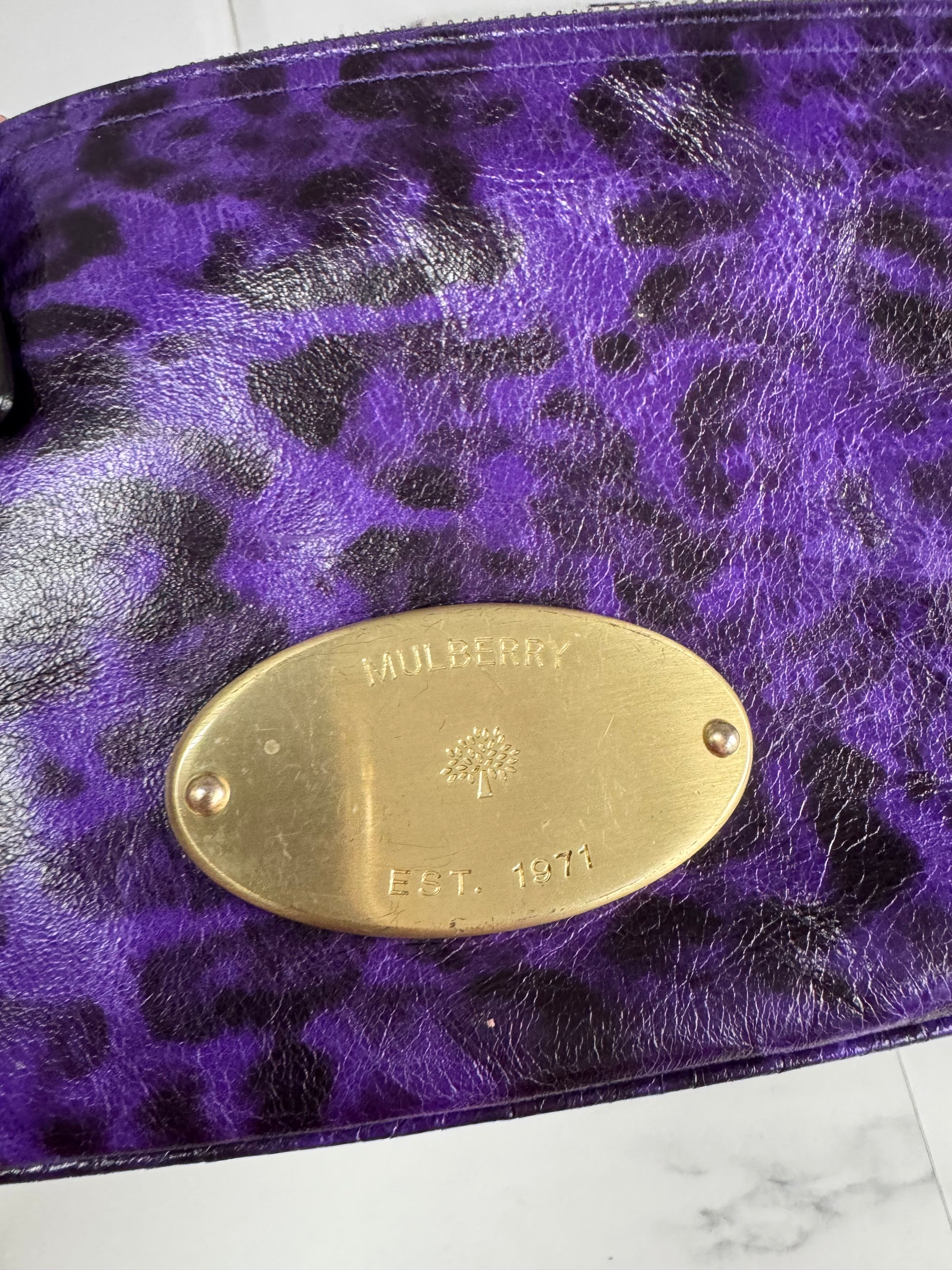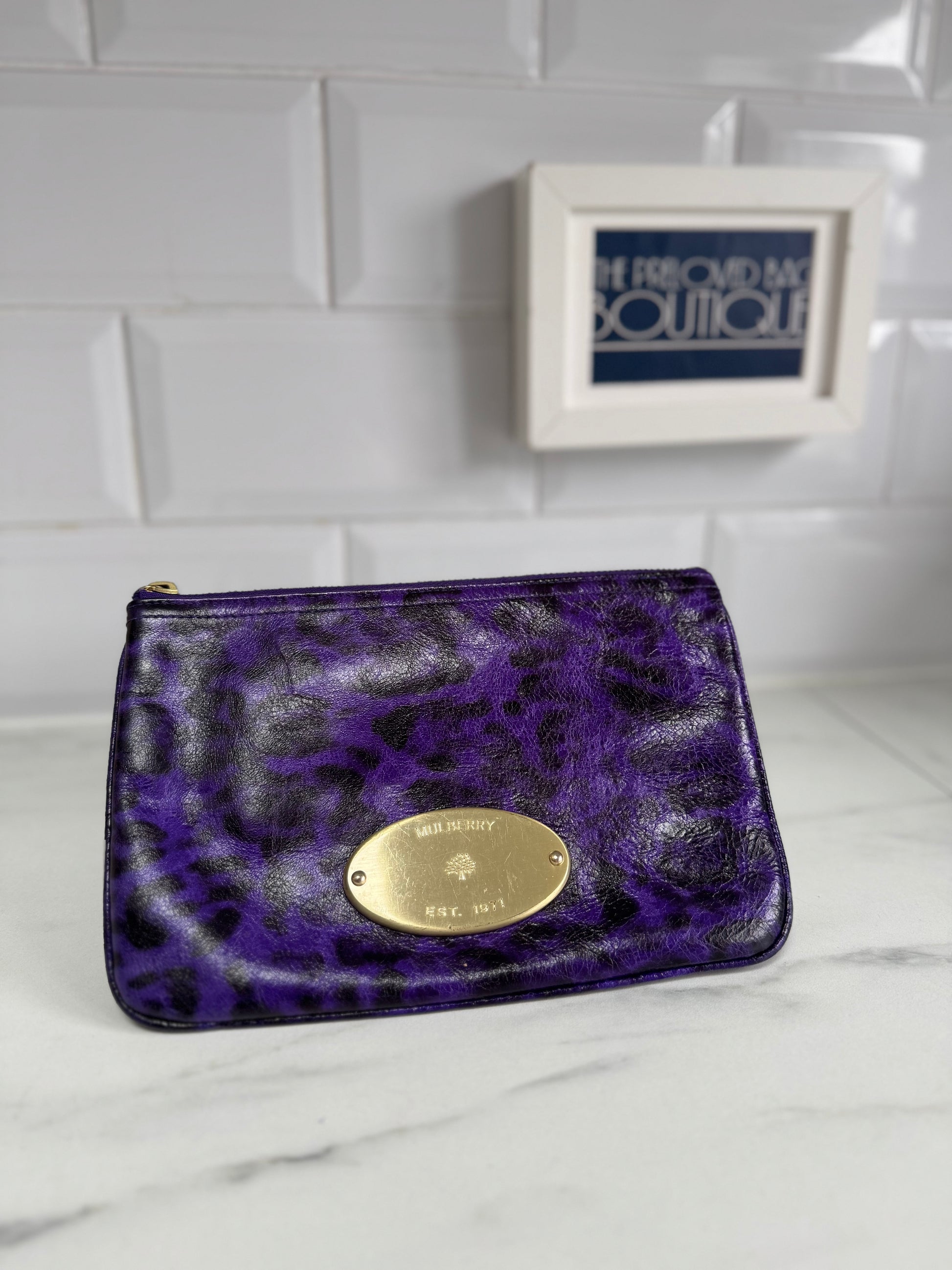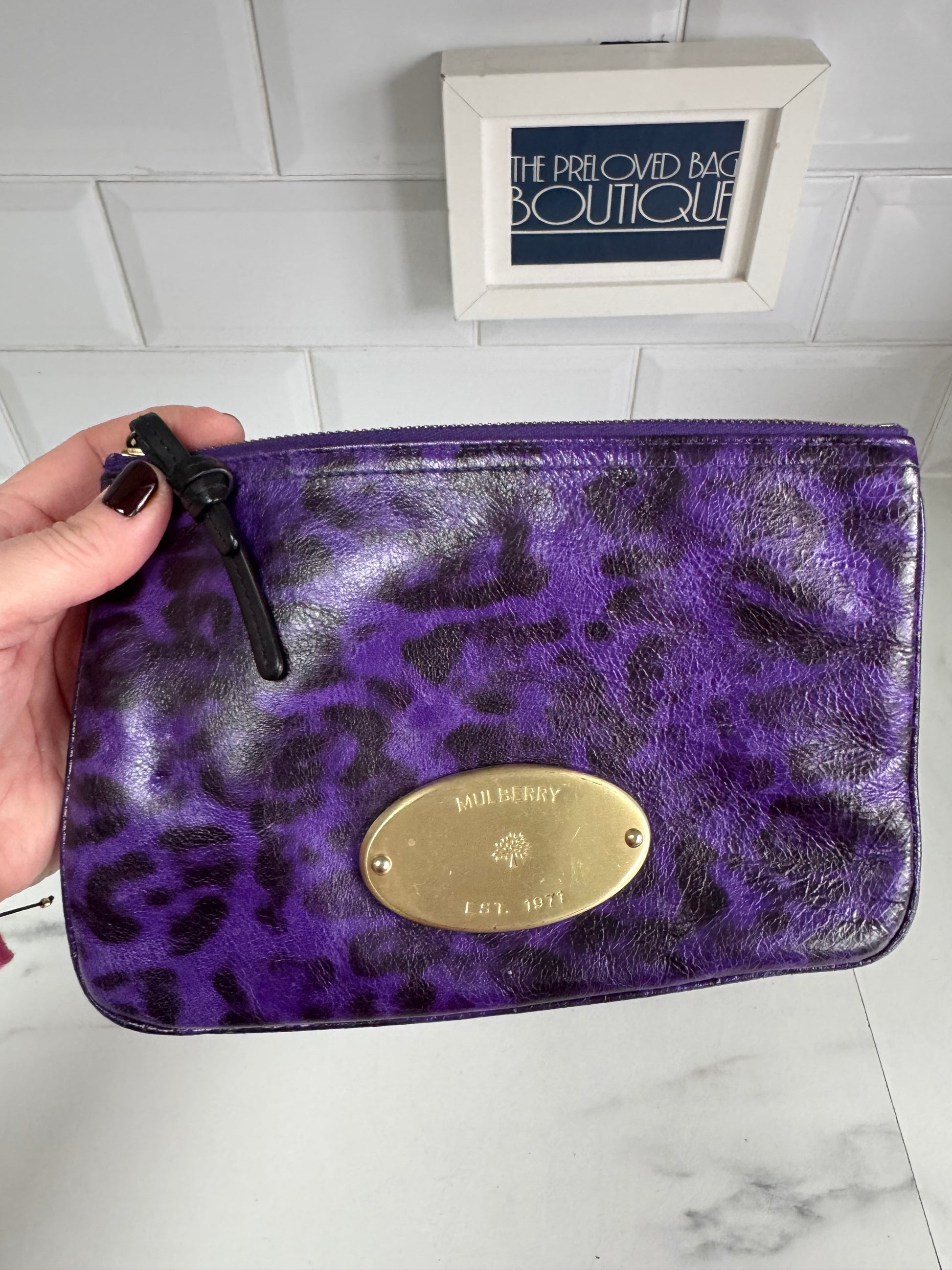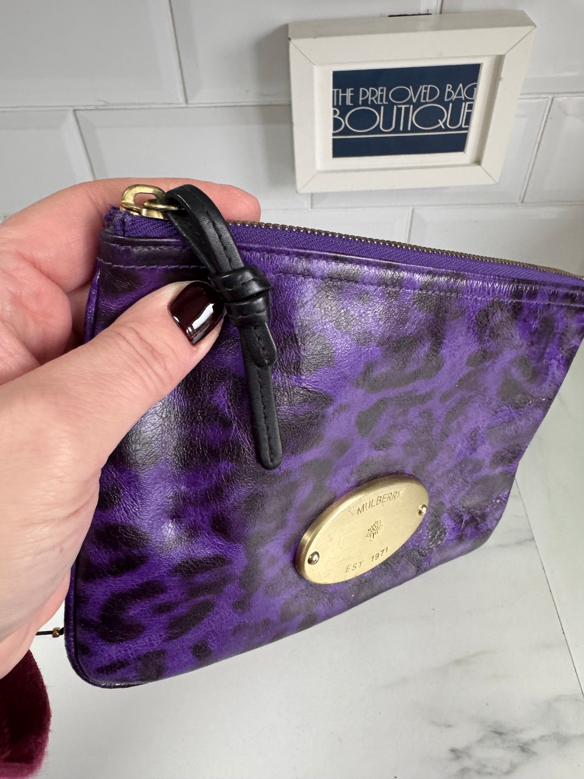 A super handy Mulberry zipped Mitzy pouch in purple pebbled leather with brass tone hardware.