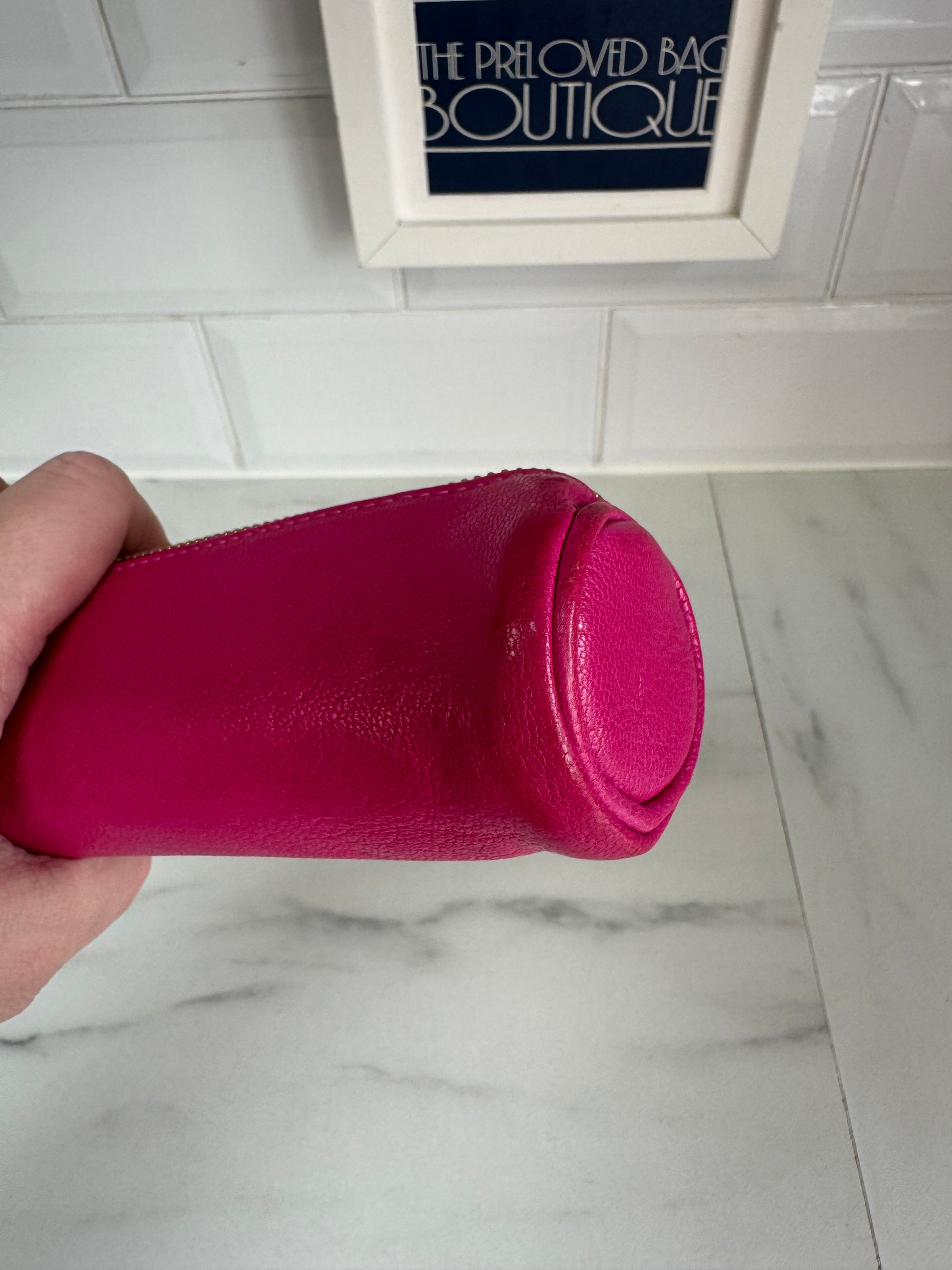 This is quite a rare vintage item.A Mulberry Postmans Lock Small Barrel Pencil case/ make up bag in Pink glossy goat leather with golden brass tone hardware.