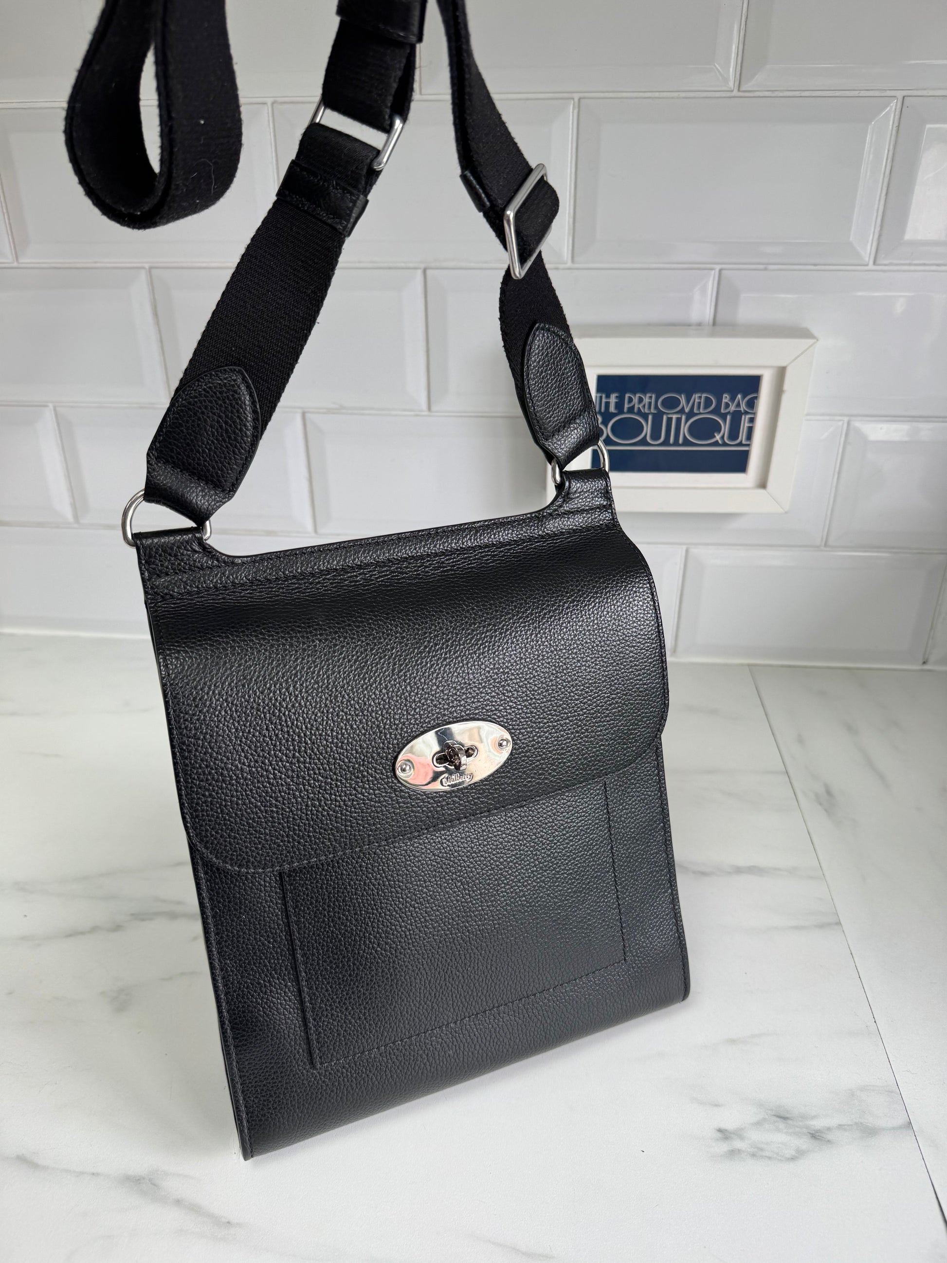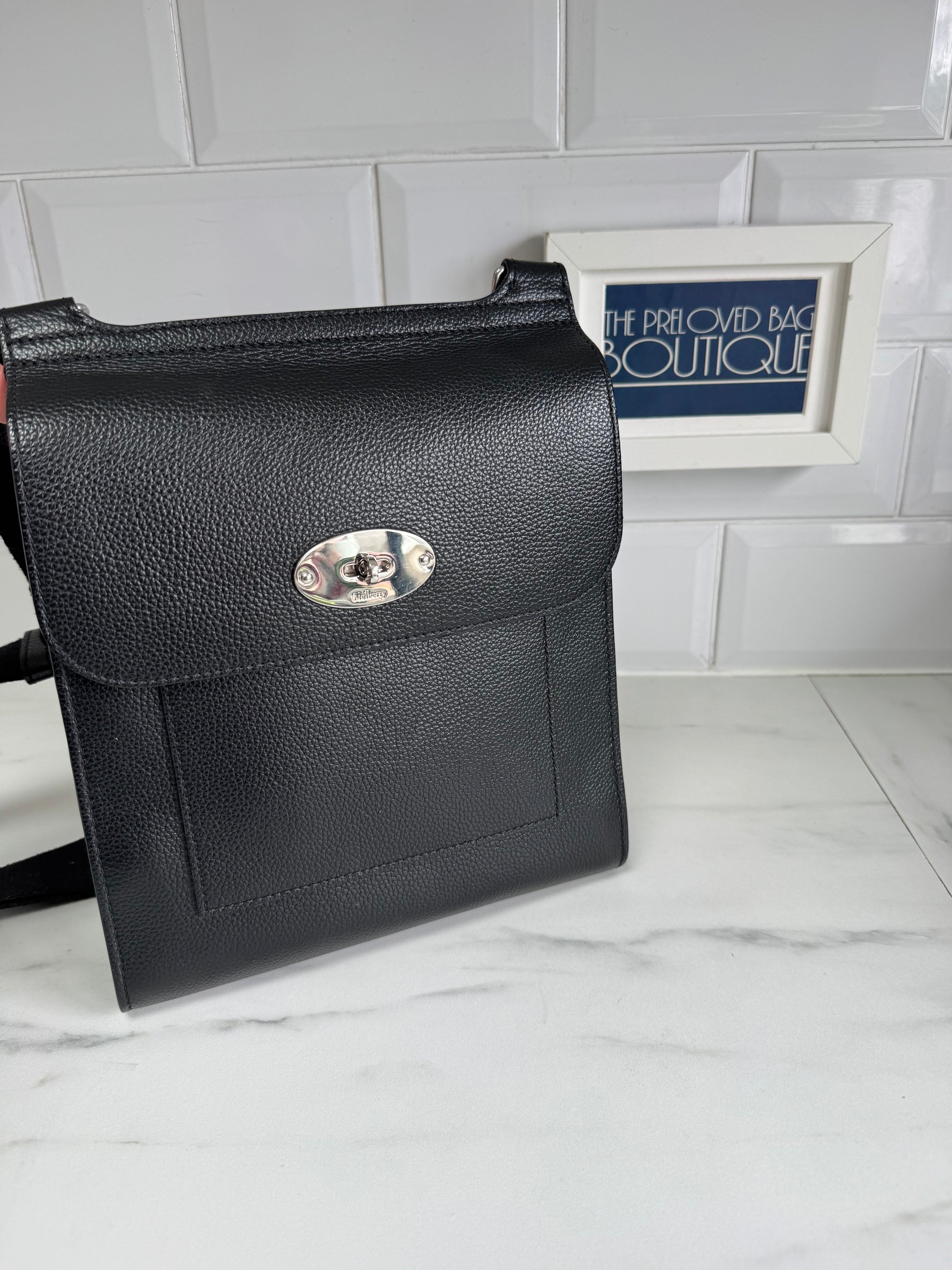 This a beautiful small Mulberry Antony in black small classic grain leather with a silver tone hardware.The Small Antony is a perfectly practical hands-free style and has an adjustable long leather strap that can be worn across the body or over the shoulder.
