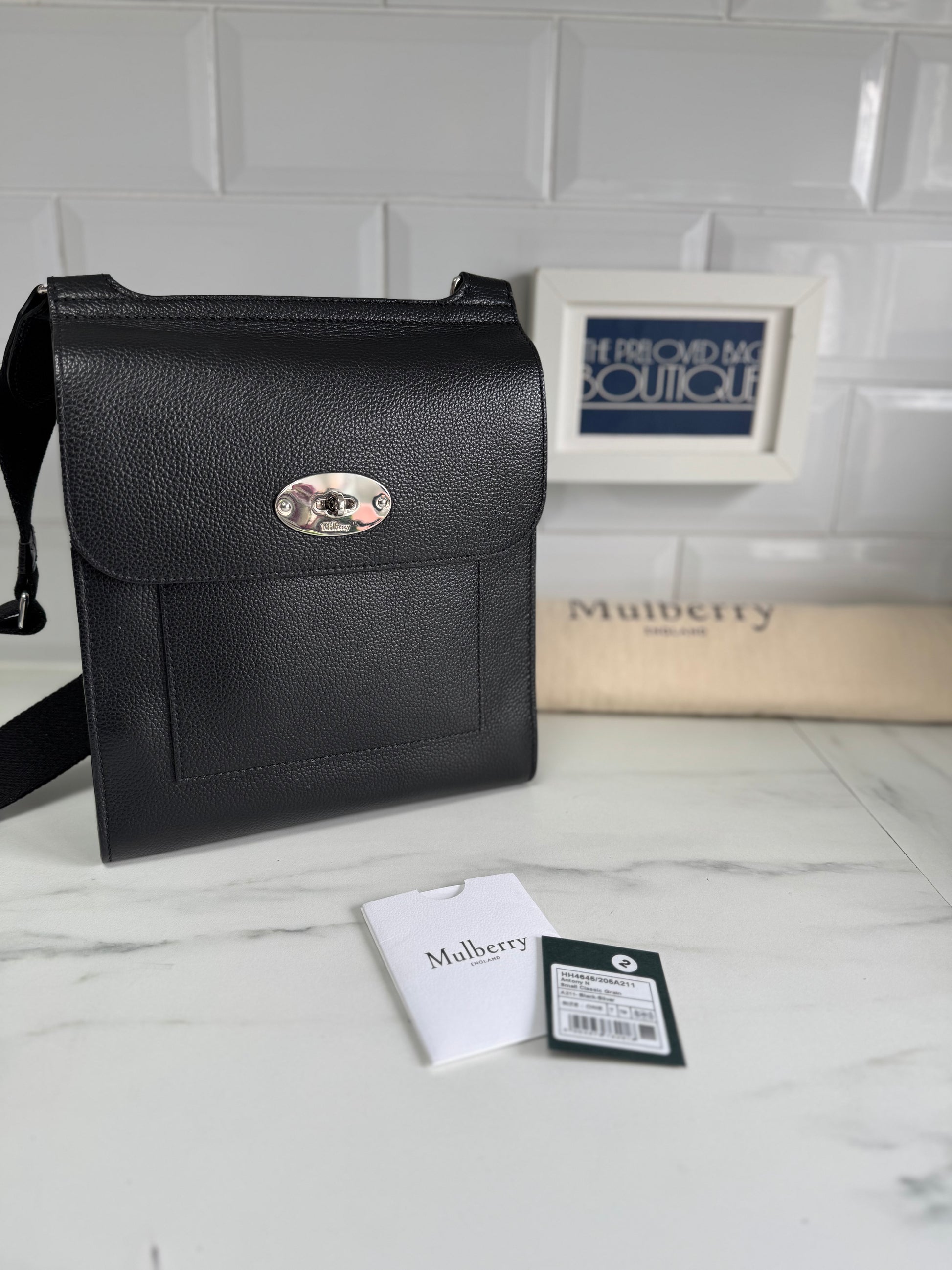 This bag is Preloved but is in excellent to as new condition.The blqck small classic grain leather has a small printed grain effect and the leather is lightly finished to protect the grain’s surface and is just absolutely beautiful!This bag has the iconic Postman's Lock closure on the top flap and Silver tone Hardware Finish.There is one main compartment, an external slip pocket and the interior is lined in grey herringbone cotton.The underside of the top flap is lined in black suede.