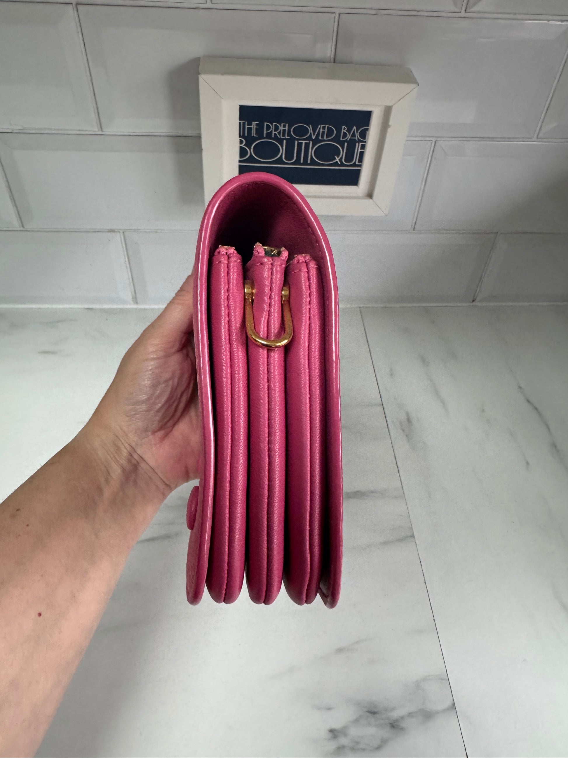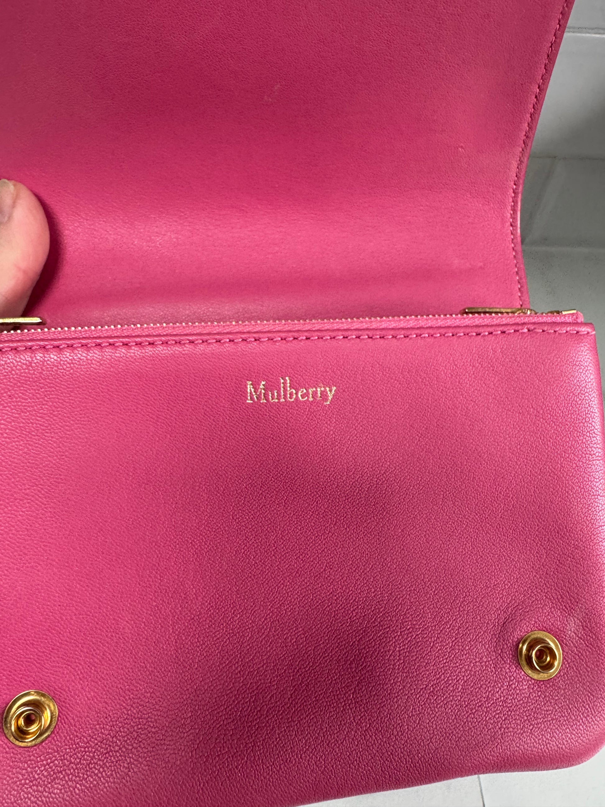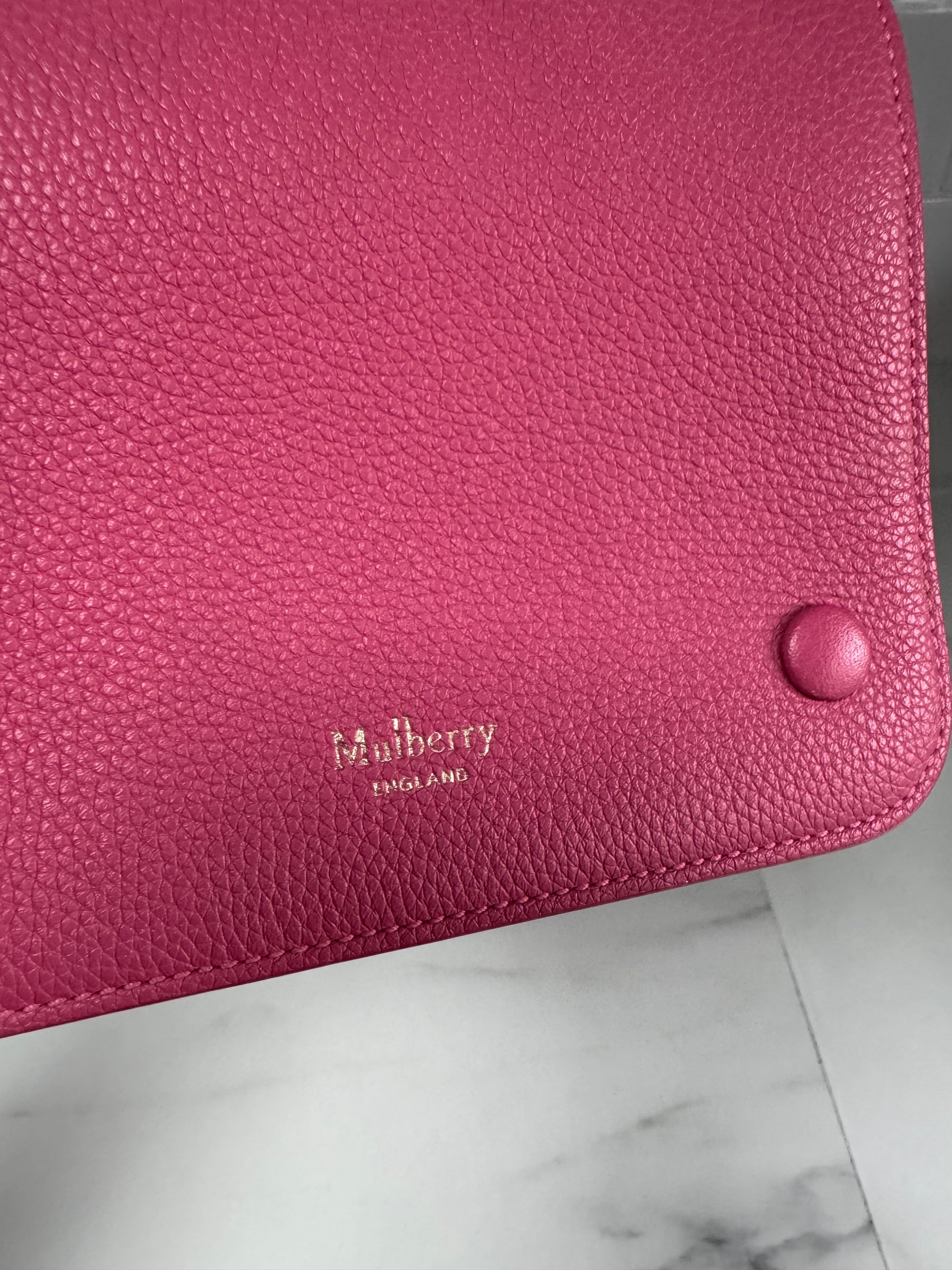 A lovely Mulberry Small Clifton in Candy Pink classic grain leather with gold tone hardware.