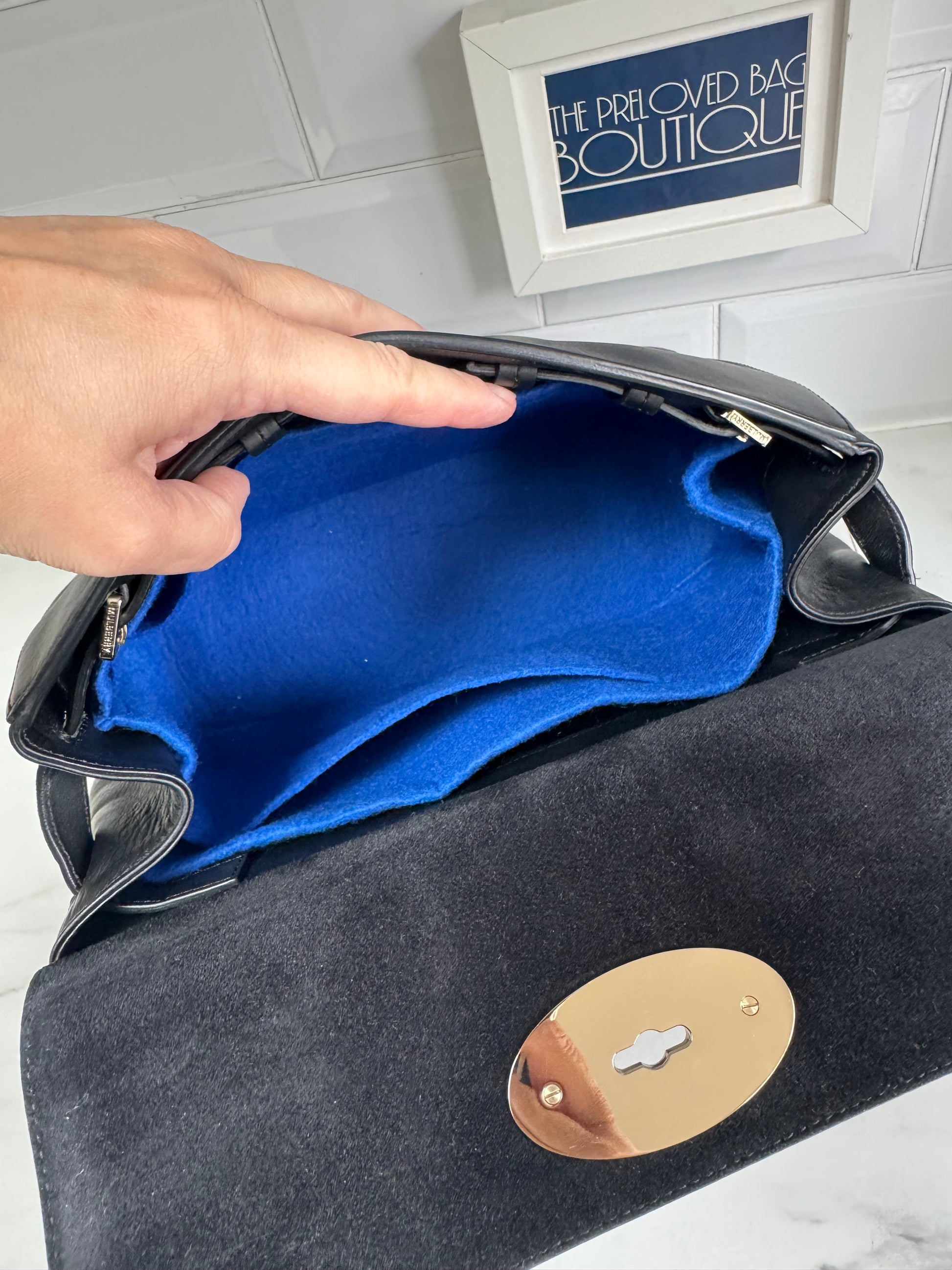 The top flap closes with a postmans lock closure and the long strap attaches via lobster clips to the rear. The interior is lined in black crossgrain fabric and there is a zipped pocket and a slip pocket inside as well as a slip pocket on the rear. The interior is spotless. This bag also comes with a beautiful electric blue bag liner to protect the inside.