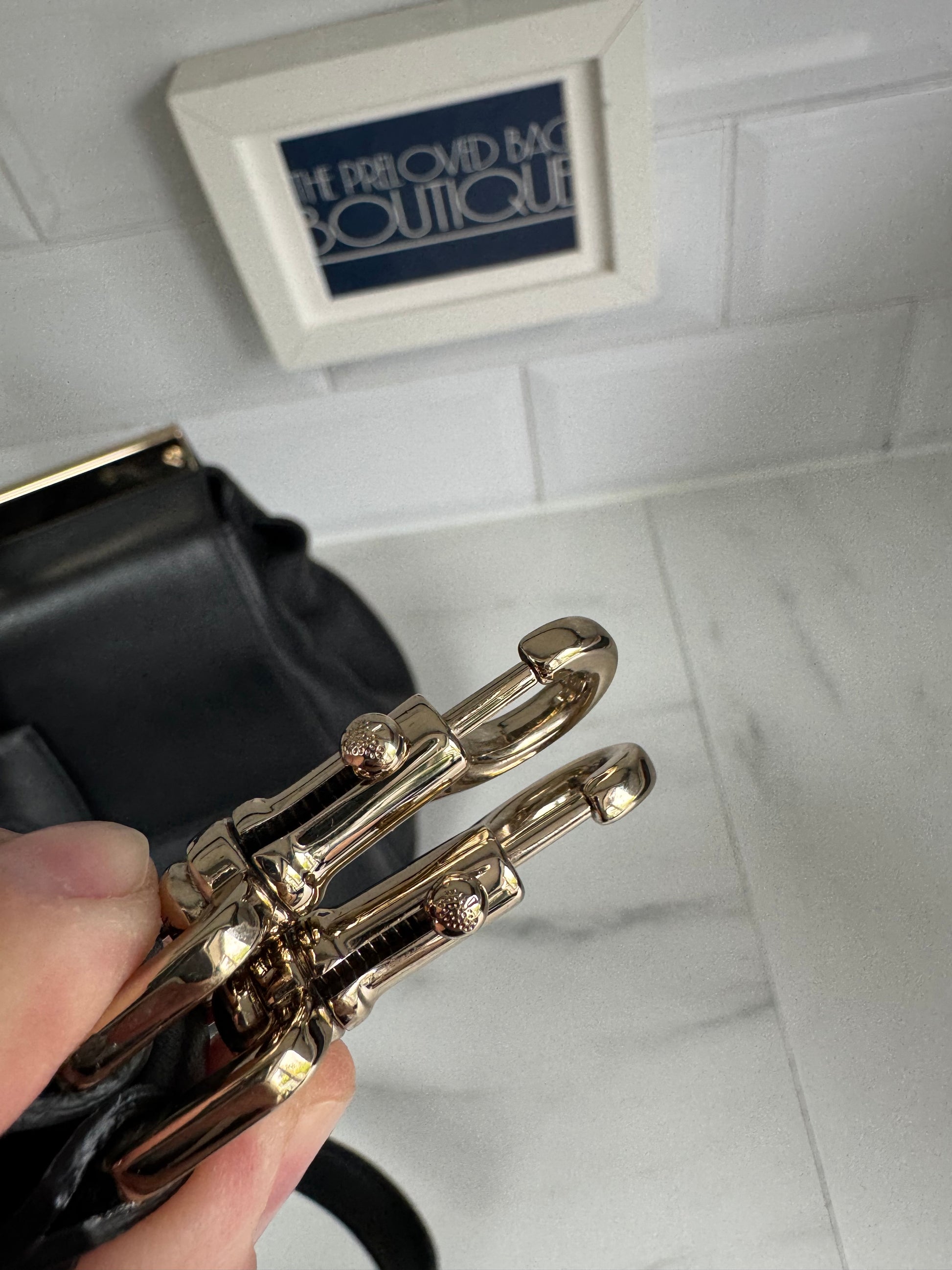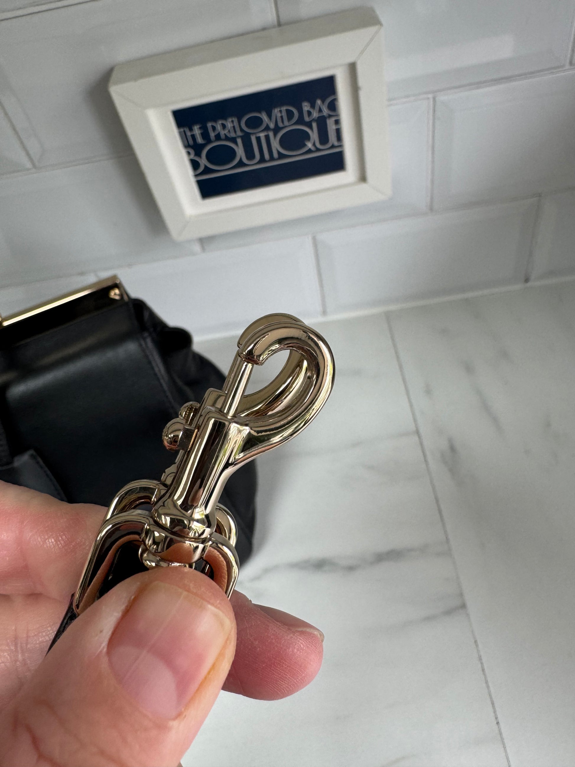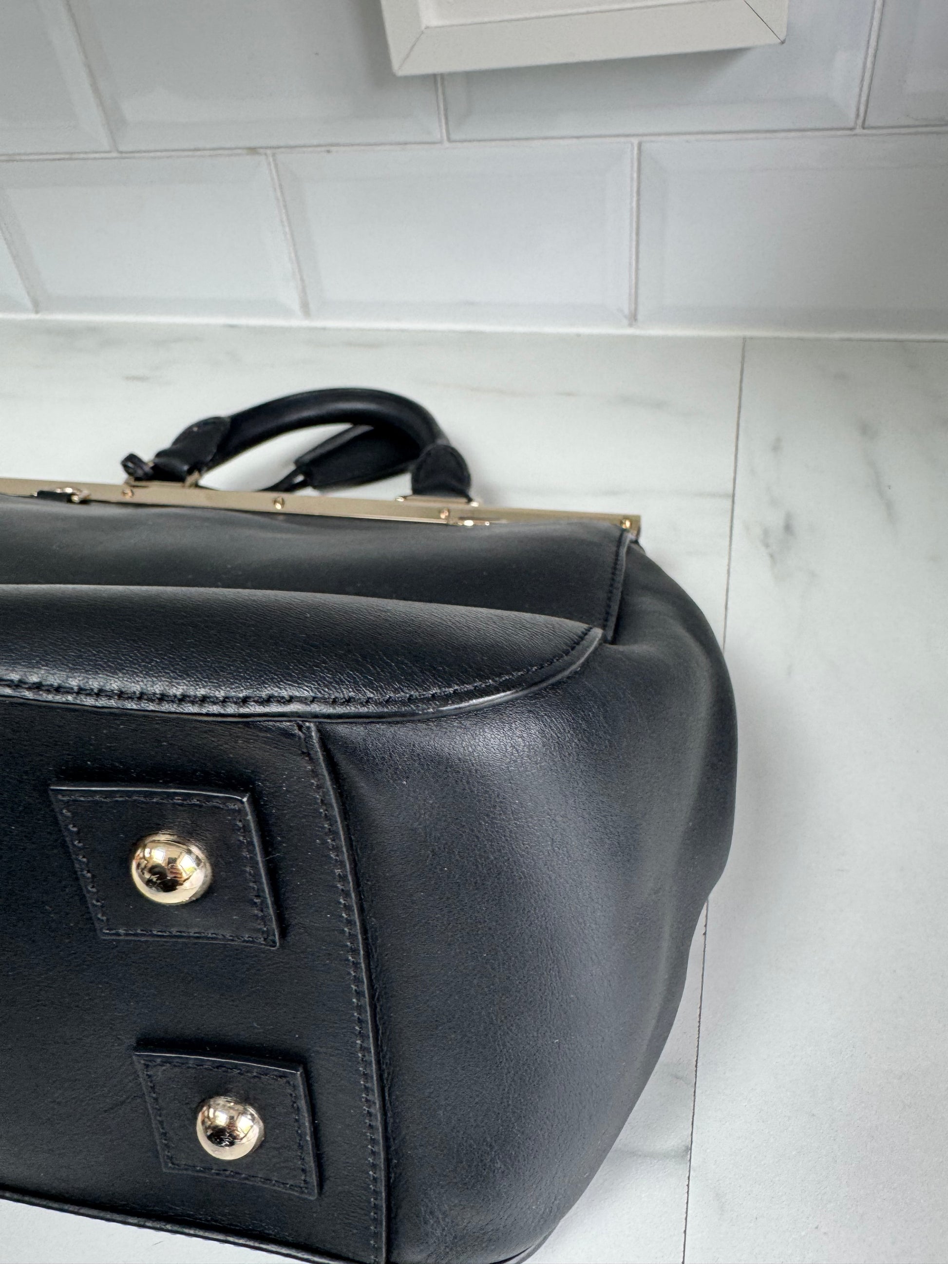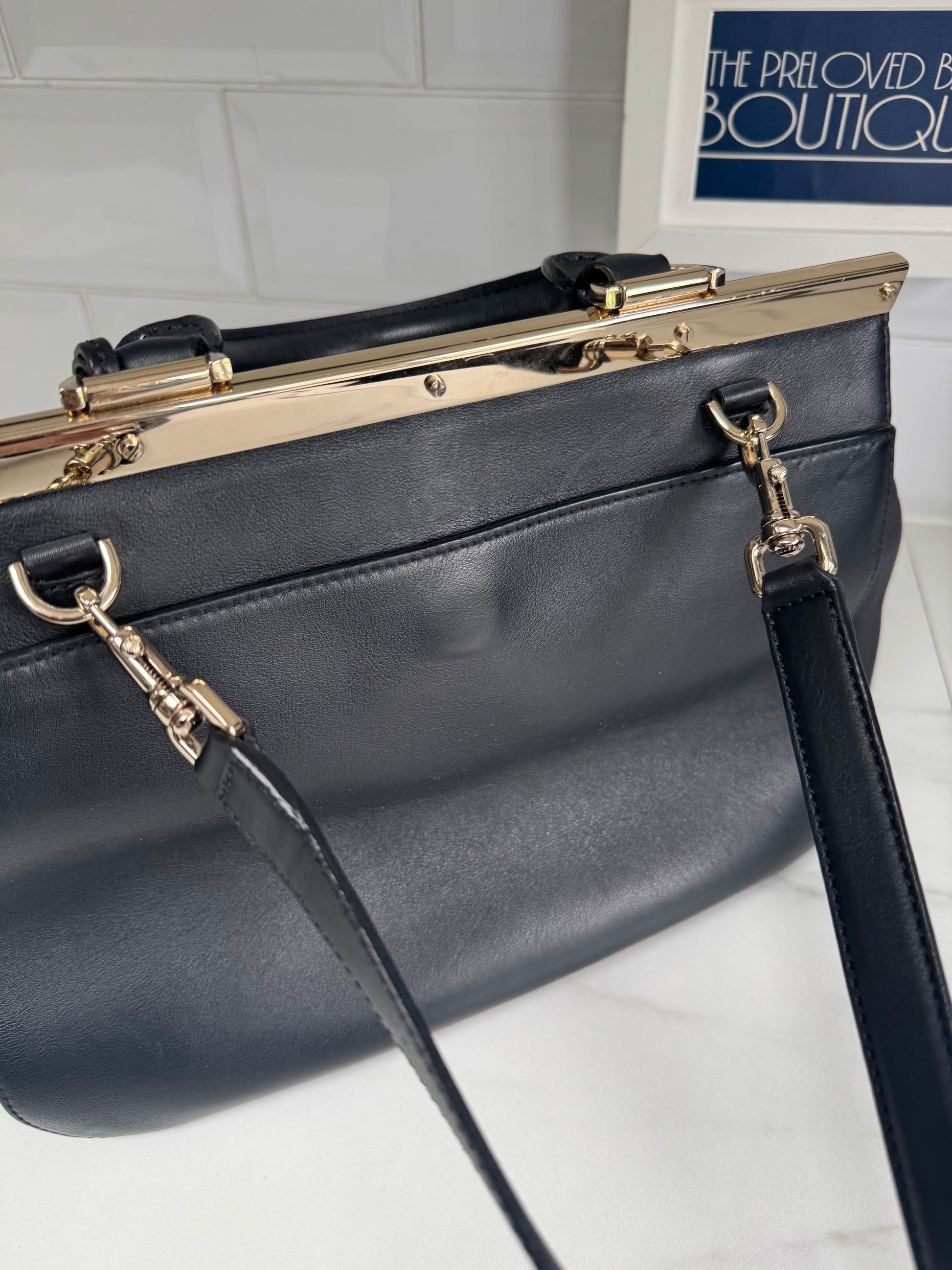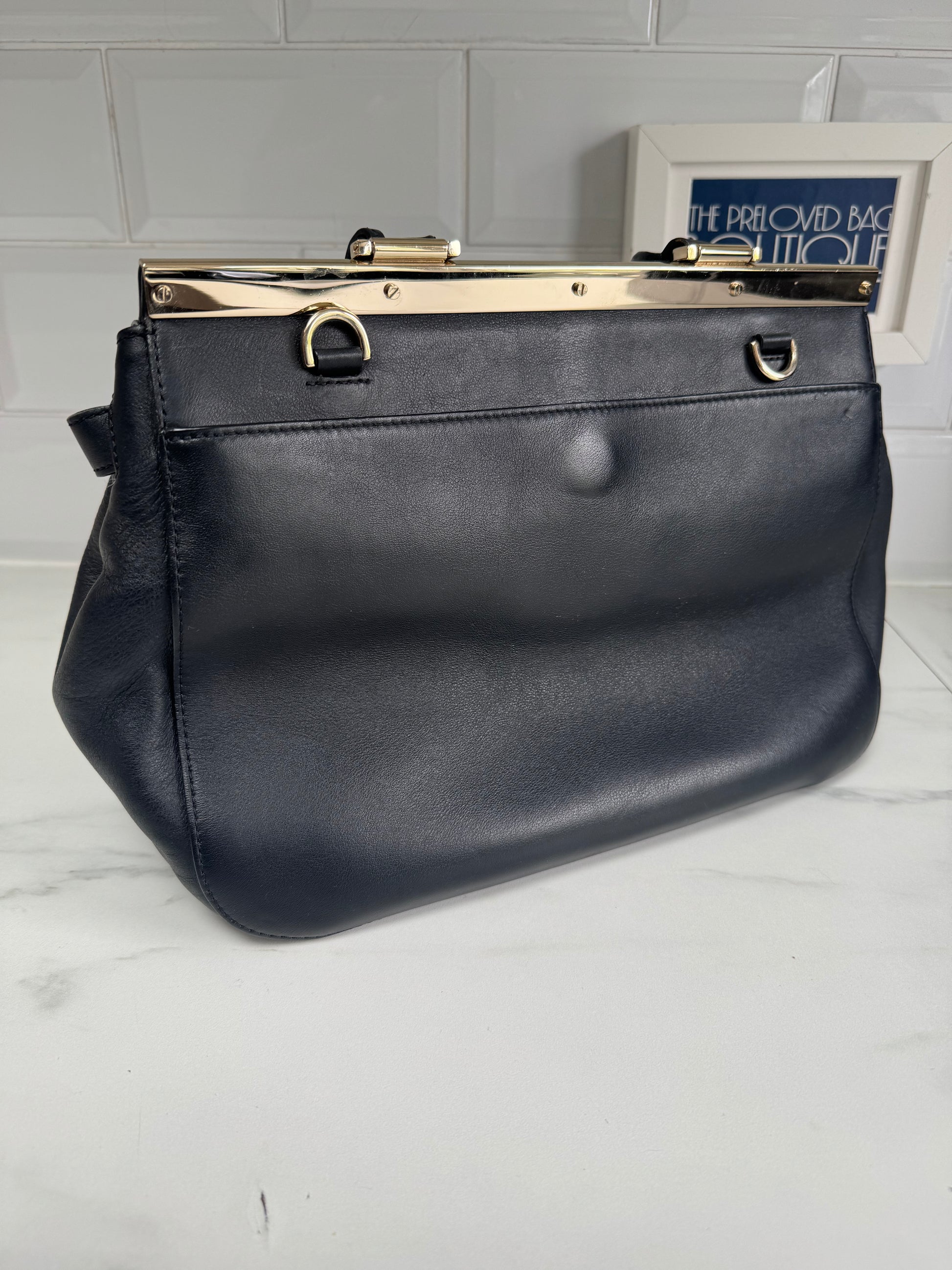 This bag is Preloved but in excellent condition. It can either be worn on your shoulder using the adjustable, detachable long strap, or carried by the top handle. The silhouette is reminiscent of an old style doctors bag. It is simple yet stylish. Such a gorgeous bag and you definitely do not see many of these around.