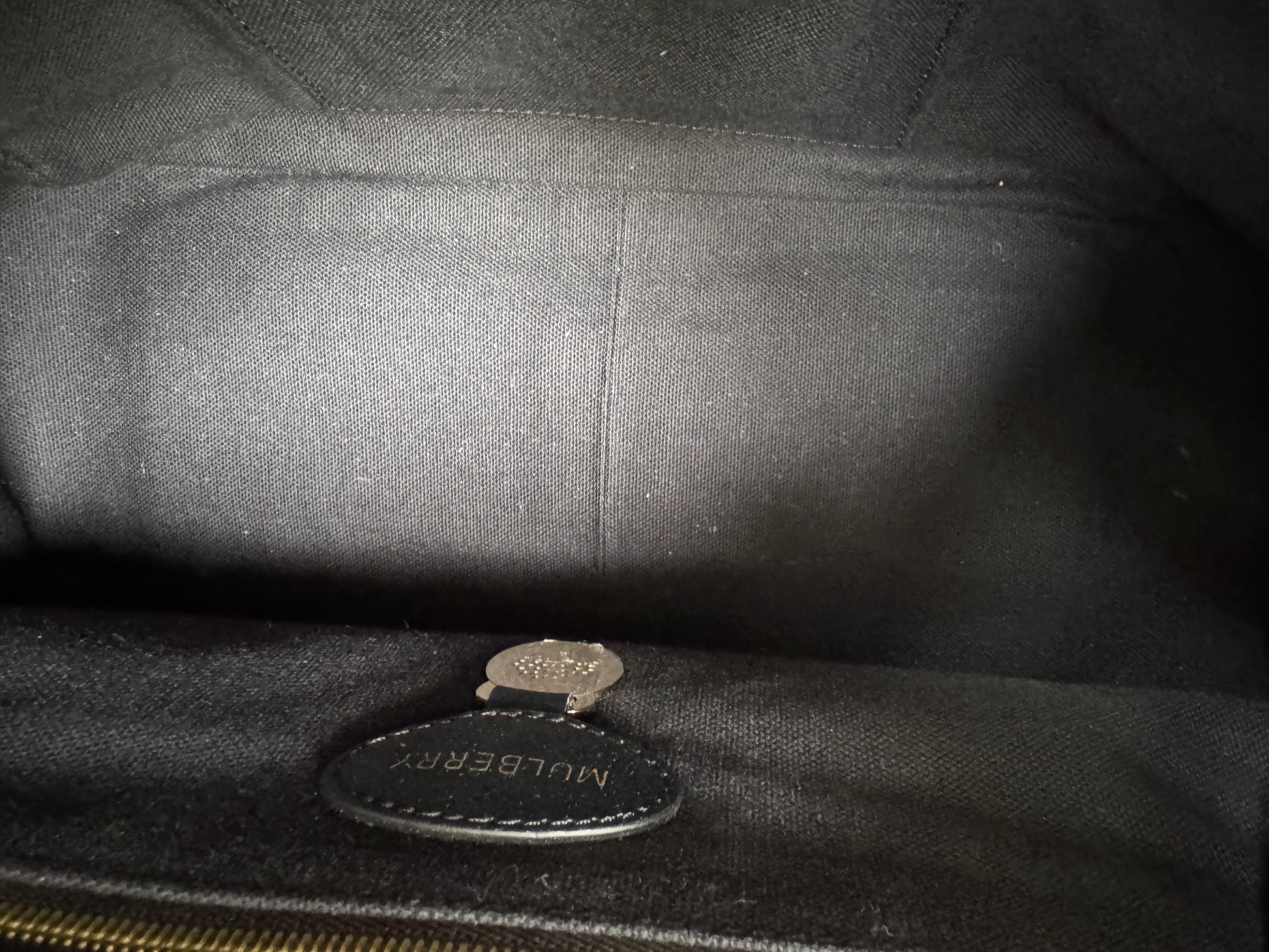 This is a lovely Mulberry Small Suffolk in Black Silky Classic Calf Leather with shiny light gold tone hardware.