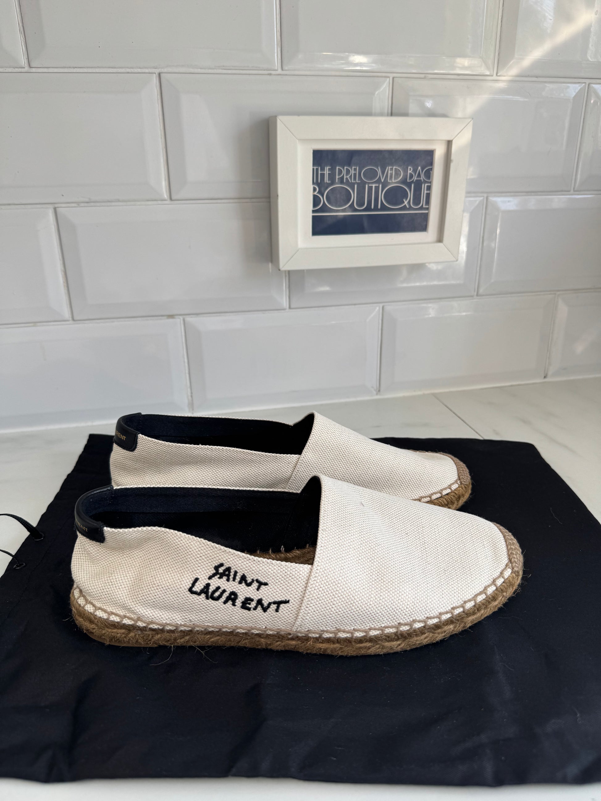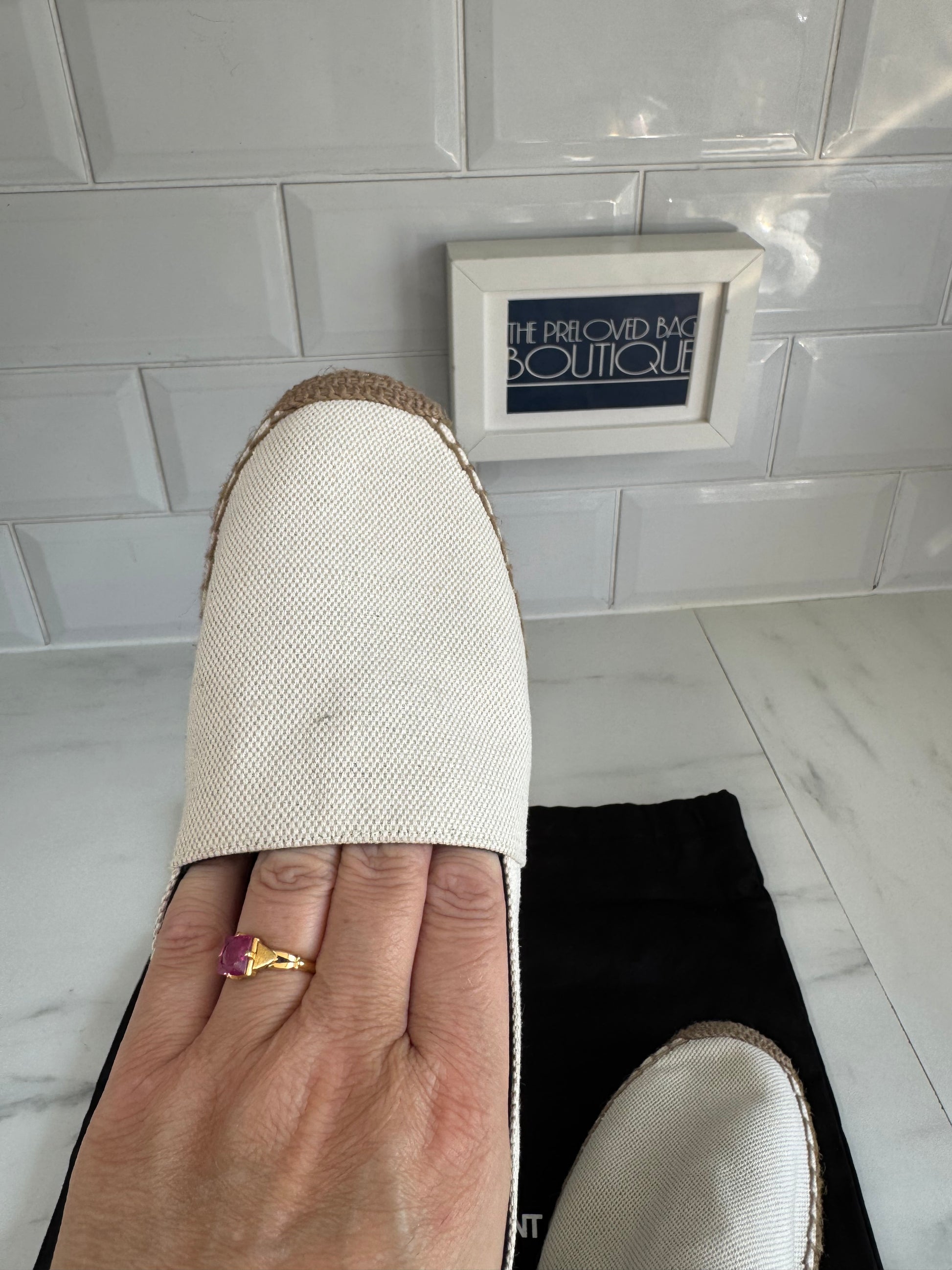 These are an absolute wardrobe staple. Saint Laurent espadrilles in cream cotton featuring a closed toe and rubber sole for comfortable all-day wear.