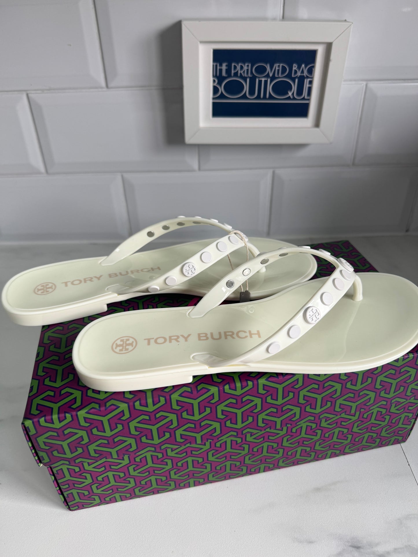 They are a Preloved item but have never been worn.They are AS NEW condition.Matte metal studs are embellished across the upper straps alongside discreet branding. These benefit from a non-slip outsole and arefully waterproof.The outlier sole is rubber. Perfect for round the pool or walks on the beach!