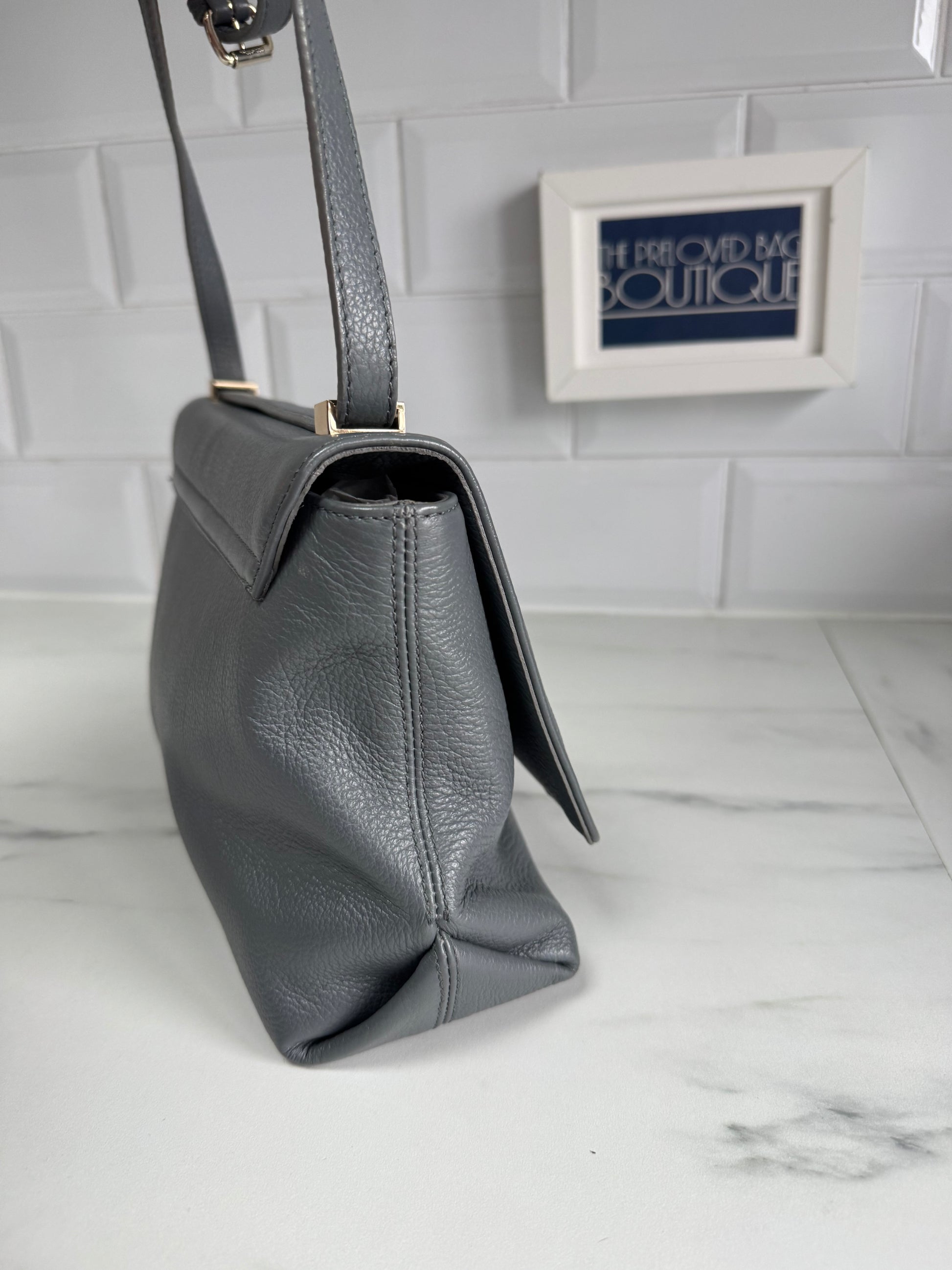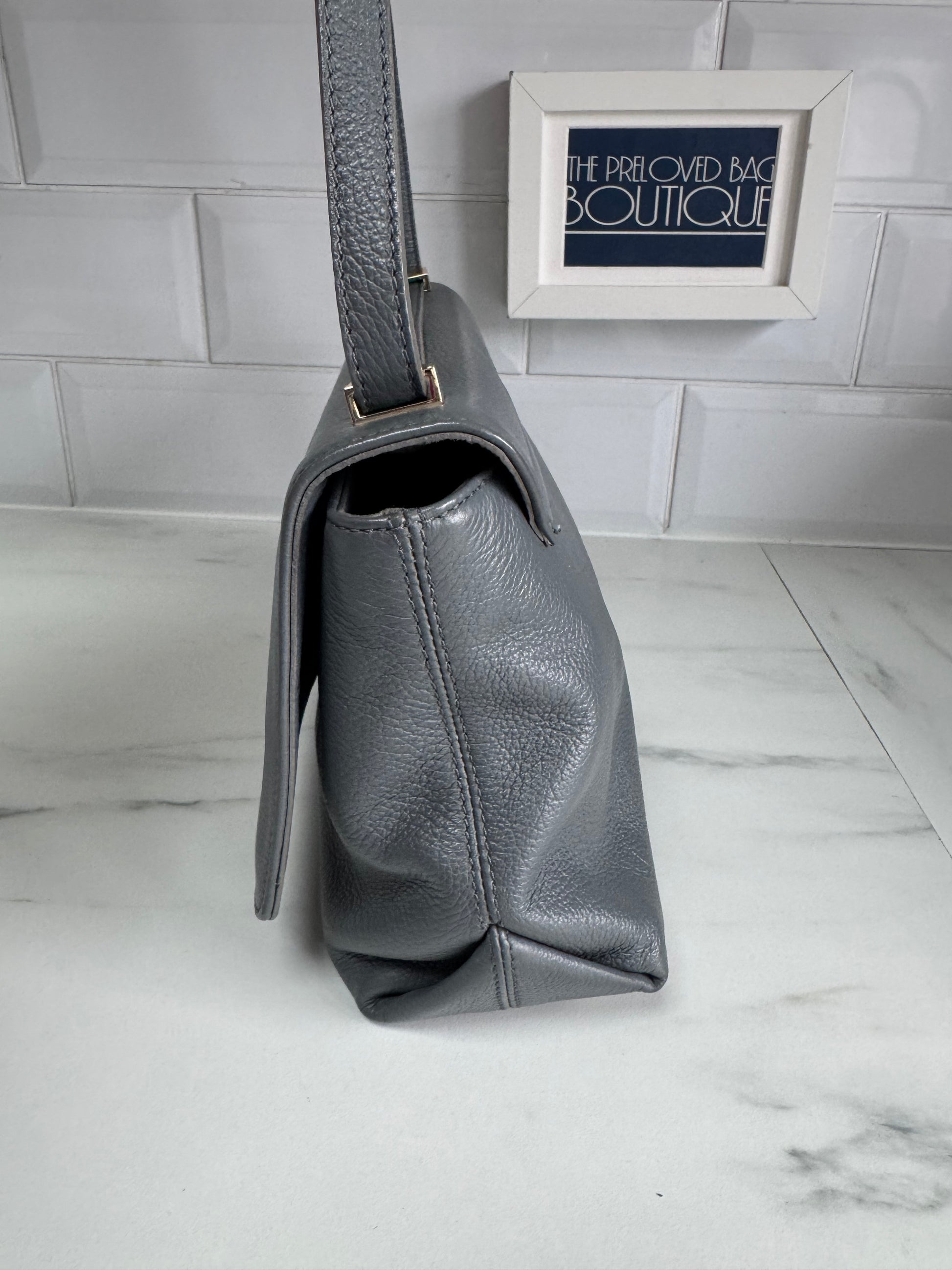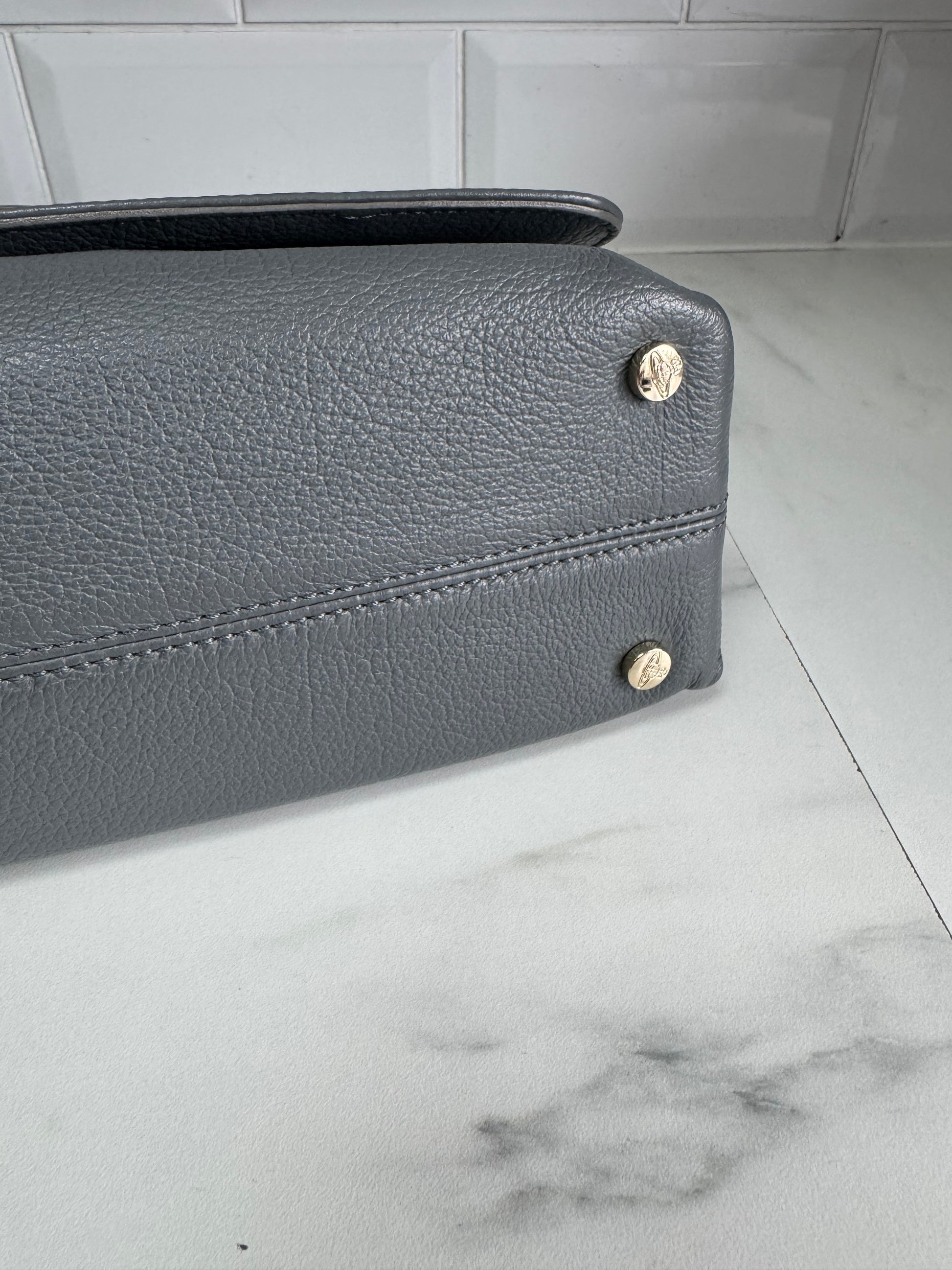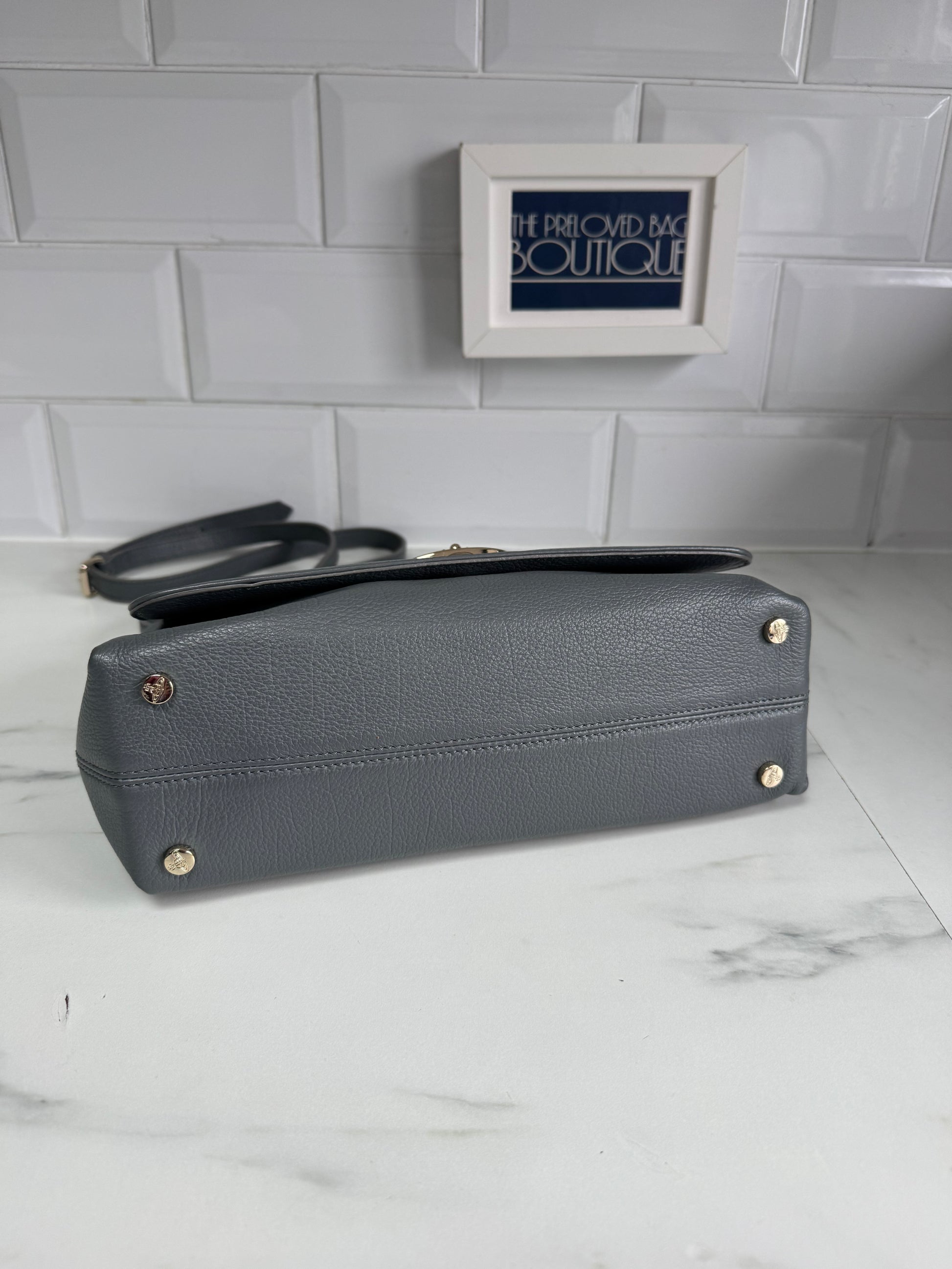 This Vivienne Westwood Balmoral shoulder bag is crafted from a charcoal Grey saffiano Leather finished with light gold tone hardware.