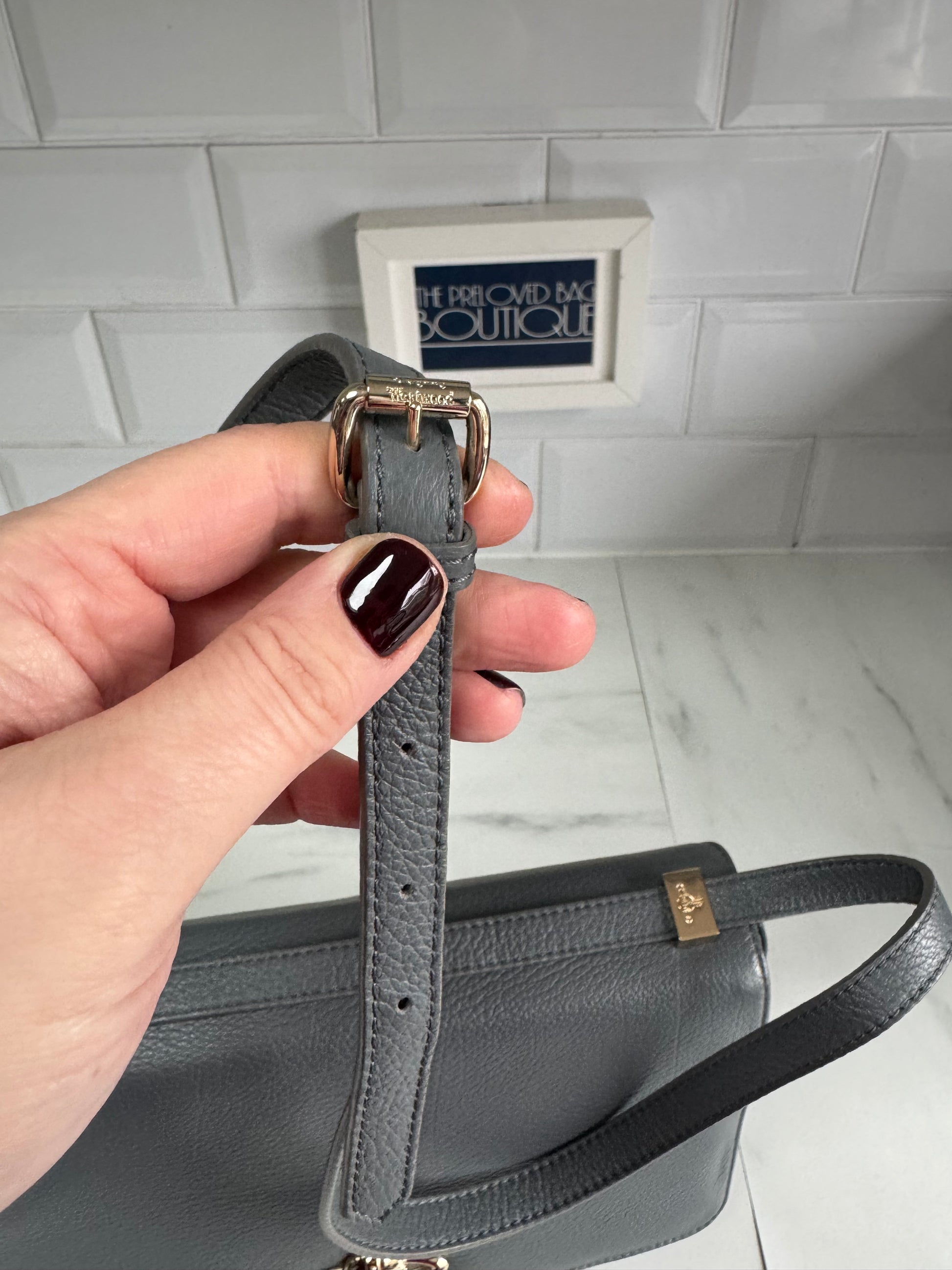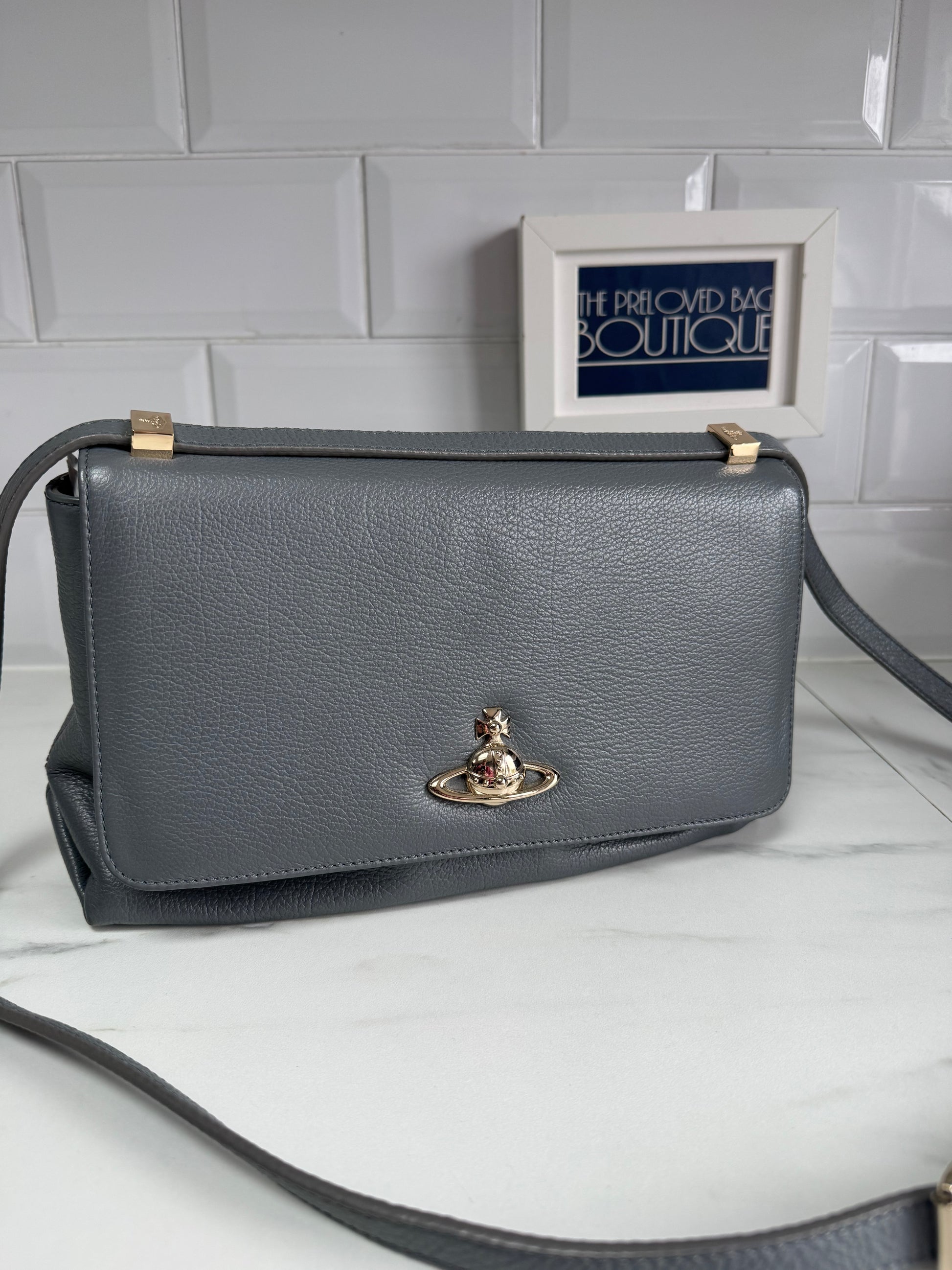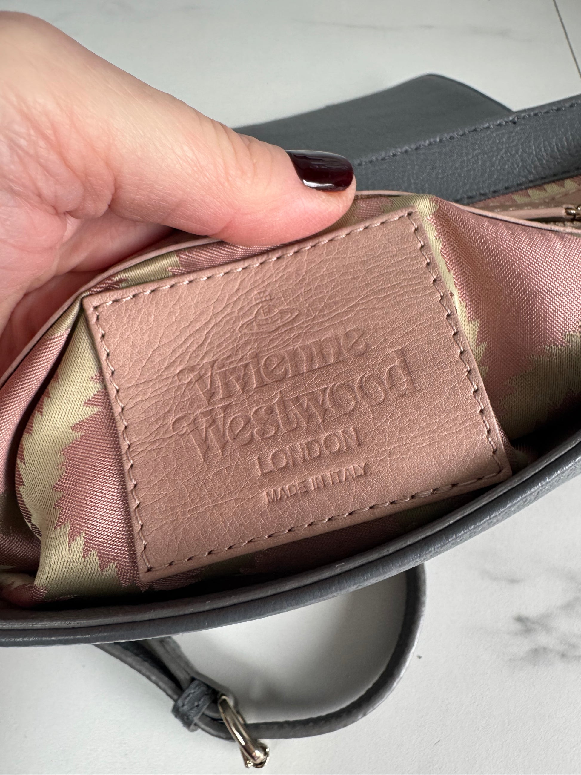 It is a Preloved bag but in excellent condition.It features the Vivienne Westwood Orb logo on the front of the top flap and has a long leather adjustable strap which enables you to wear it on the shoulder or as a cross body.The interior has a zip pocket and a slip pocket and is lined in a pink and cream decorated nylon.It is spotless!