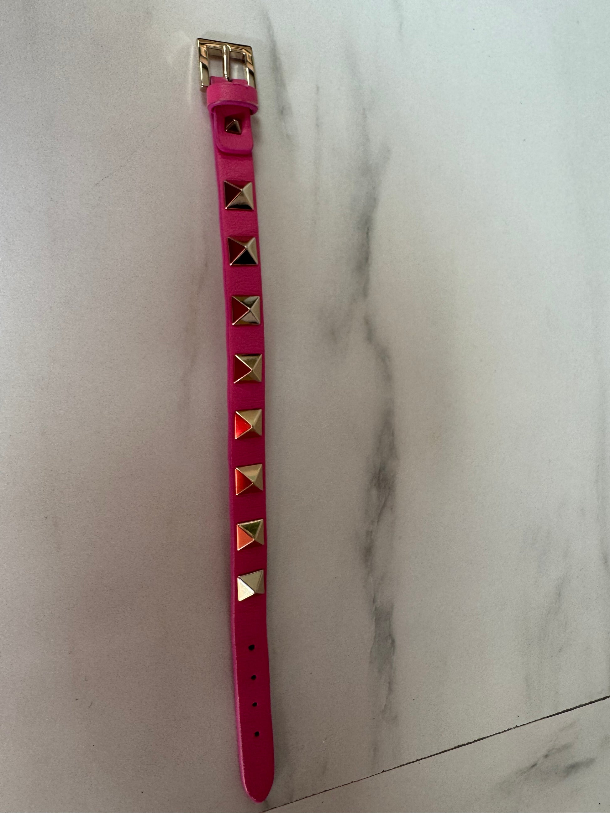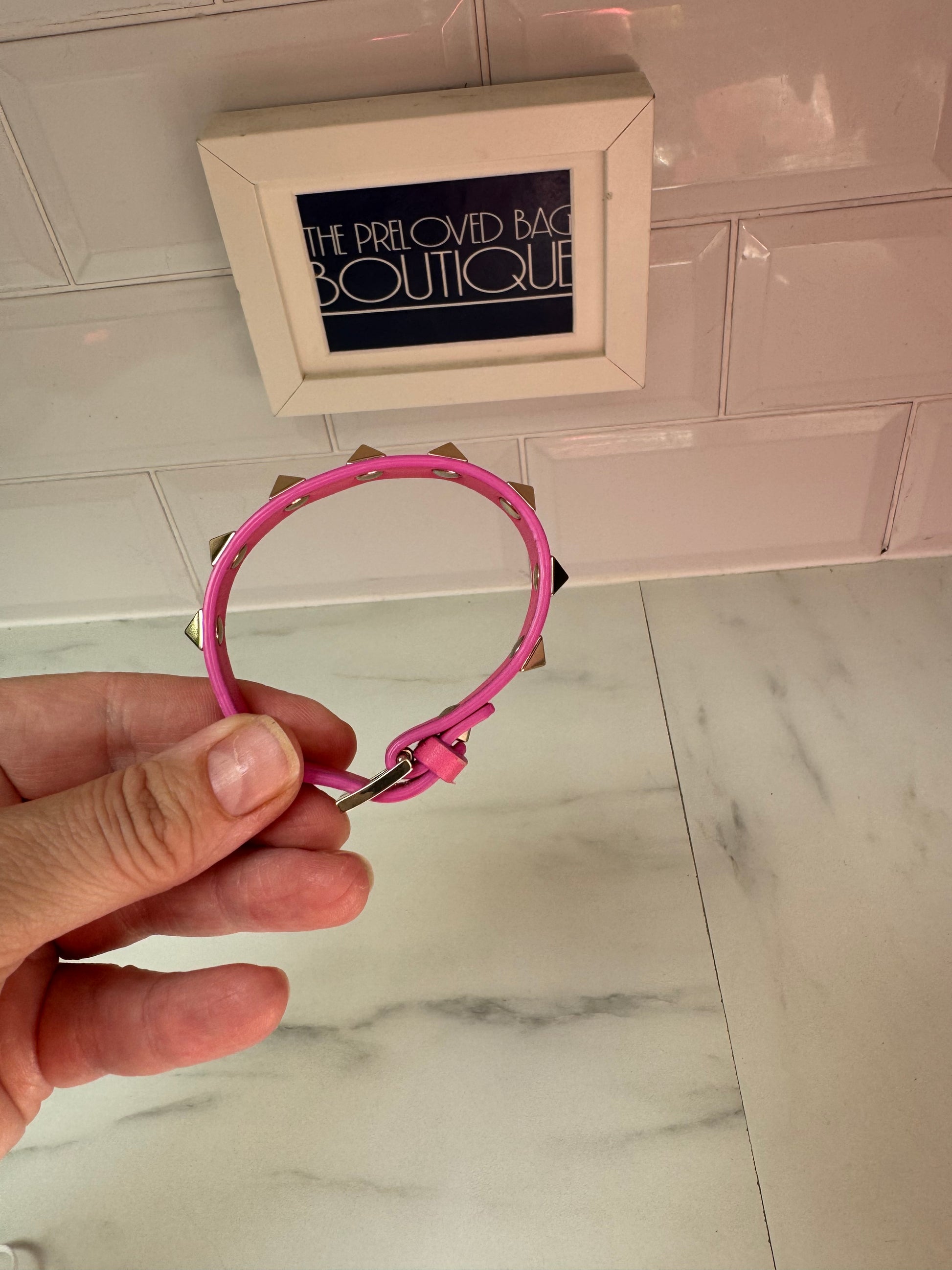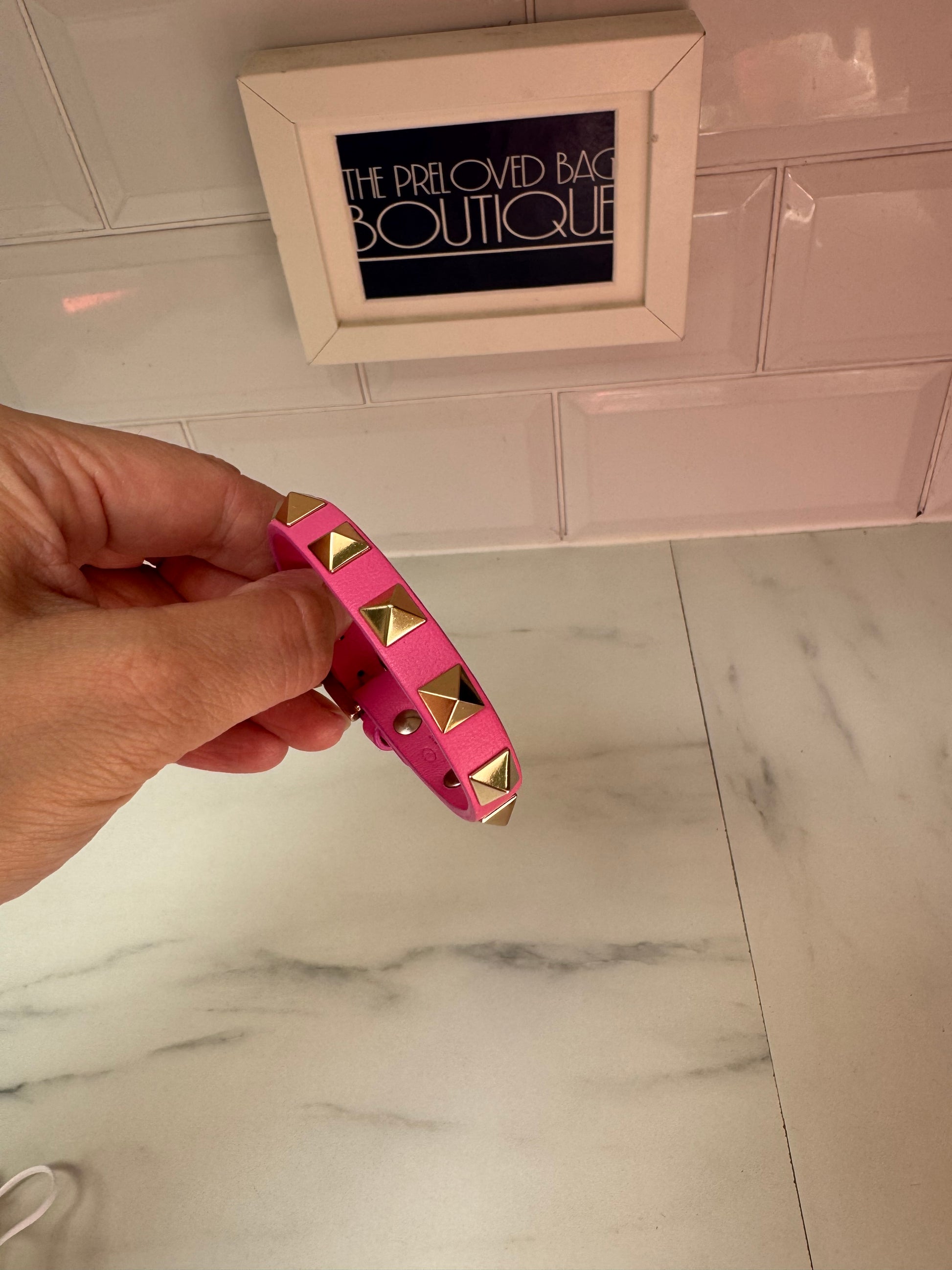 This item is Preloved but in excellent to AS NEW condition.This stylish bracelet is a composed of thick hot pink calfskin leather and is lined with golden brass pyramid studs with a golden brass buckle. This is an excellent bracelet with classic chic that you can only get from Valentino!