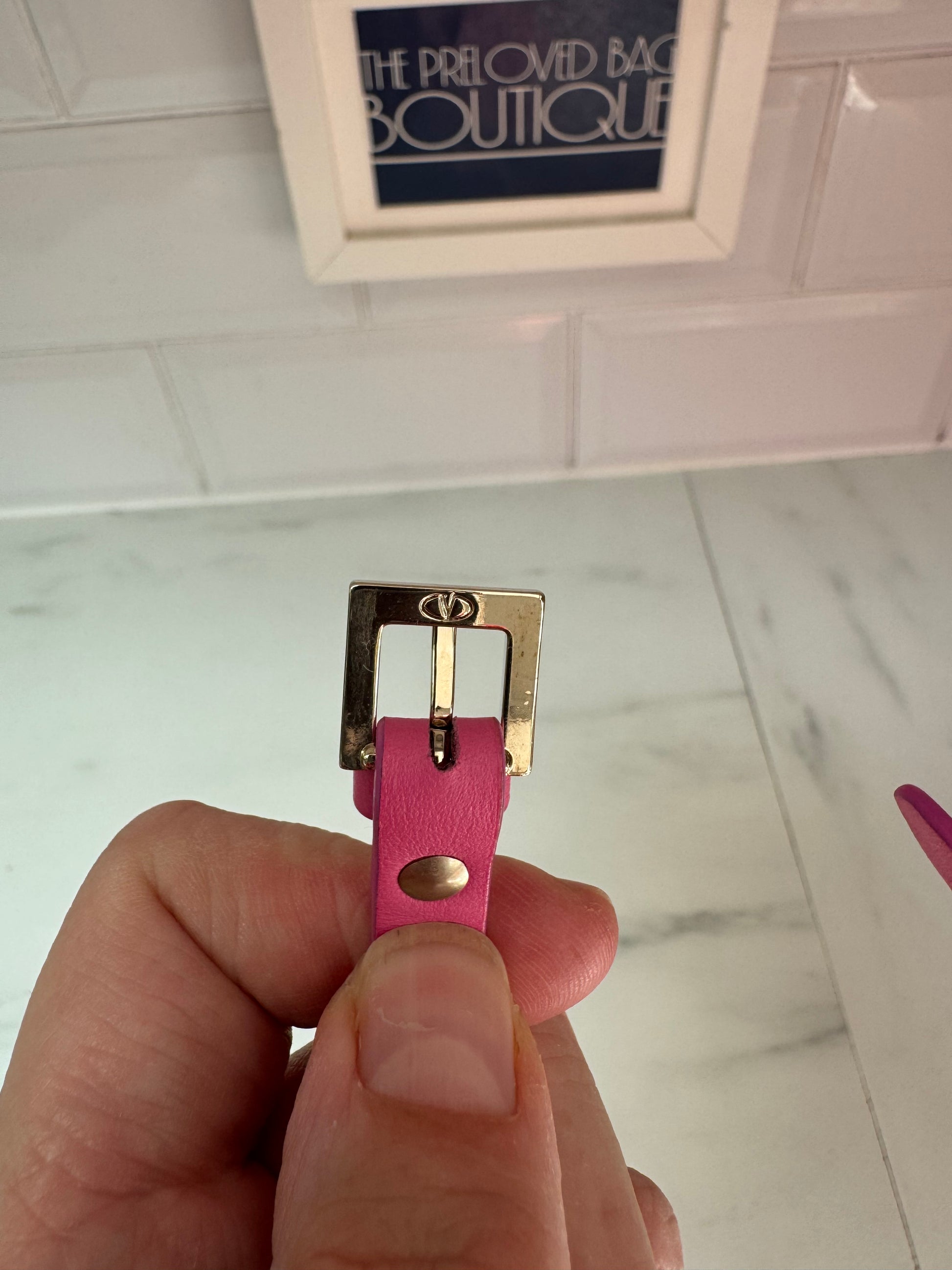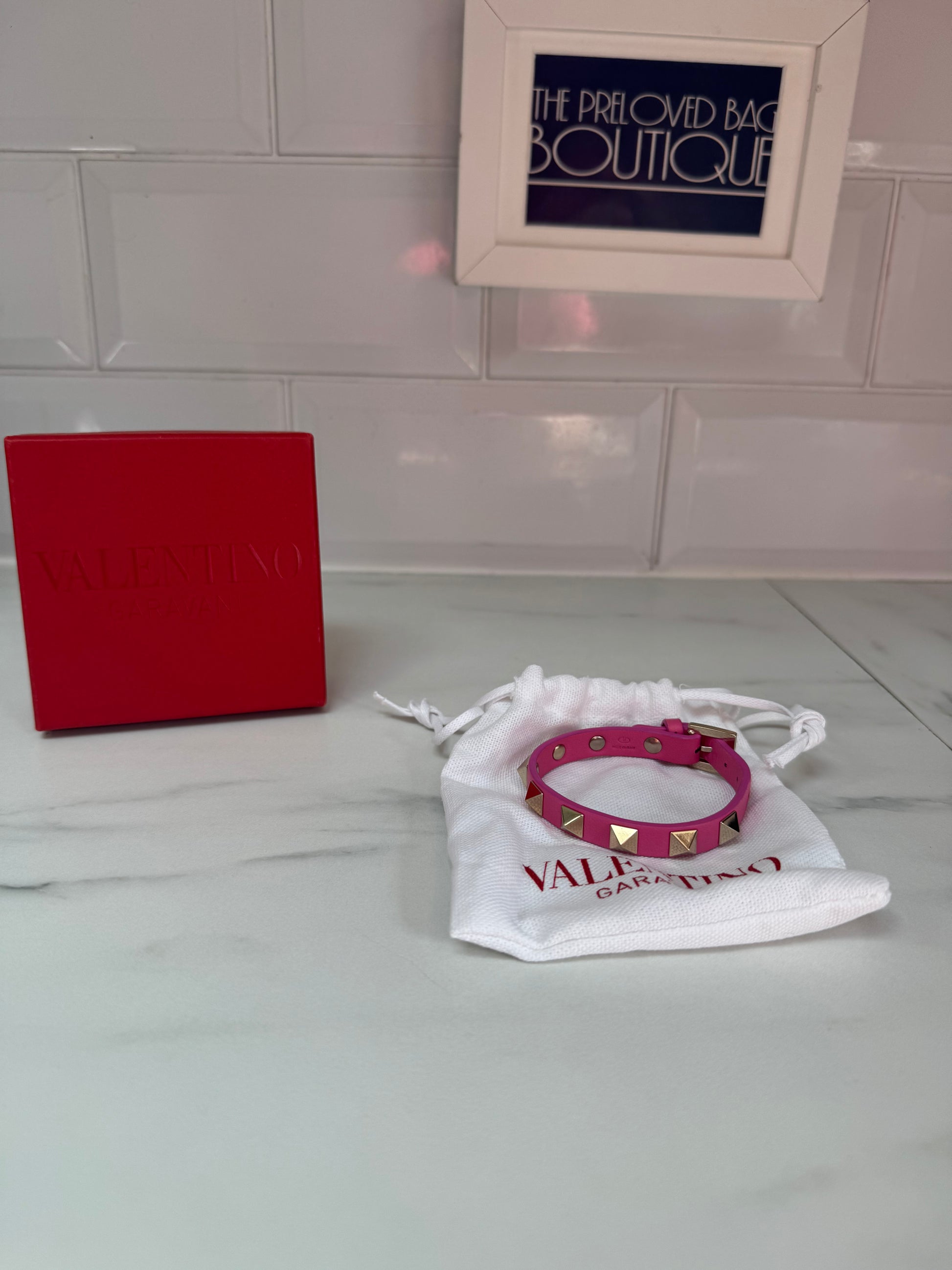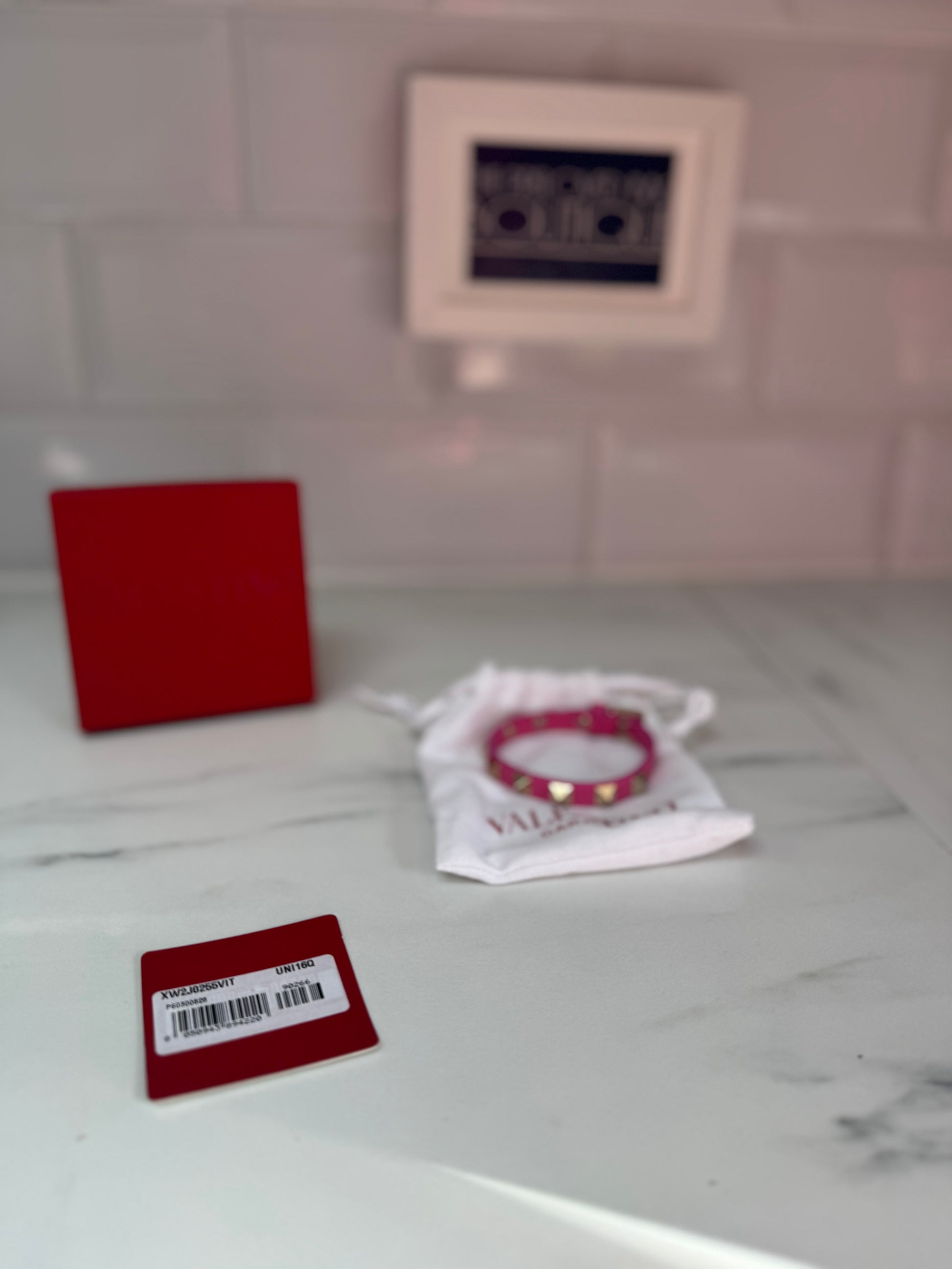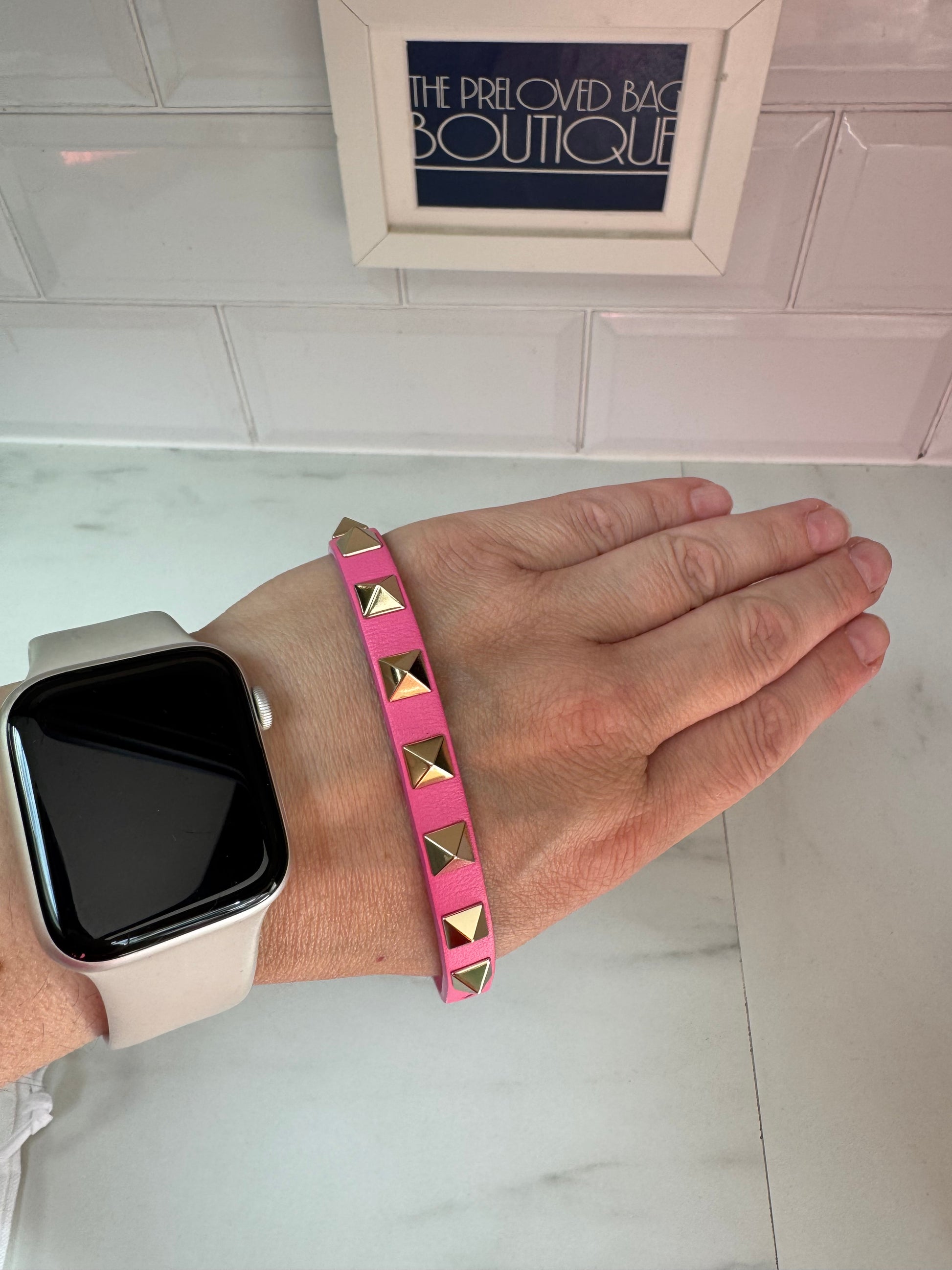 This item is Preloved but in excellent to AS NEW condition.This stylish bracelet is a composed of thick hot pink calfskin leather and is lined with golden brass pyramid studs with a golden brass buckle. This is an excellent bracelet with classic chic that you can only get from Valentino!